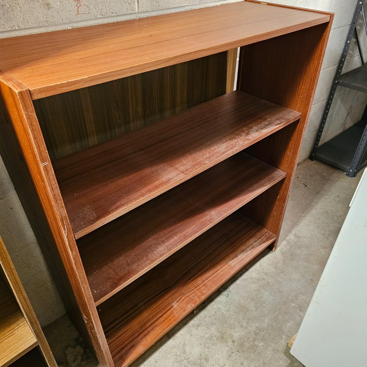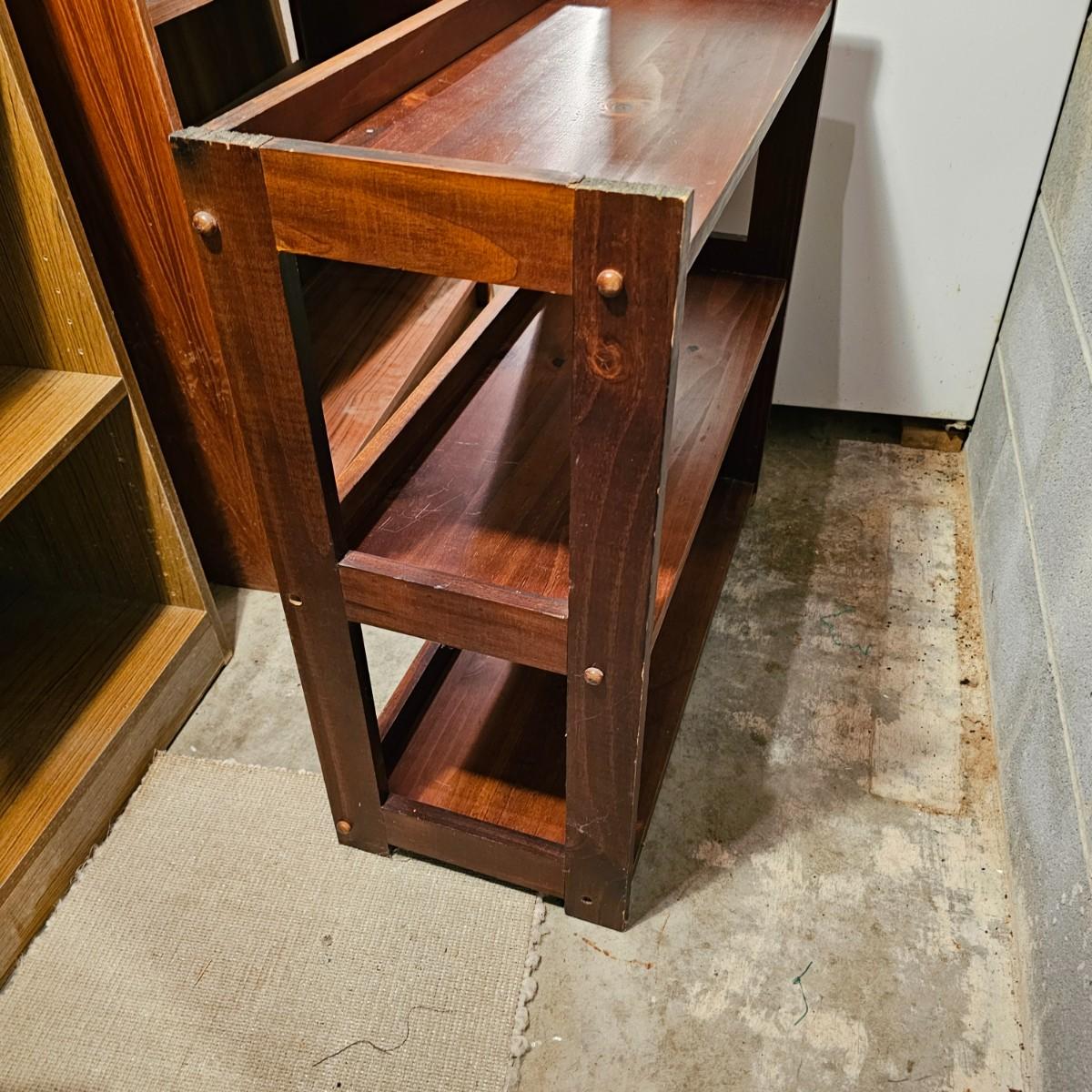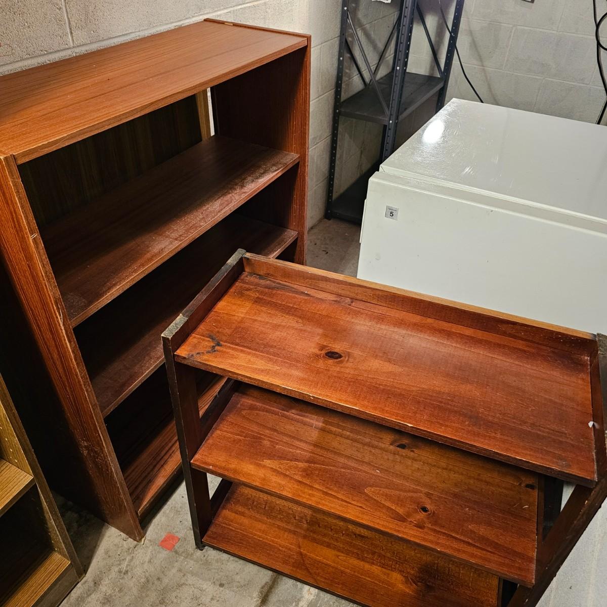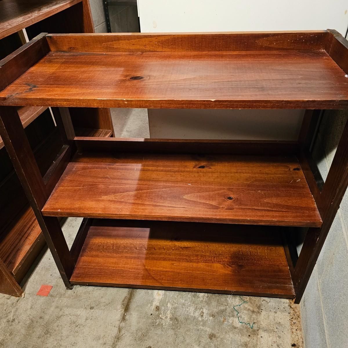A pair of wooden shelves, one tall, one short. Tall set has three shelves, it measures 26"W x 12"D x 40"H. Back panel needs reattached, so is a bit wobbly. Smaller set has two shelves, and measures 29"W x 12"D x 28"H. Some light scratches on both. See photos for details. Local pickup only. Winning bidder must bring assistance to help move and load this item due to its weight and/or size. This item is located in the basement with a flight of stairs or alternatively a garden path with approximately 15 steps that can be used to go around the side of the house. Winning buyer must take both.
