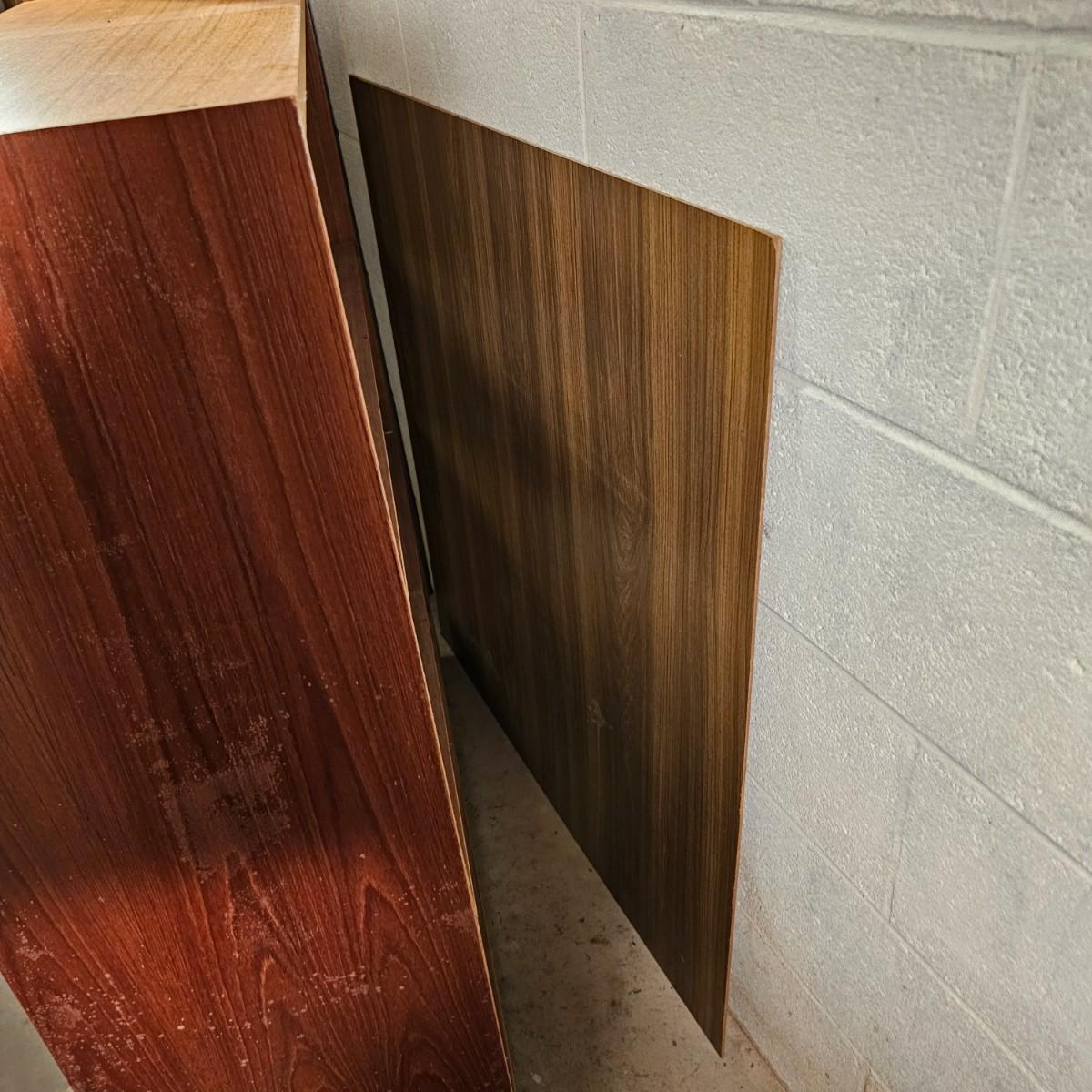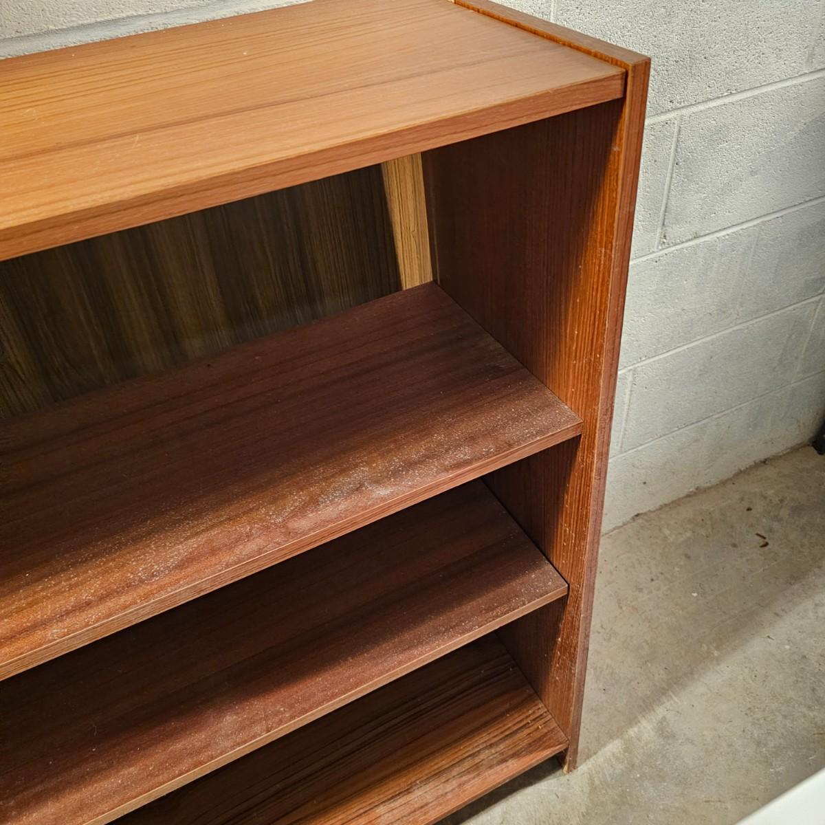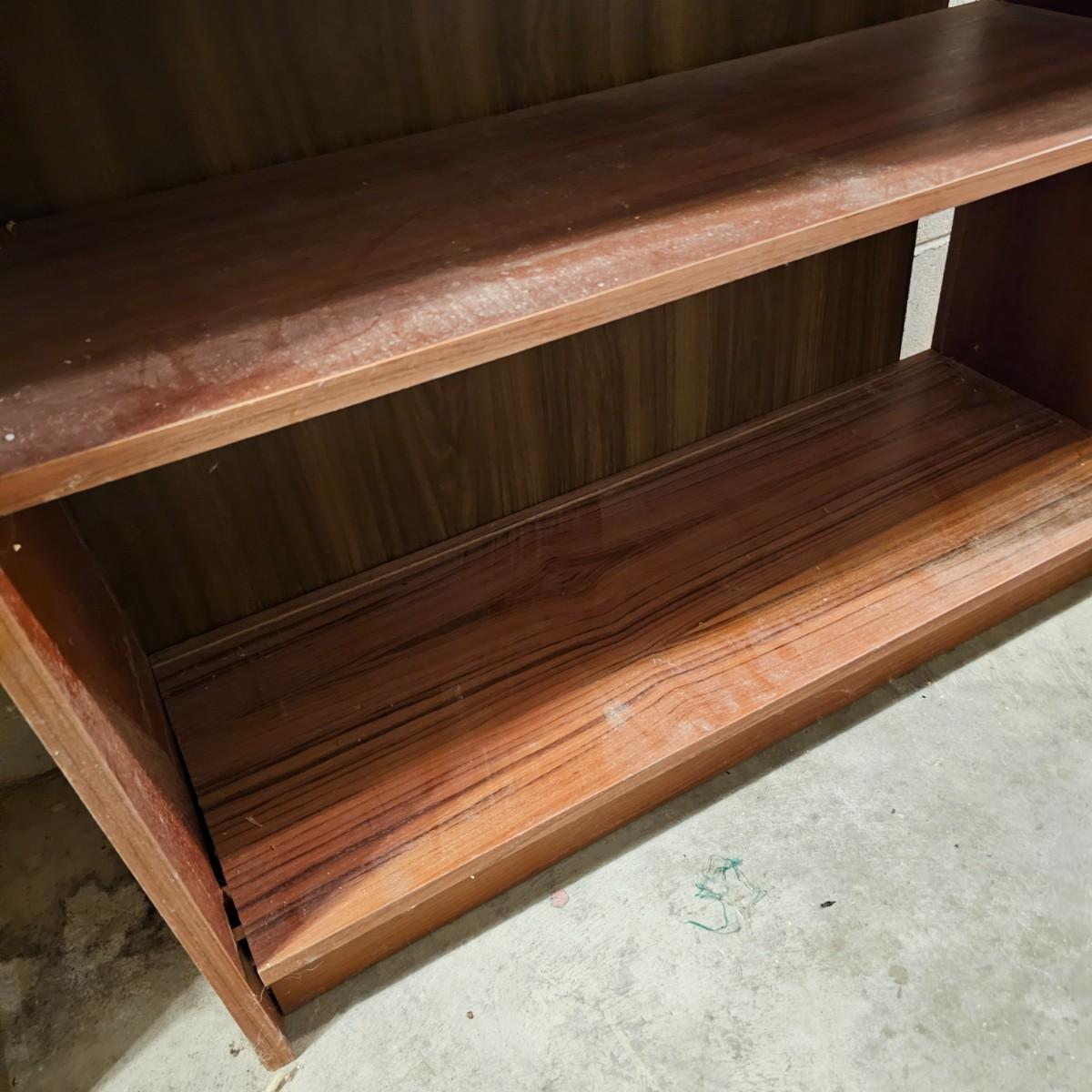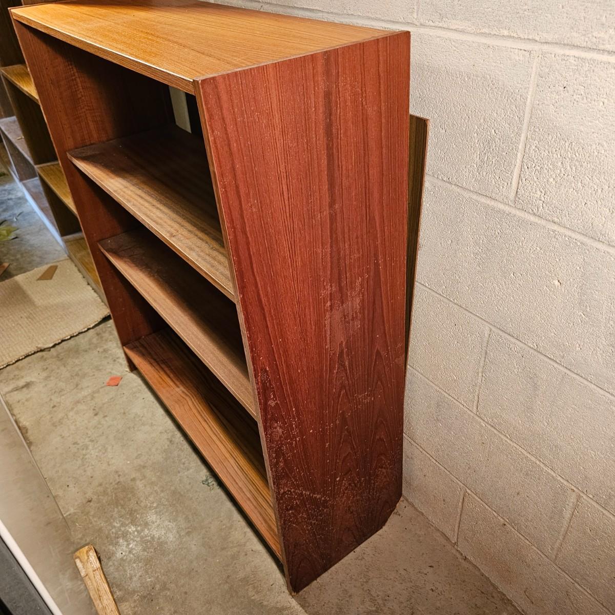 A pair of wooden shelves, one tall, one short. Tall set has three shelves, it measures 26"W x 12"D x 40"H. Back panel needs reattached, so is a bit wobbly. Smaller set has two shelves, and measures 29"W x 12"D x 28"H. Some light scratches on both. See photos for details. Local pickup only. Winning bidder must bring assistance to help move and load this item due to its weight and/or size. This item is located in the basement with a flight of stairs or alternatively a garden path with approximately 15 steps that can be used to go around the side of the house. Winning buyer must take both.
