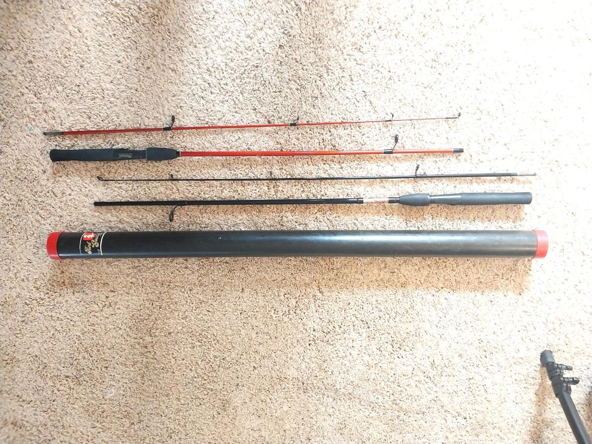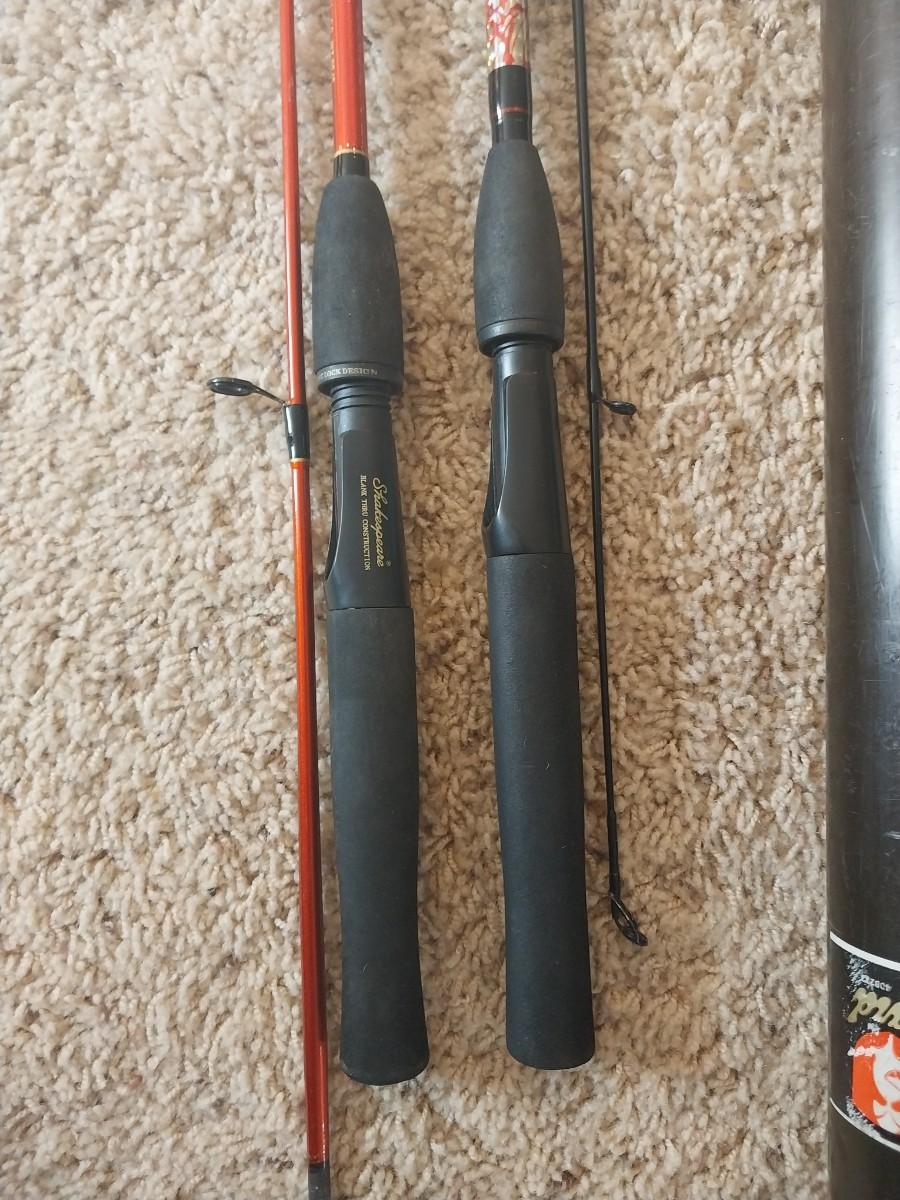 TWO SHAKESPEARE FISHING RODS IN TUBE HOLDER