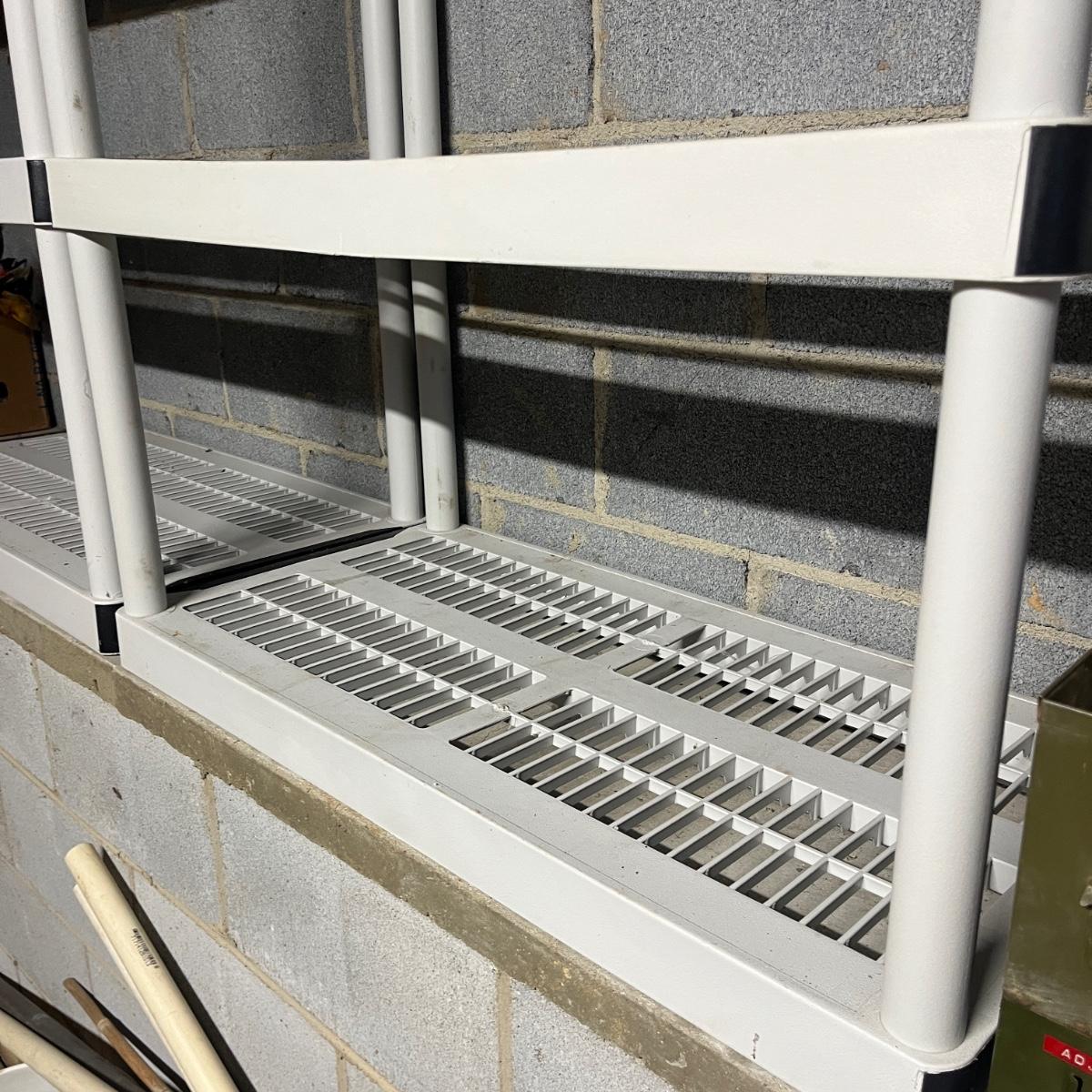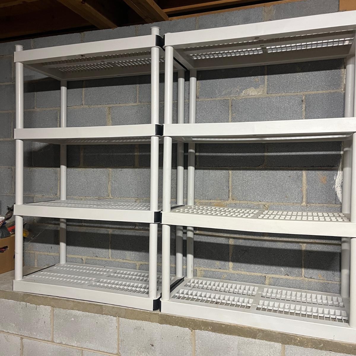Lot includes two plastic shelving units each with four shelves. Units come apart for easy transport. Units measures 18” x 36” x 57”H.