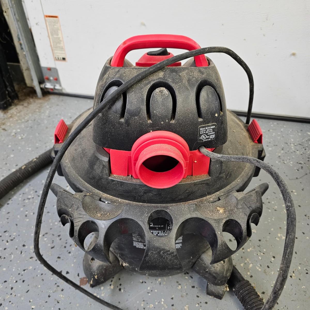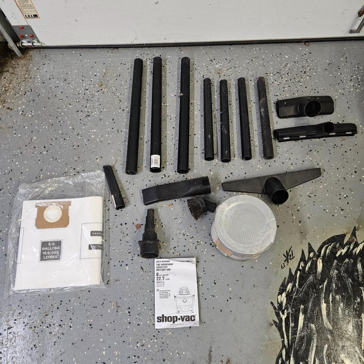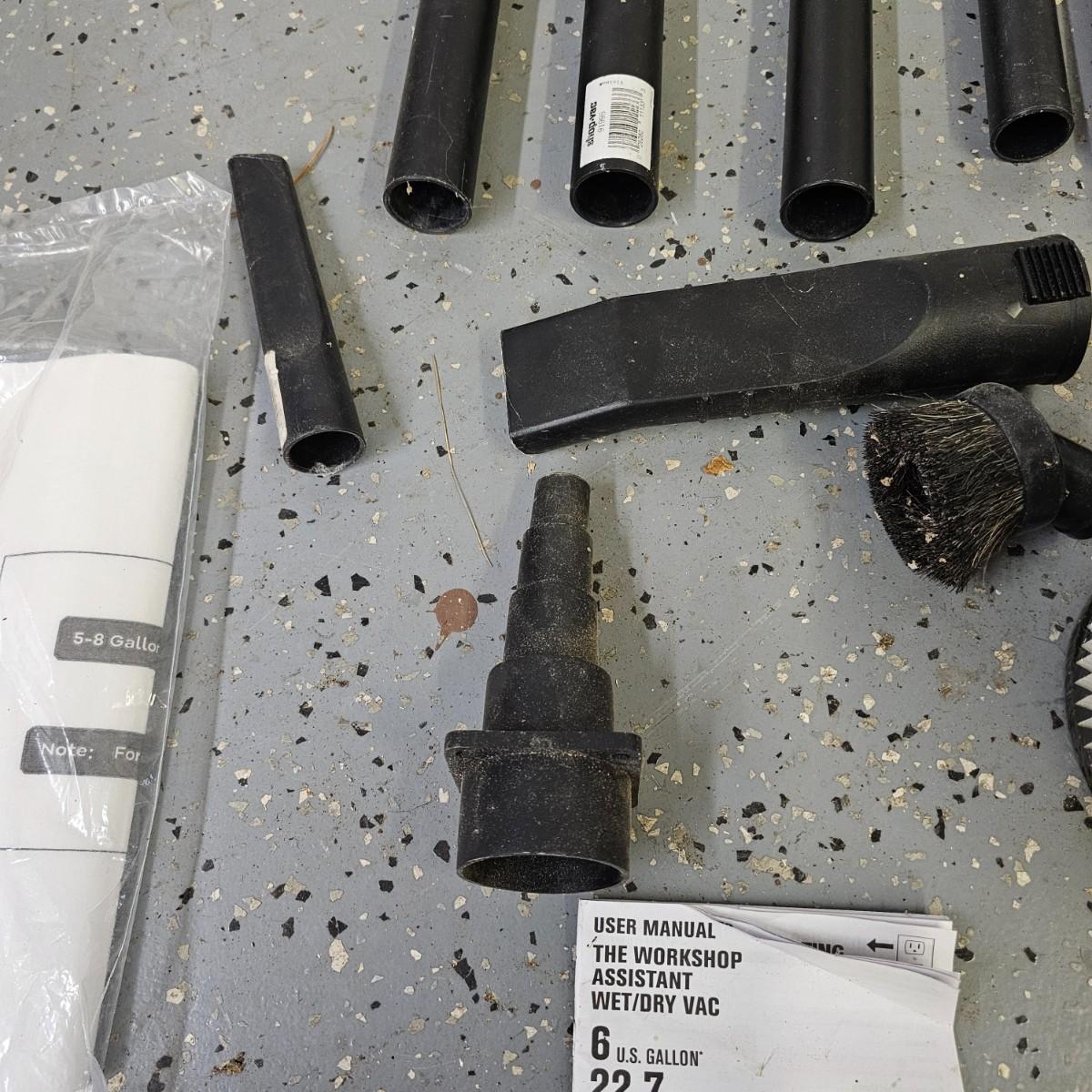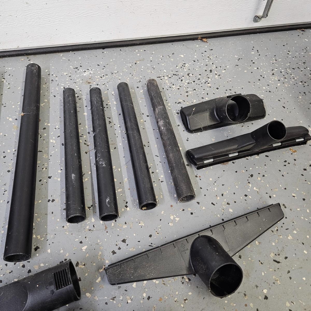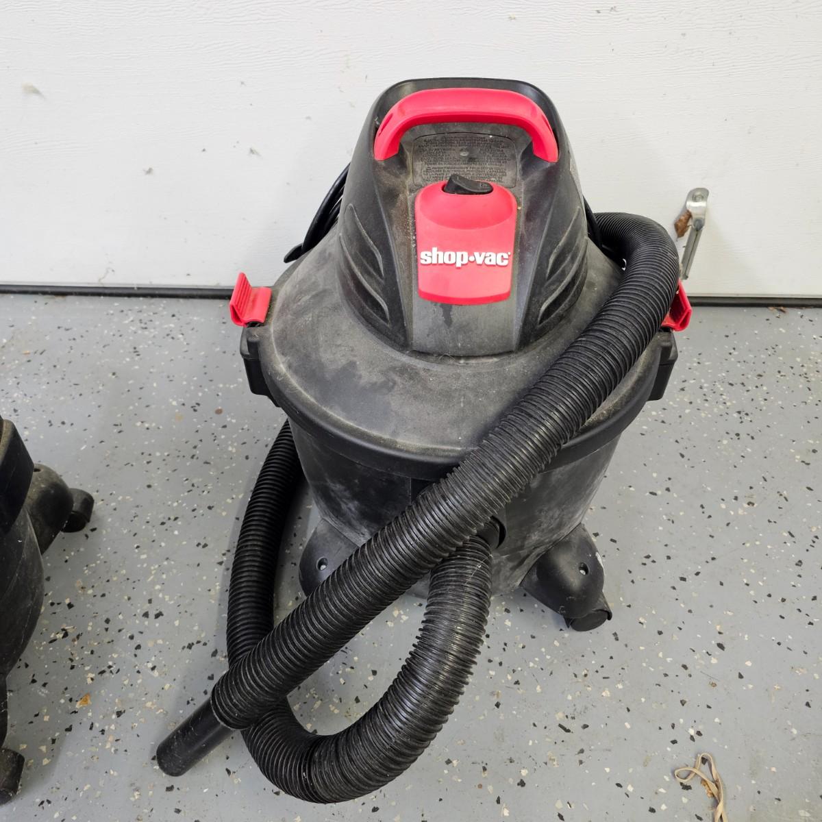 Two matching 6 gallon Shop-Vac rolling vacuums and lots of extras. Units have standard six foot hoses and several extension tubes and floor sweepers. Interior bag collection plus a separate filter canister. Units measure 17" x 18" x 20"H, and both powered on when plugged in. See photos for details. Local pickup only.