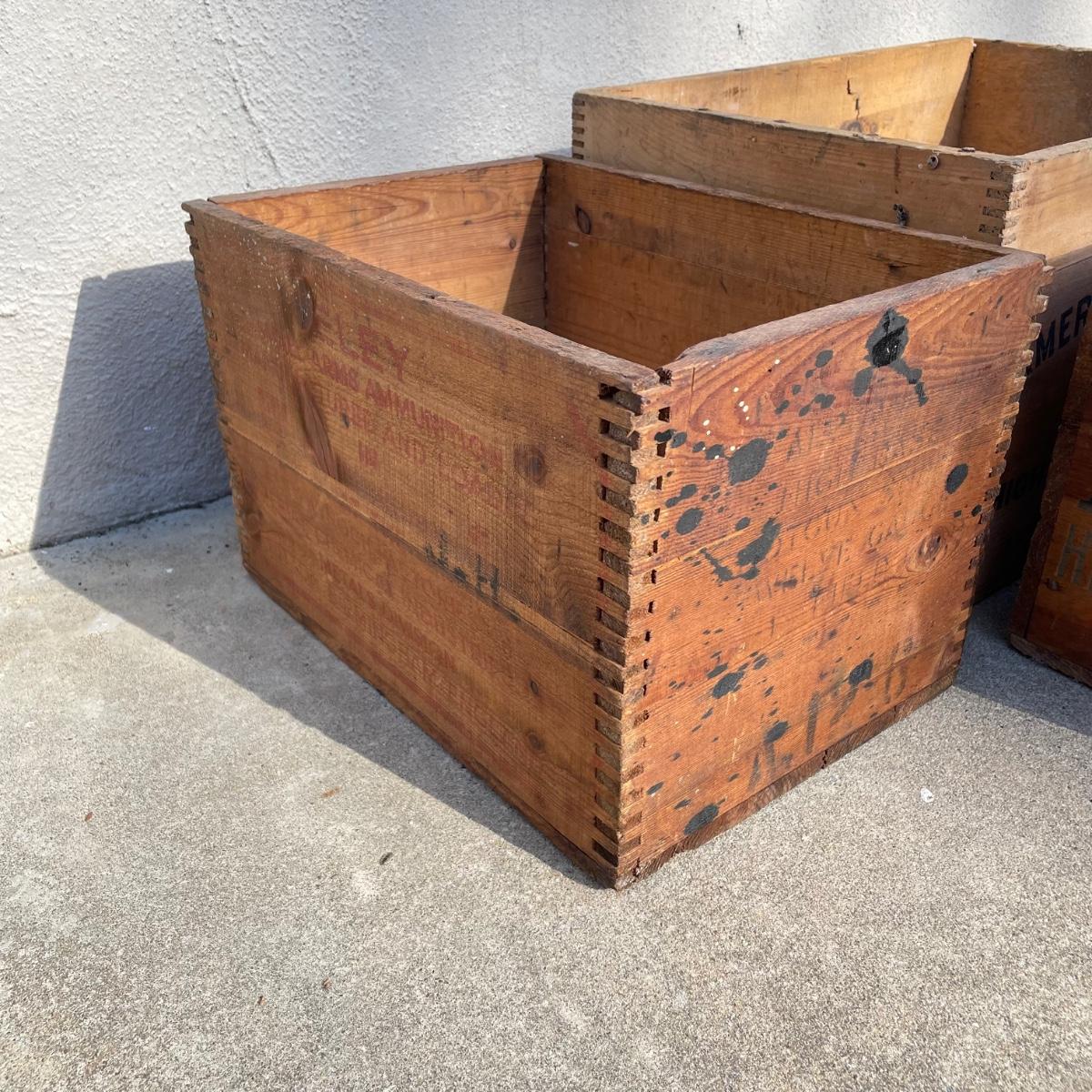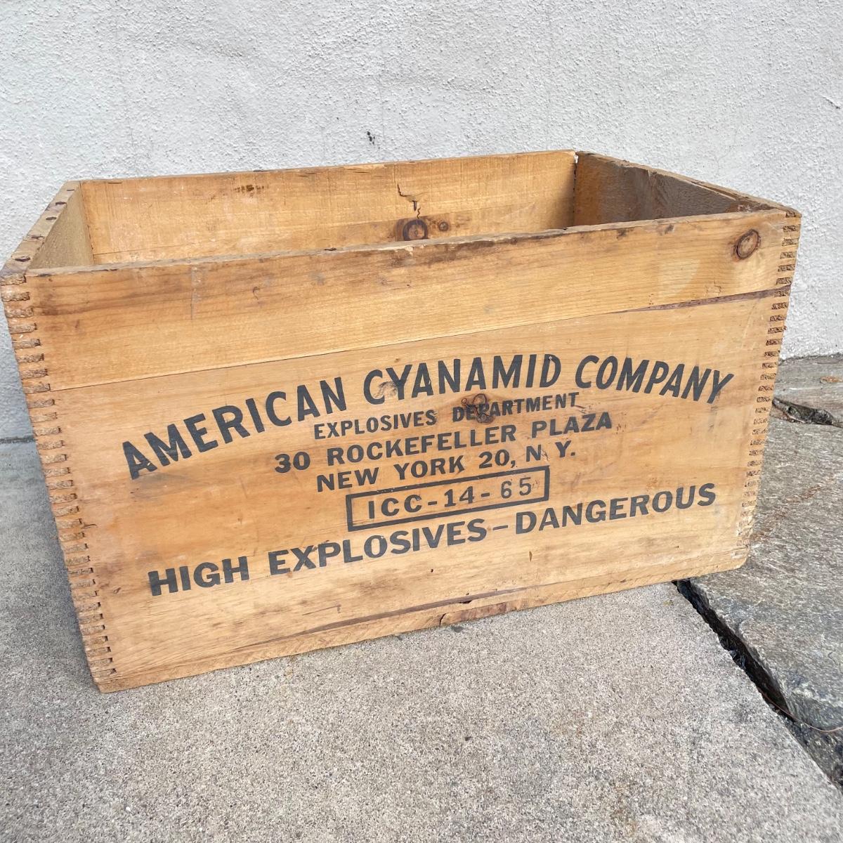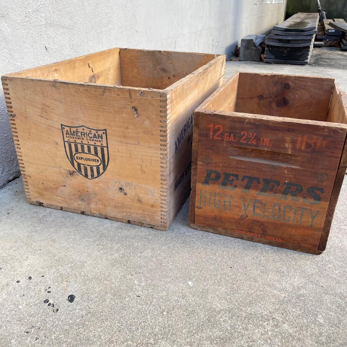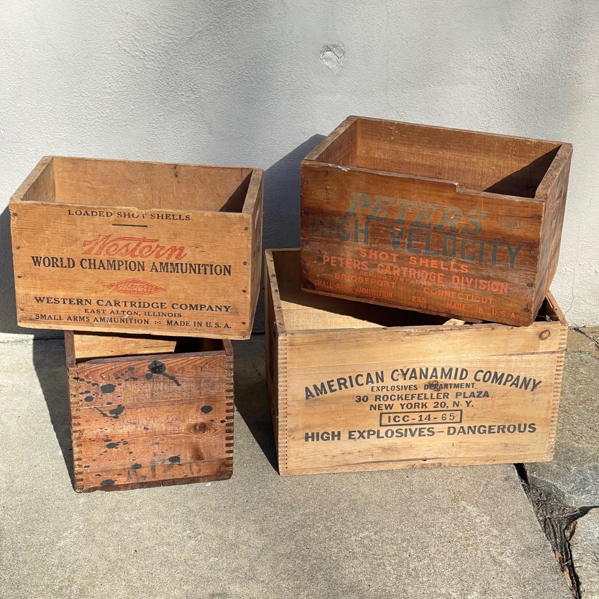 Four ammunition and explosive crates Two DOVETAIL crates Eley Kynoch factories from Great Britain and the American Cyanamid Company from New York. The other two wooden crates included are the Western Cartridge Company and Peters High Velocity shot shells, these both have carved superficial handles. The largest crate is the American Cyanamid crate measuring approximately 18” x 12.5” x 10.25”. See images. Shipping available. Please call UPS with dimensions at 828-252-6930 for a shipping quote prior to bidding.