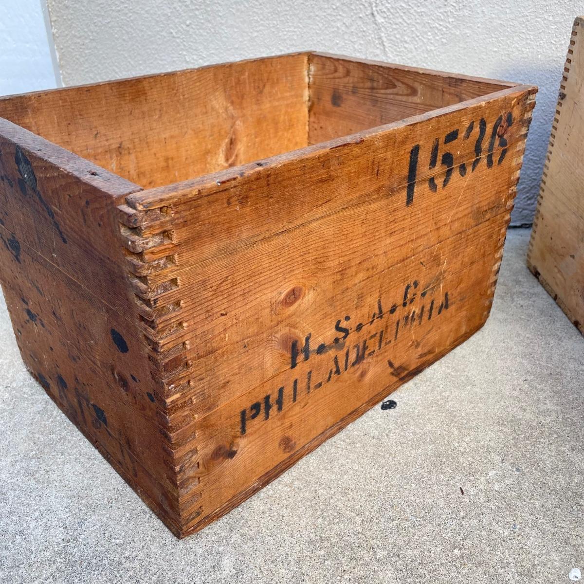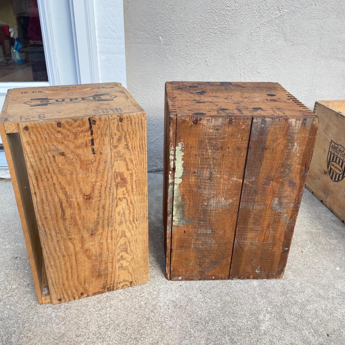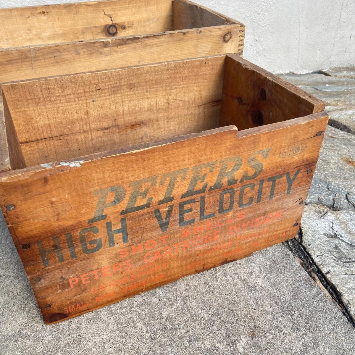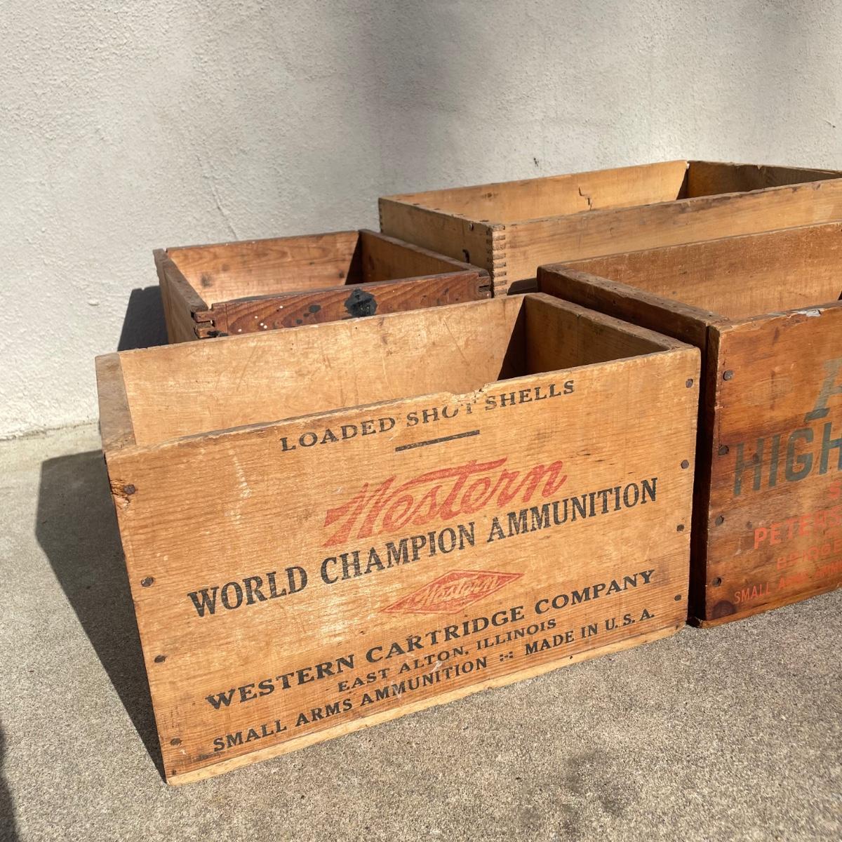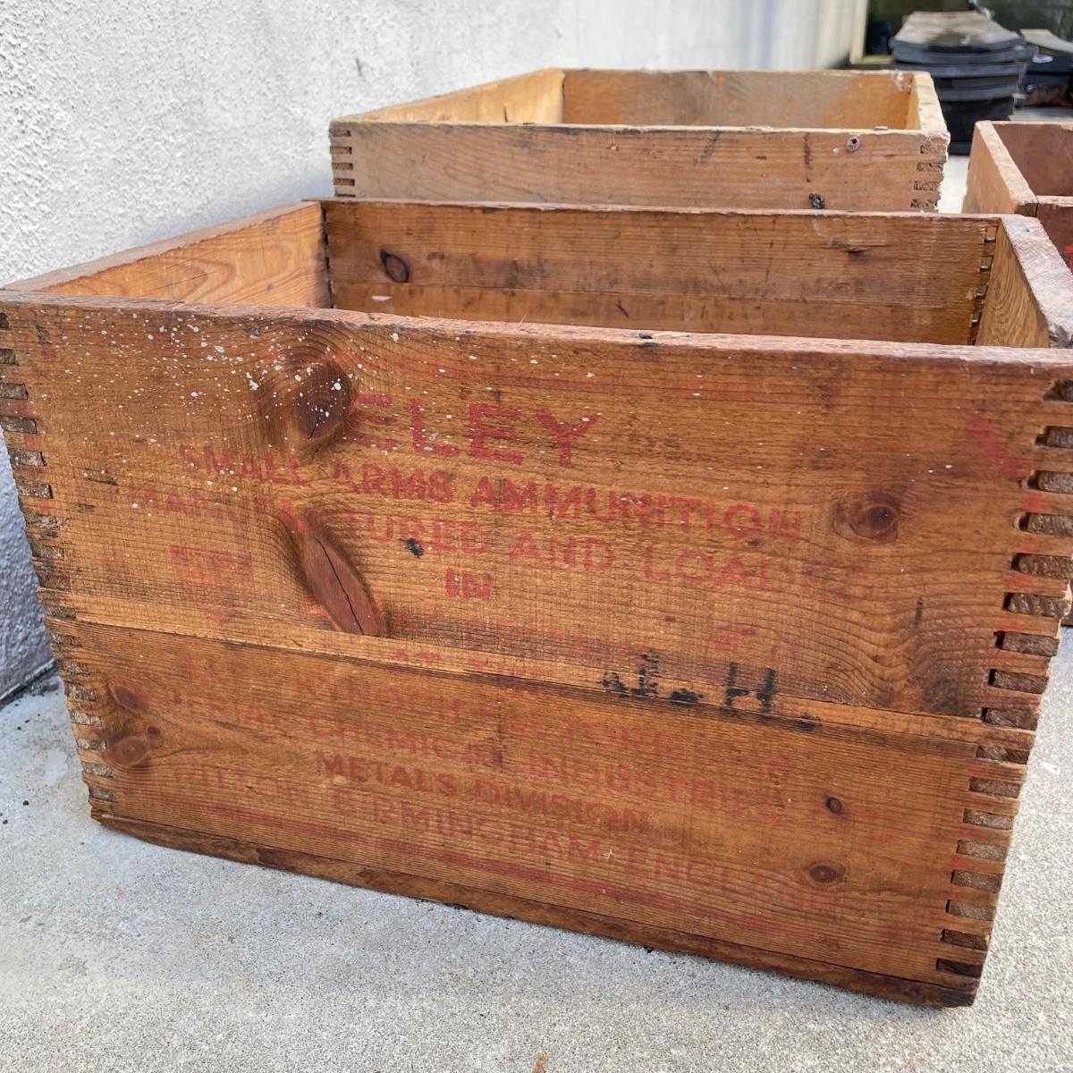 Four ammunition and explosive crates Two DOVETAIL crates Eley Kynoch factories from Great Britain and the American Cyanamid Company from New York. The other two wooden crates included are the Western Cartridge Company and Peters High Velocity shot shells, these both have carved superficial handles. The largest crate is the American Cyanamid crate measuring approximately 18” x 12.5” x 10.25”. See images. Shipping available. Please call UPS with dimensions at 828-252-6930 for a shipping quote prior to bidding.