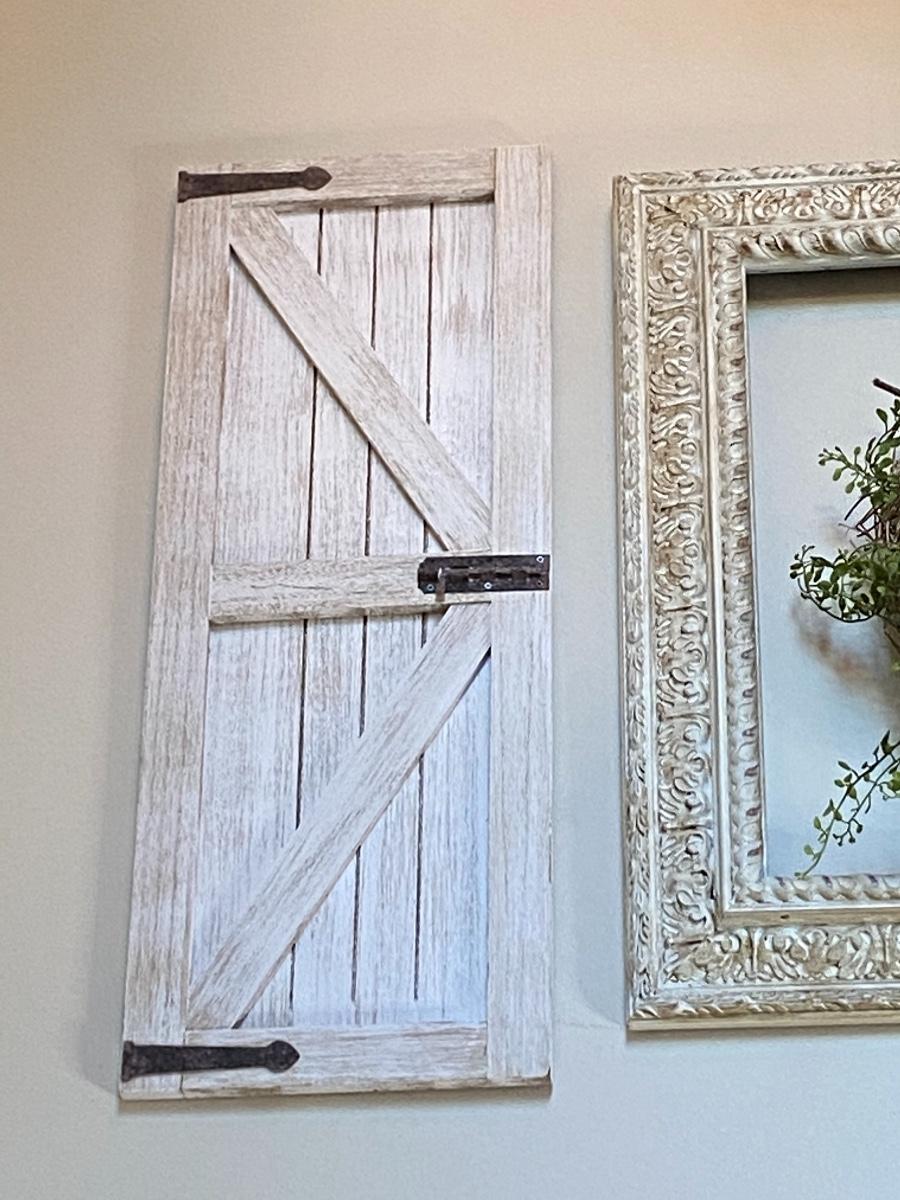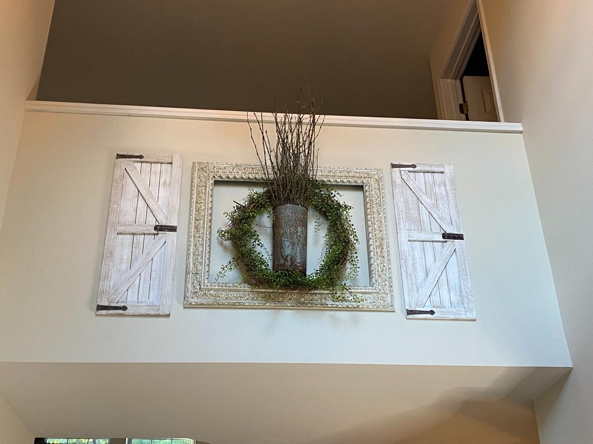 Two Shutters and Frame Ensemble with Galvanized Bucket of Greenery