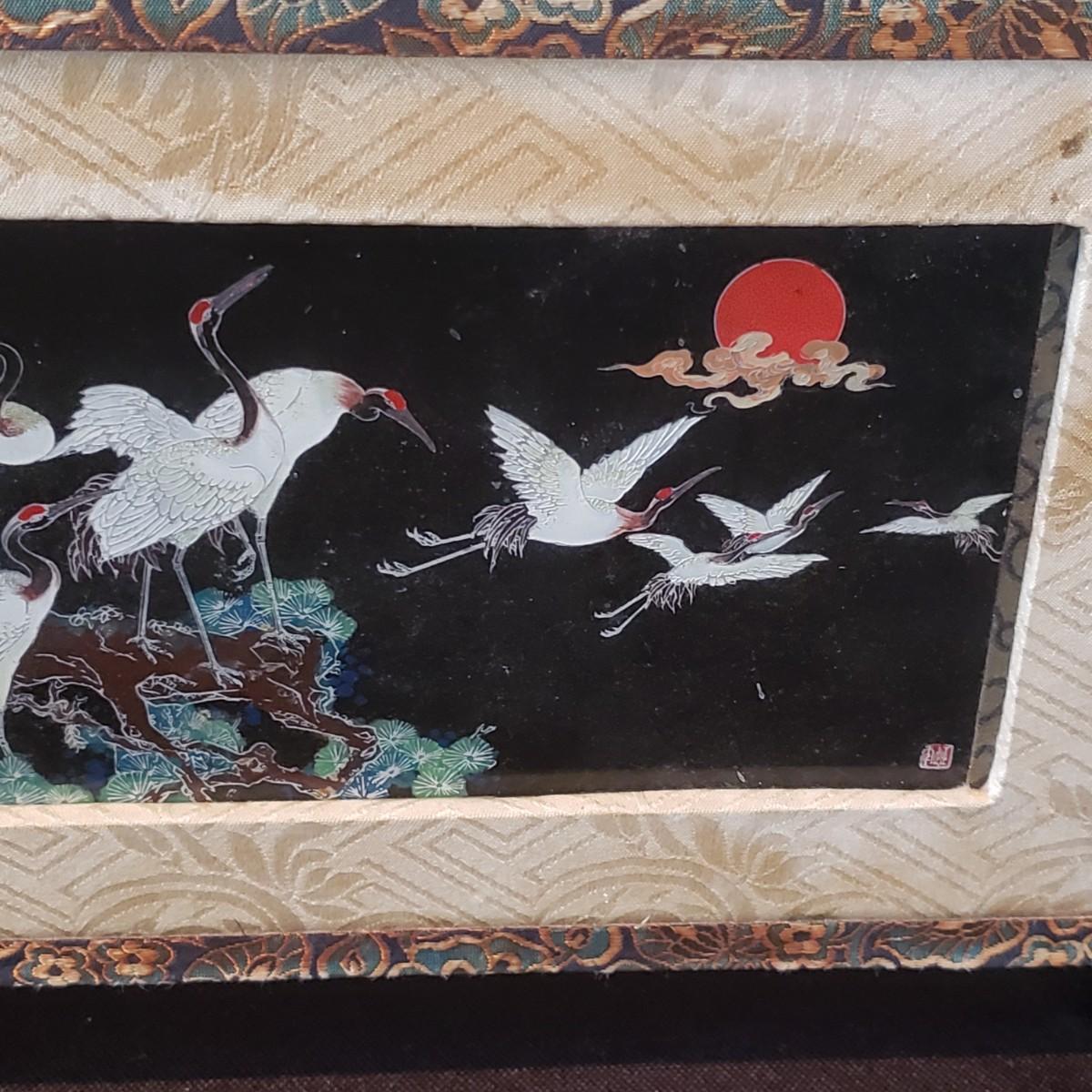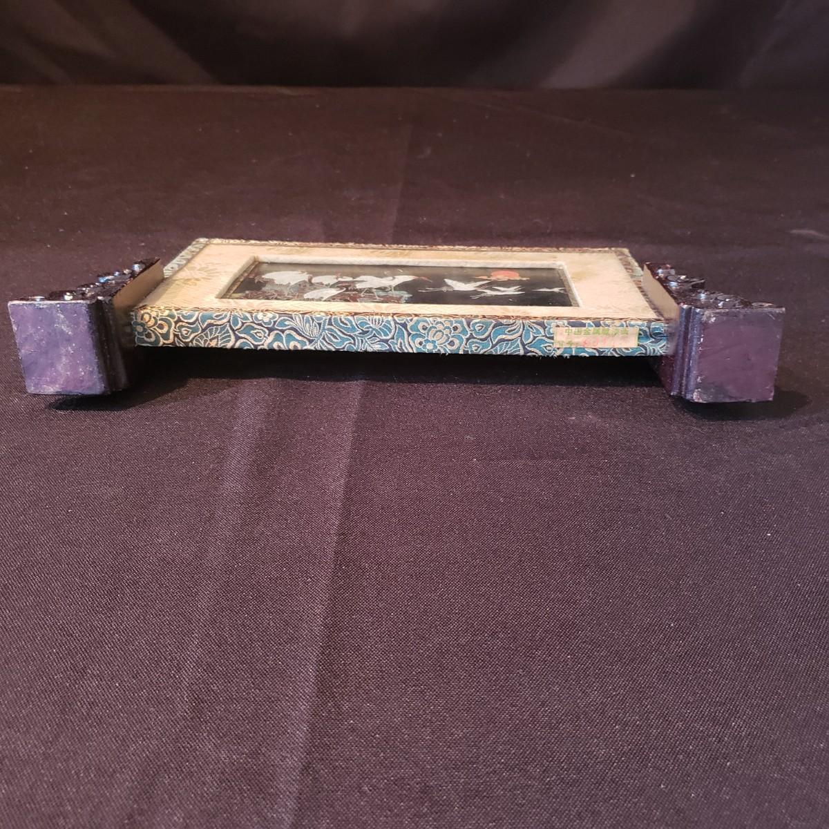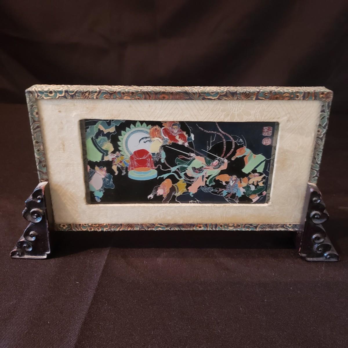 This small art piece stands on wooden scrolls. This piece is behind glass and features two-sided art. One side has cranes, and the other is a war scene. The frame is covered in material. It is hard to tell if it is a print or original painting. It measures 11" x 2" x 6"H.