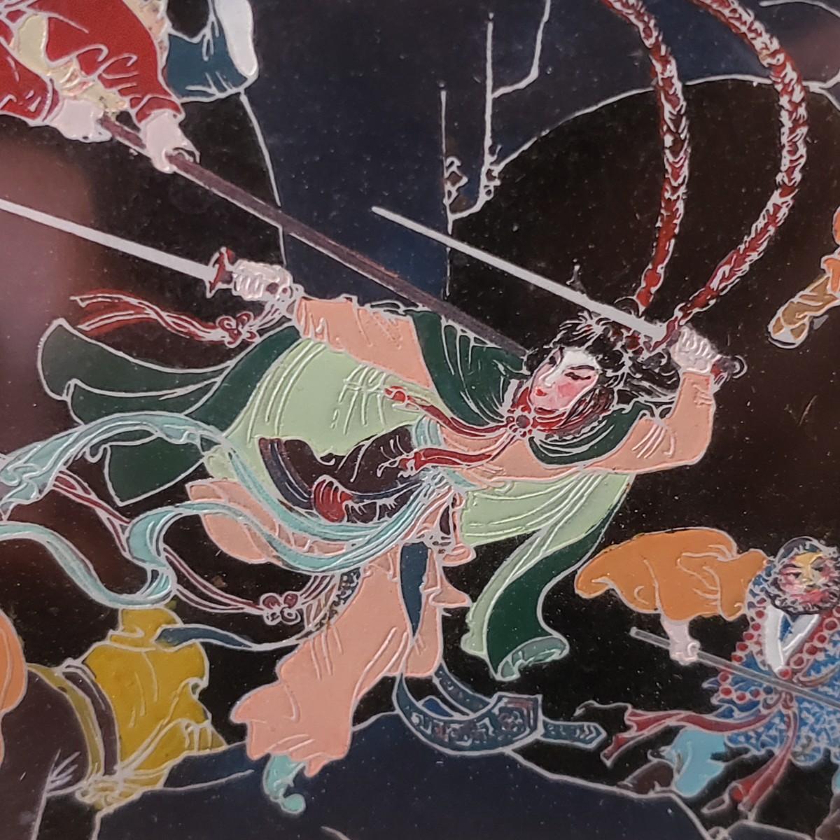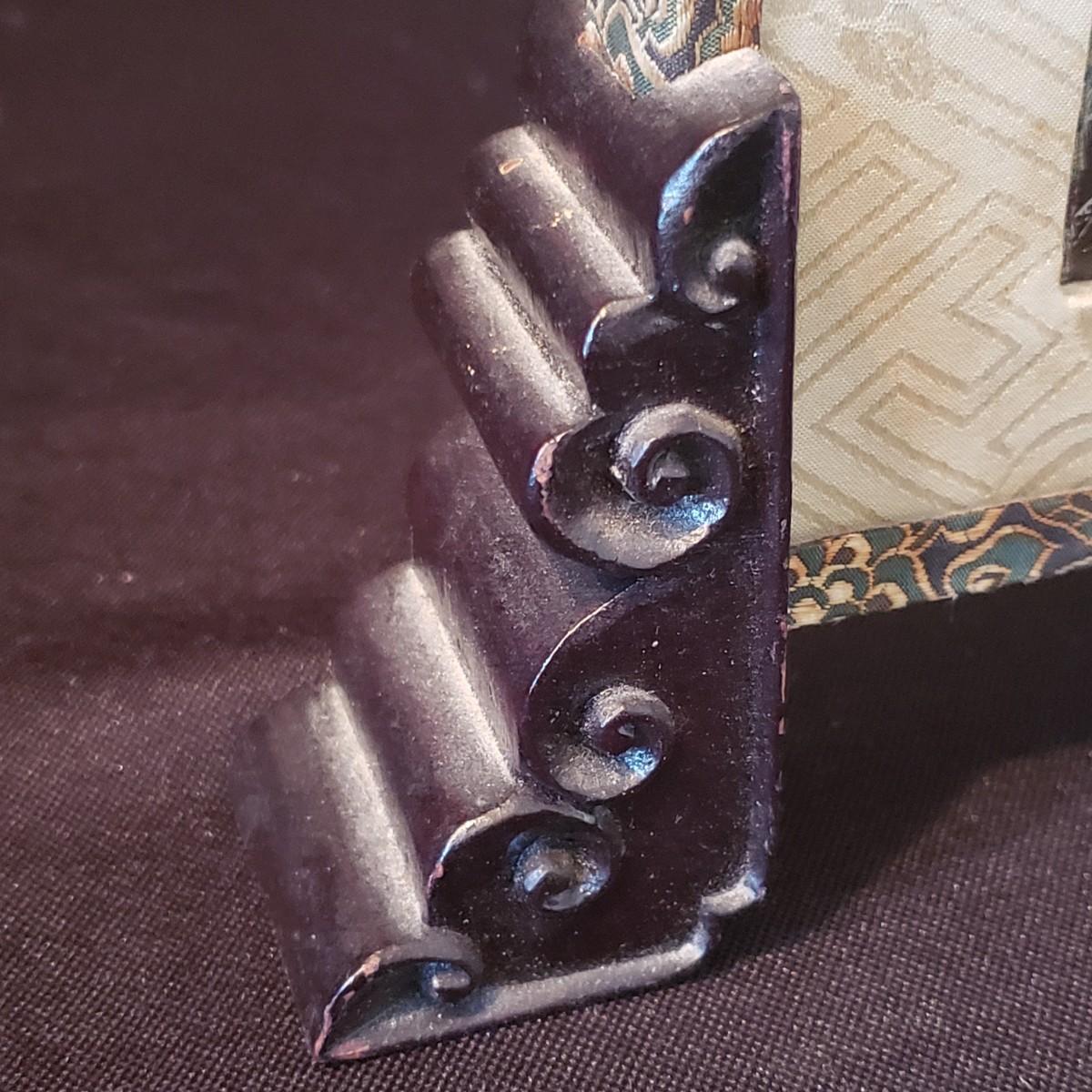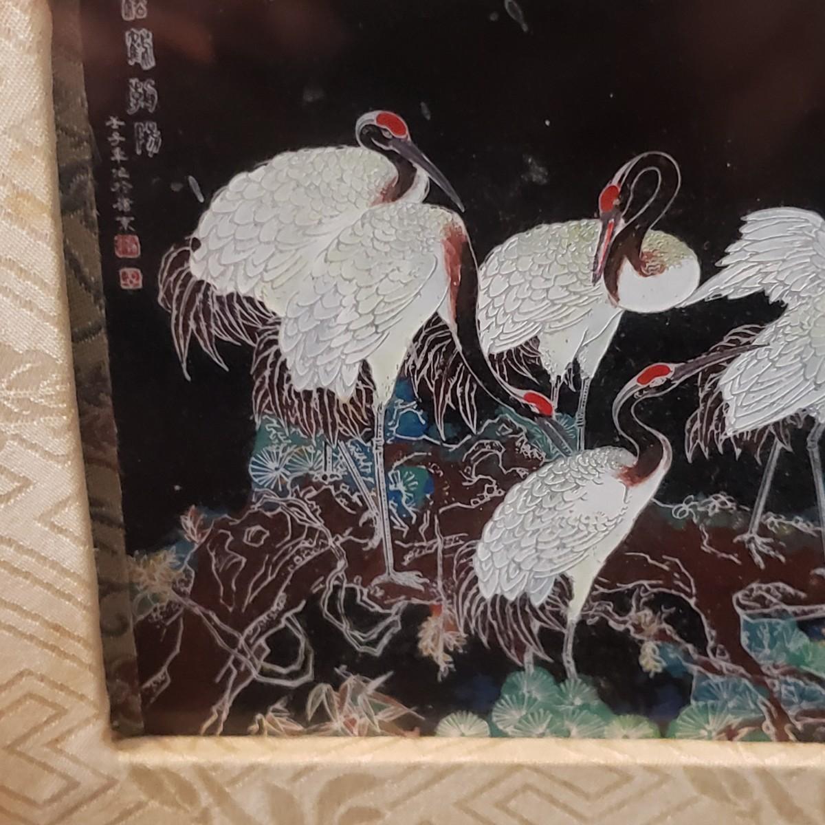 This small art piece stands on wooden scrolls. This piece is behind glass and features two-sided art. One side has cranes, and the other is a war scene. The frame is covered in material. It is hard to tell if it is a print or original painting. It measures 11" x 2" x 6"H.