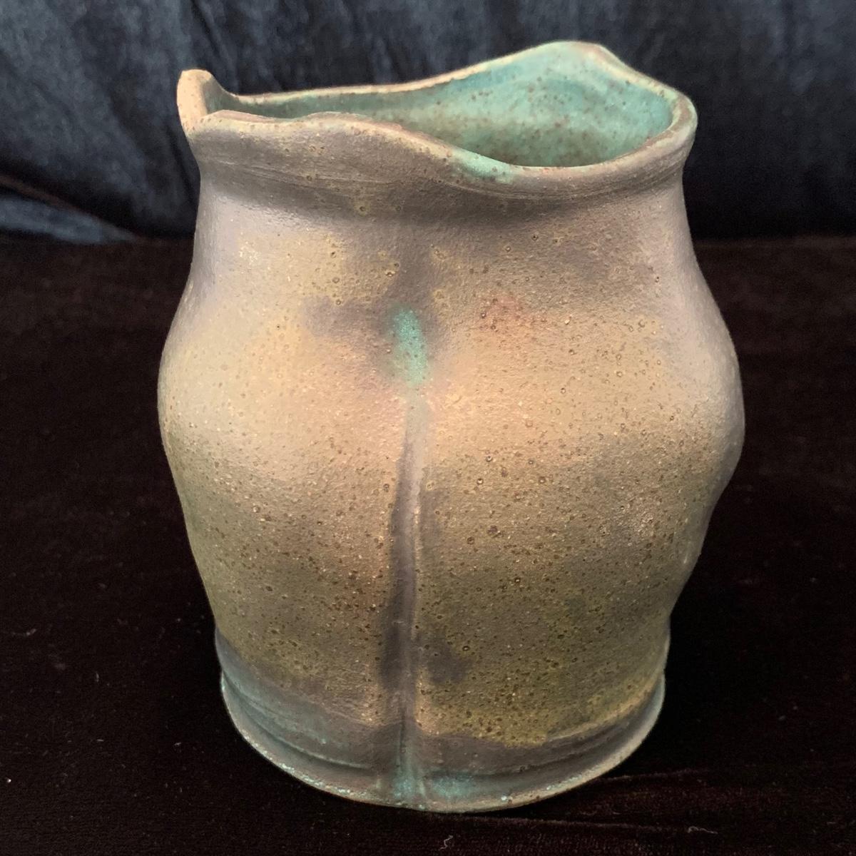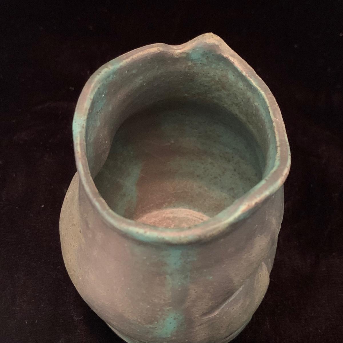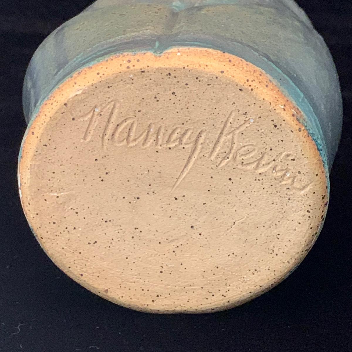 Two Signed Ceramic vases. The dark green vase featuring a woman’s body measures approximately 4” x 3.5” x 4.5”H. The other has a glossy finish and is a light tan/cream color with a lavender band.