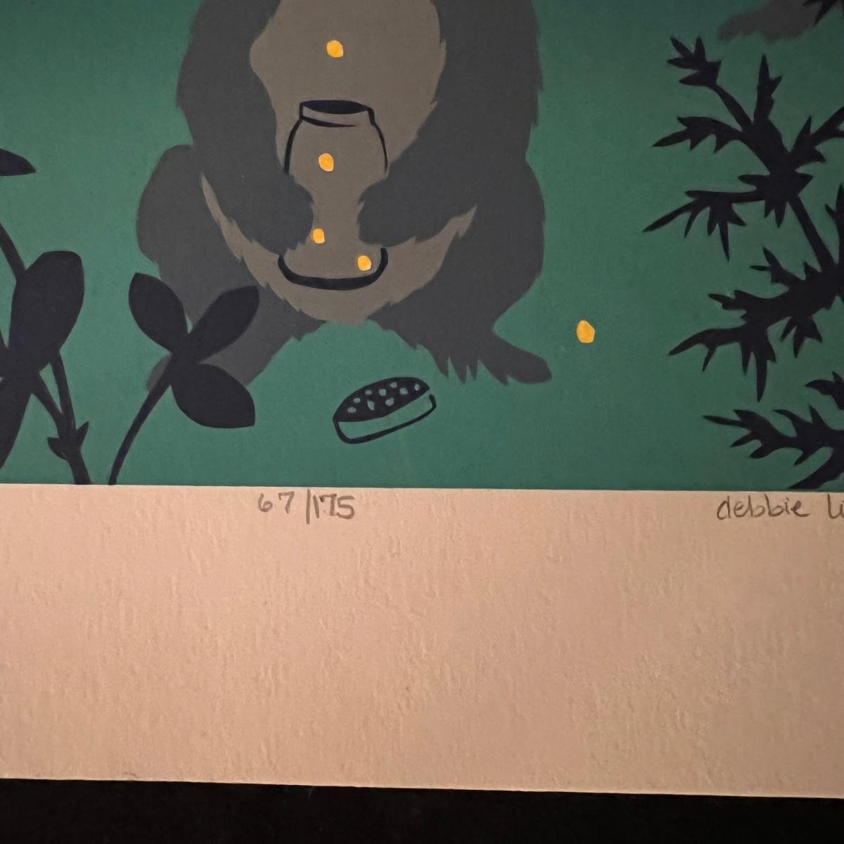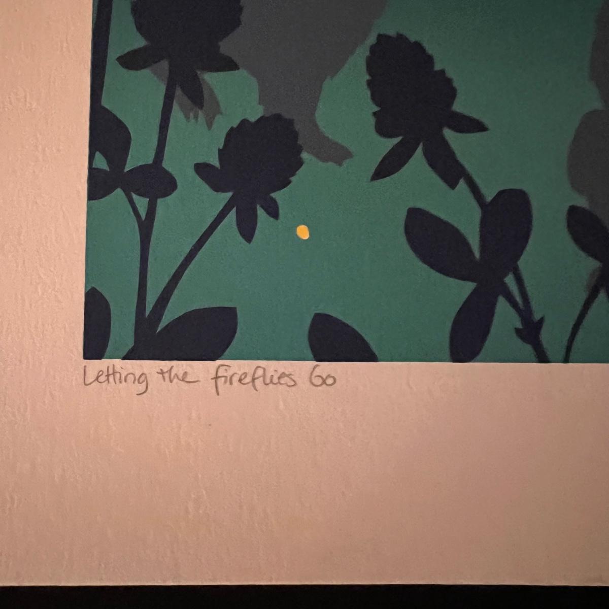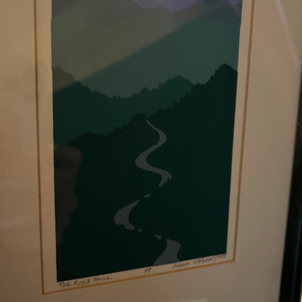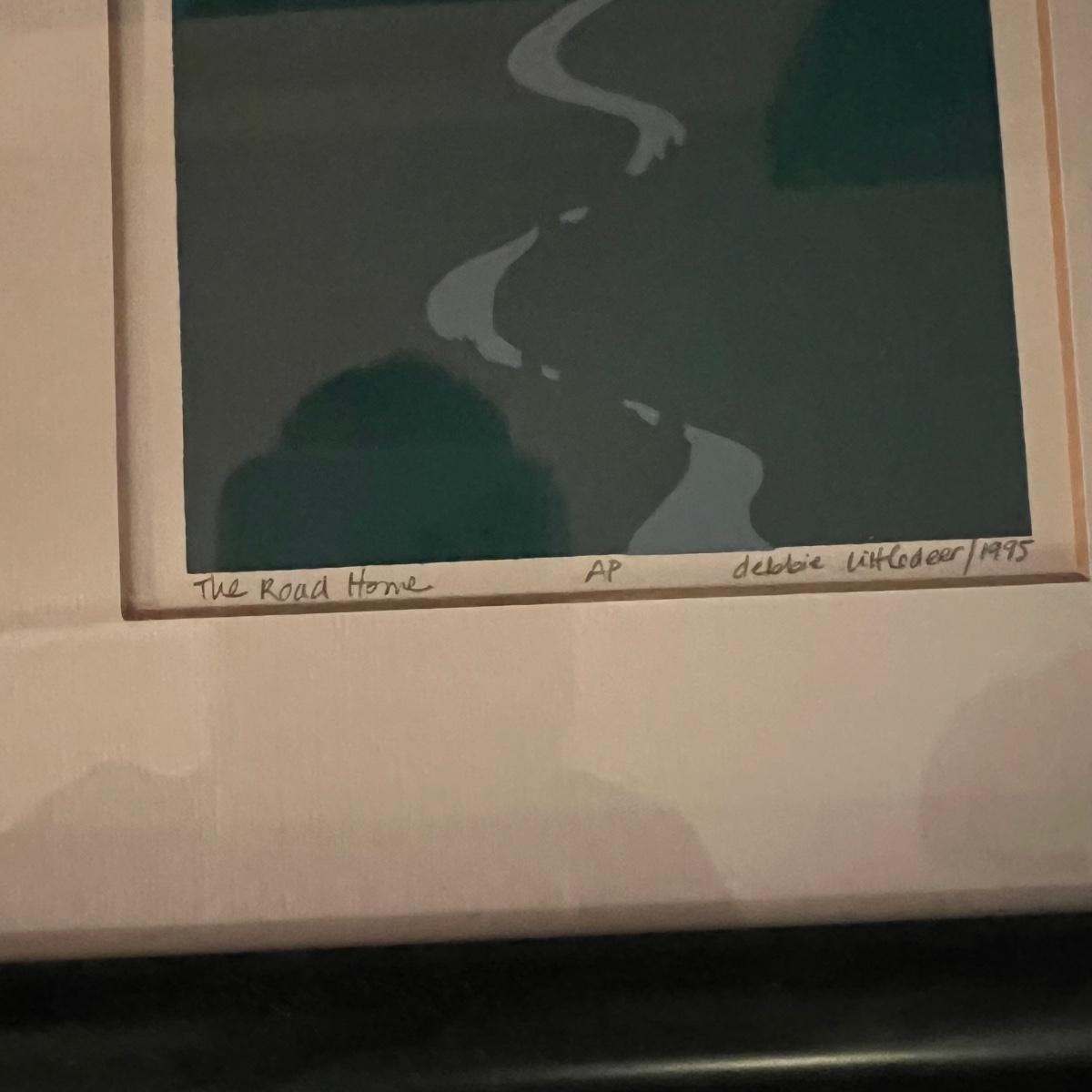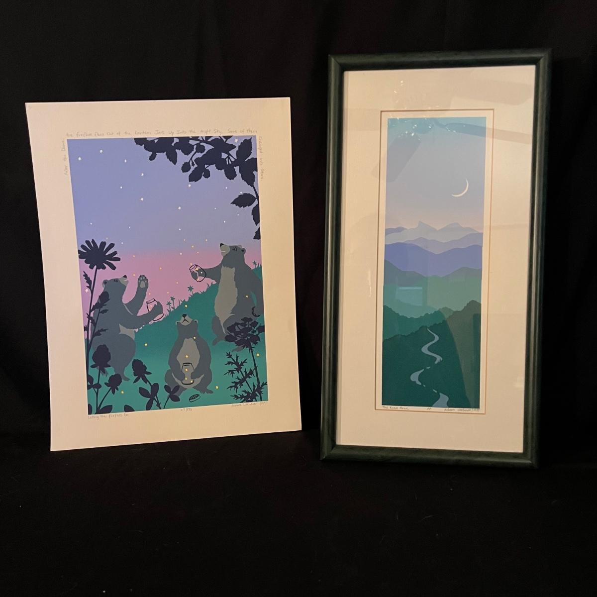 To screen prints by Debbie Littledeer Erskine. “Letting the Firefly’s Go” is numbered 67/175 and was printed in 1997. The phrase written at the top says, “After the dance, the fire flies flew out of the lantern jars up into the night sky. Some of them changed into stars.” It measures 11” x 15”. The green framed print entitled “The Road Home” was printed in 1995 and is AP (artist’s proof). This piece measures 9” x .75” x 17”H.