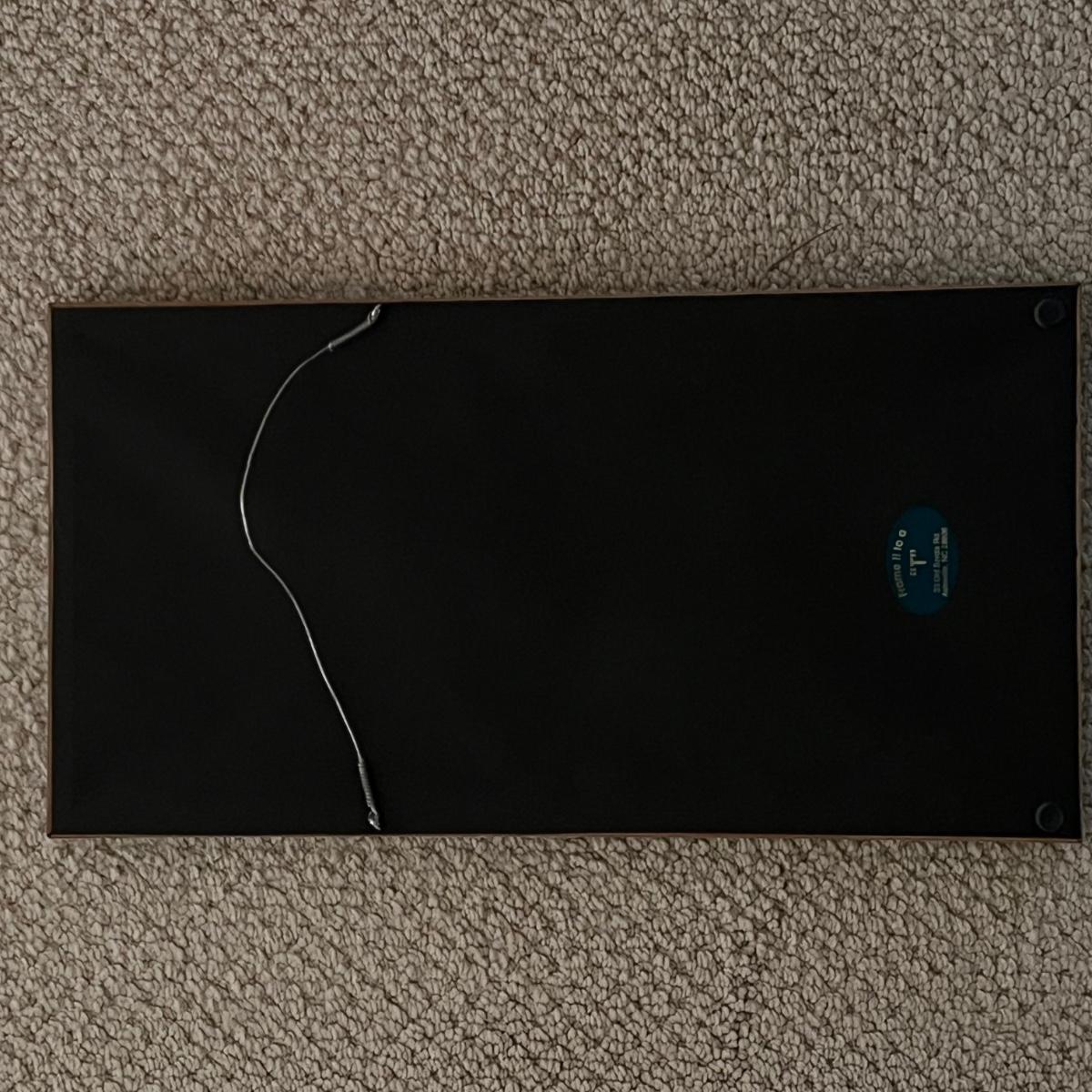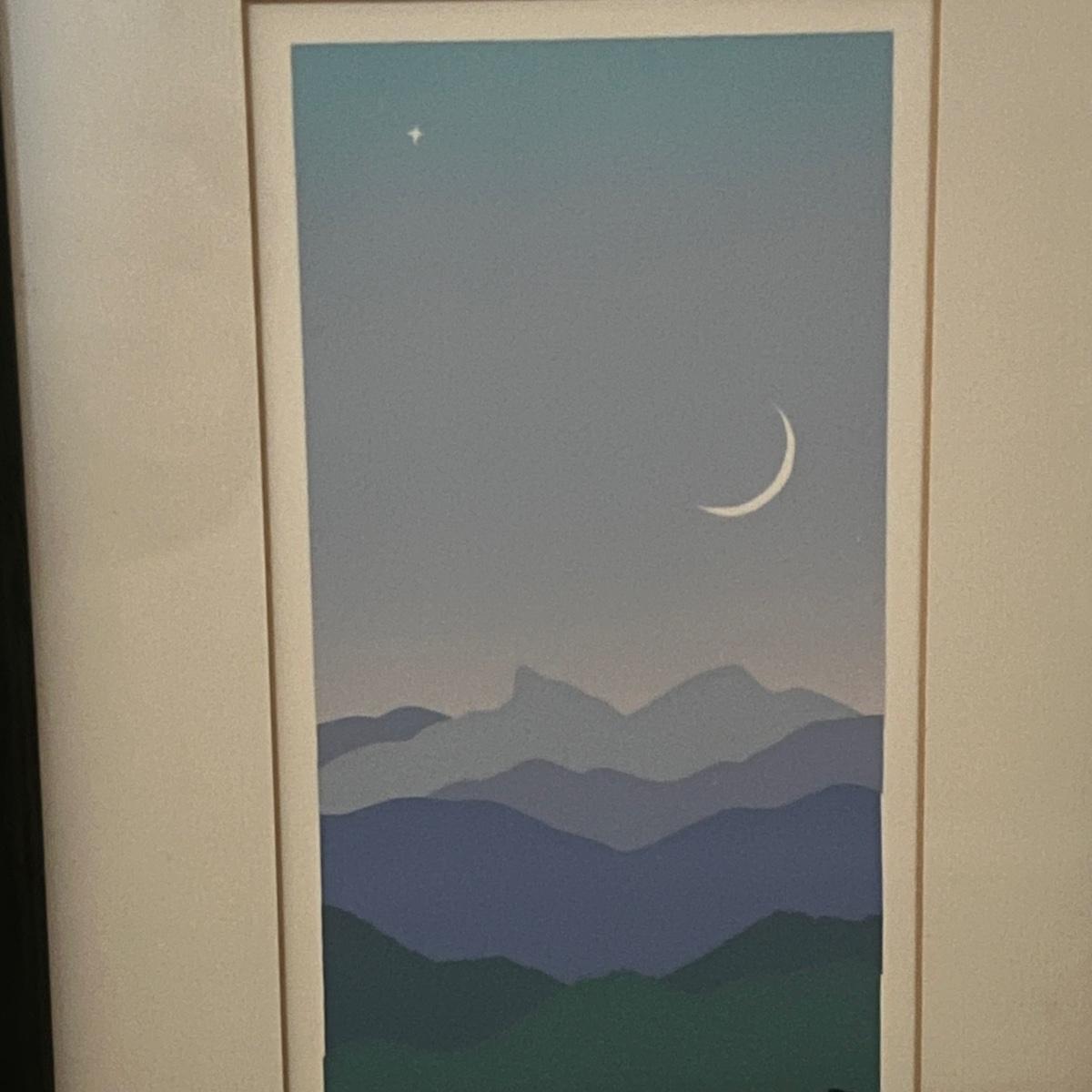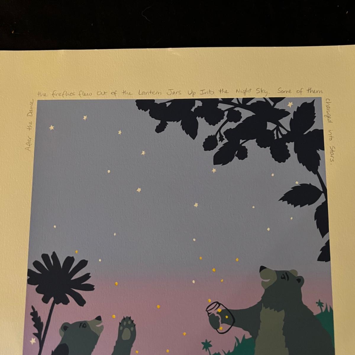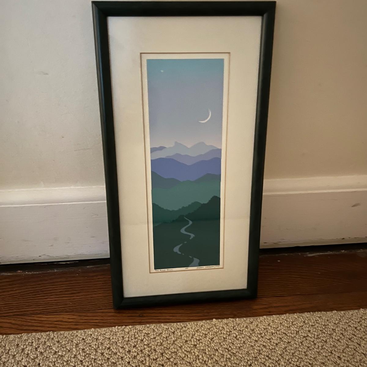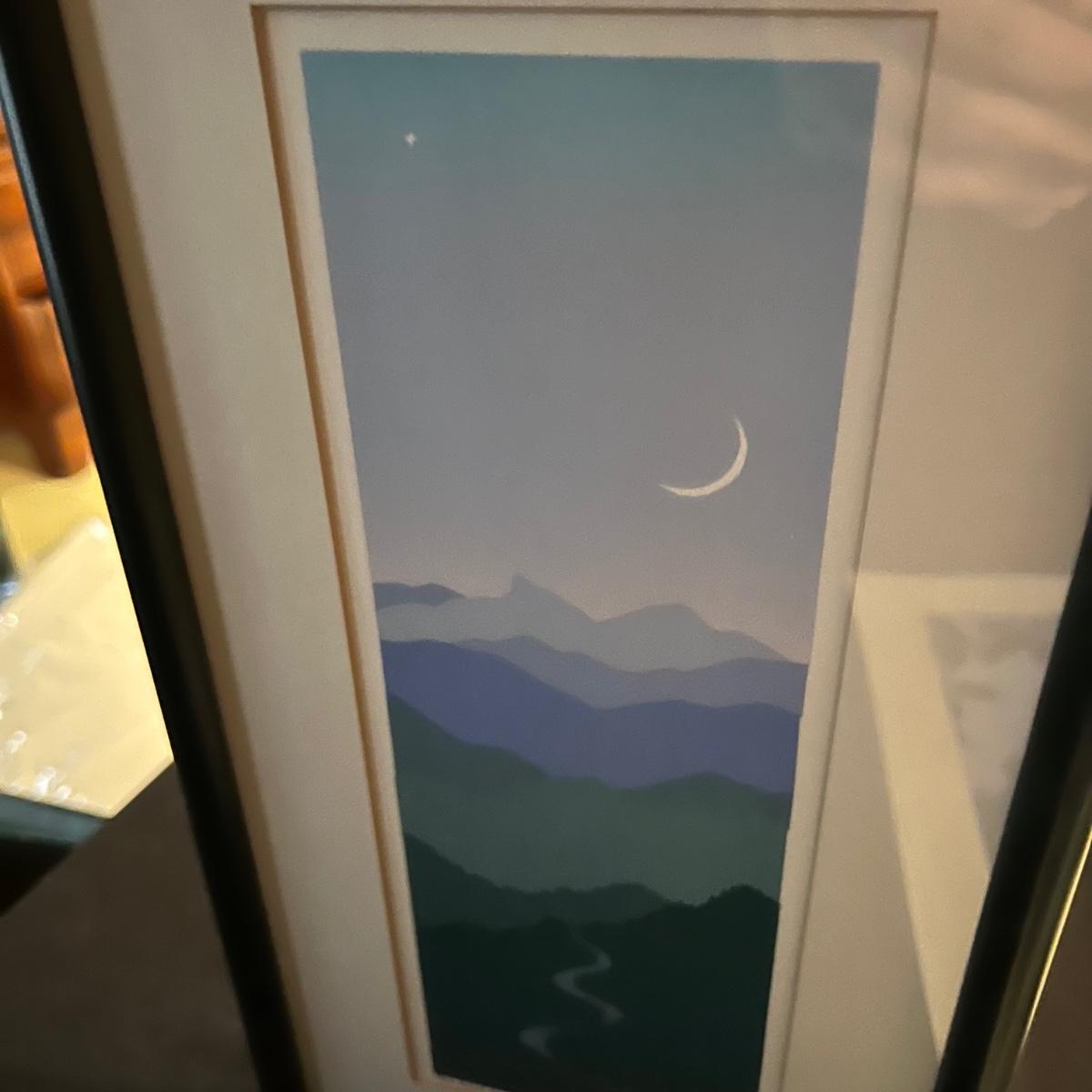 To screen prints by Debbie Littledeer Erskine. “Letting the Firefly’s Go” is numbered 67/175 and was printed in 1997. The phrase written at the top says, “After the dance, the fire flies flew out of the lantern jars up into the night sky. Some of them changed into stars.” It measures 11” x 15”. The green framed print entitled “The Road Home” was printed in 1995 and is AP (artist’s proof). This piece measures 9” x .75” x 17”H.