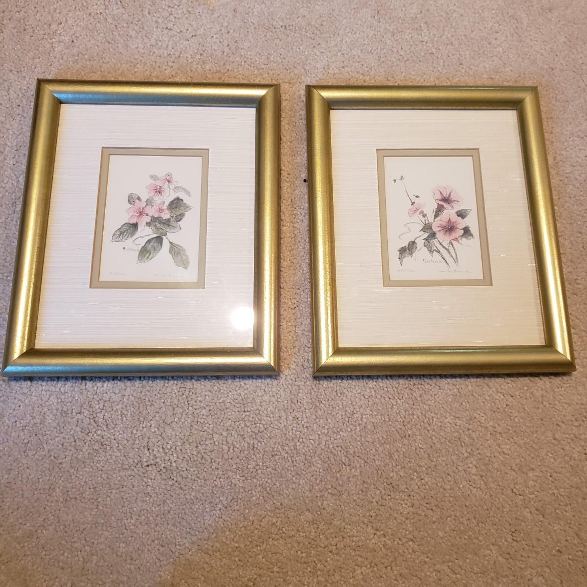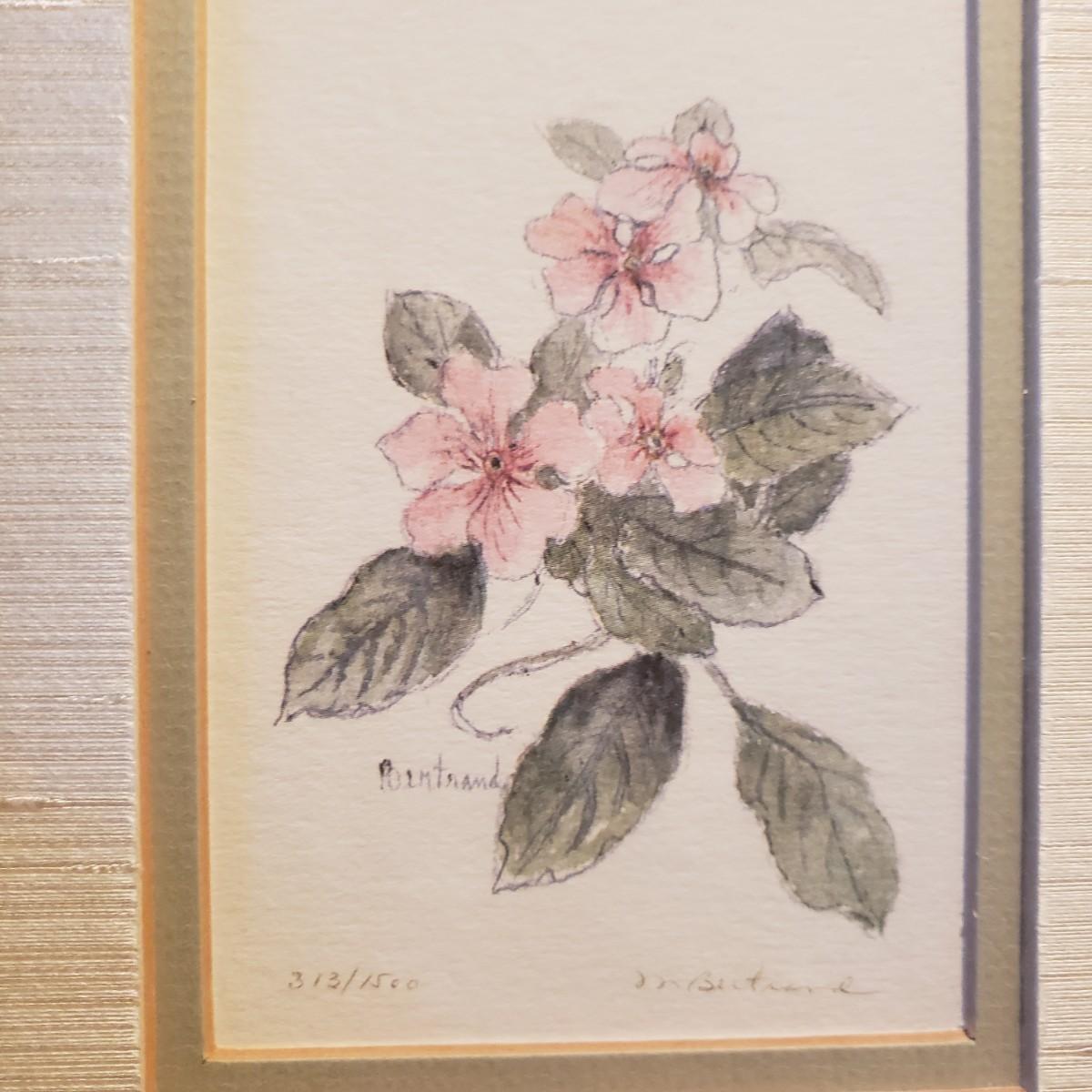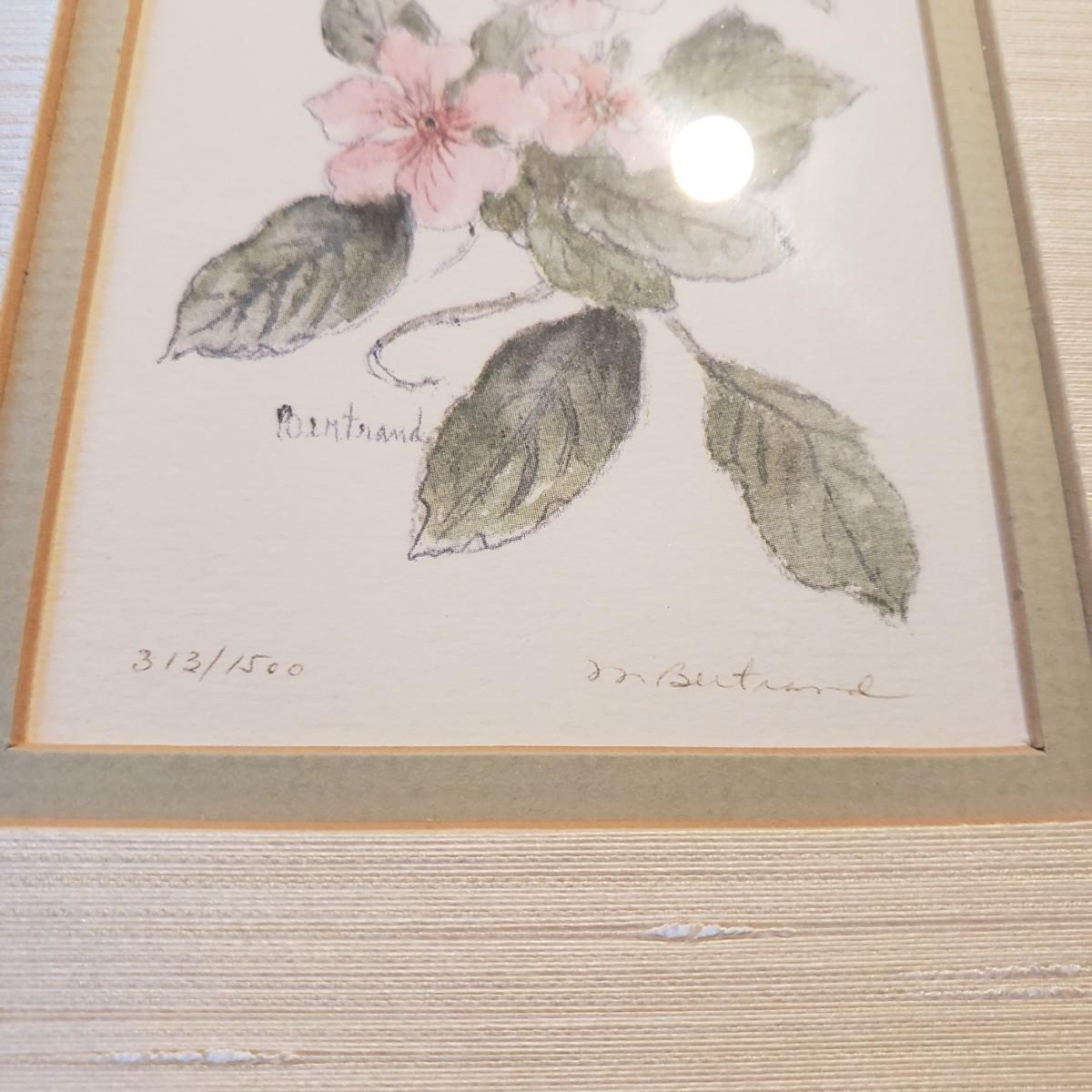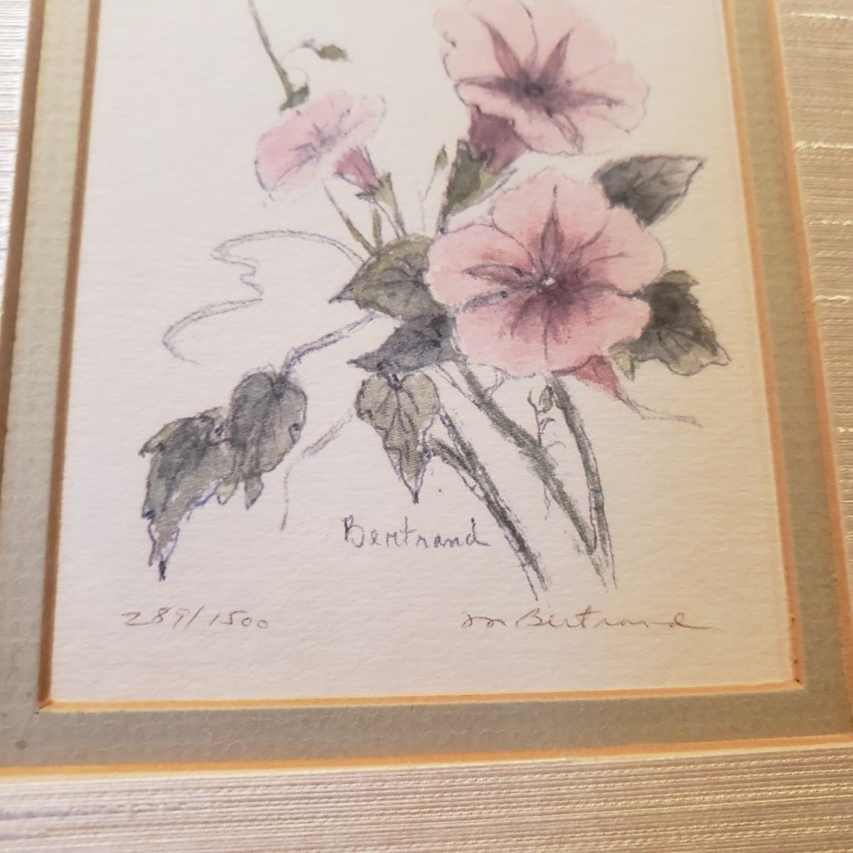 This floral lot features two embroidered pillows measuring 16" x 12". The pillows are super soft and the embroidery is very detailed. The pillows zipper open for washing purposes. The two signed prints by Bertrand number 289/1500 and 313/1500. Both matching gold, wooden and glass frames measure 9" x 11".