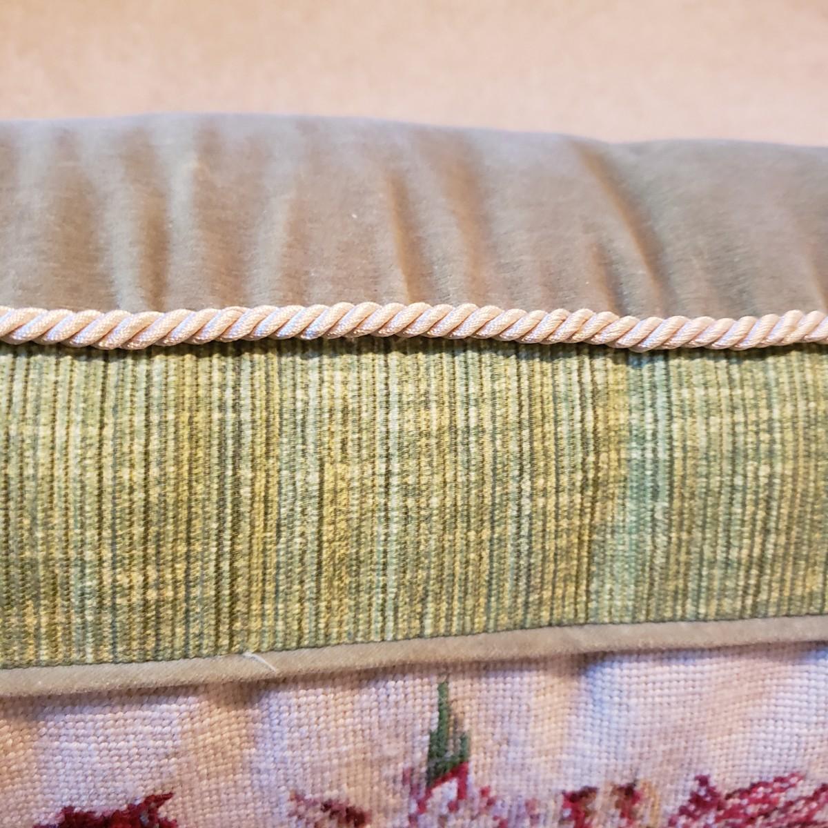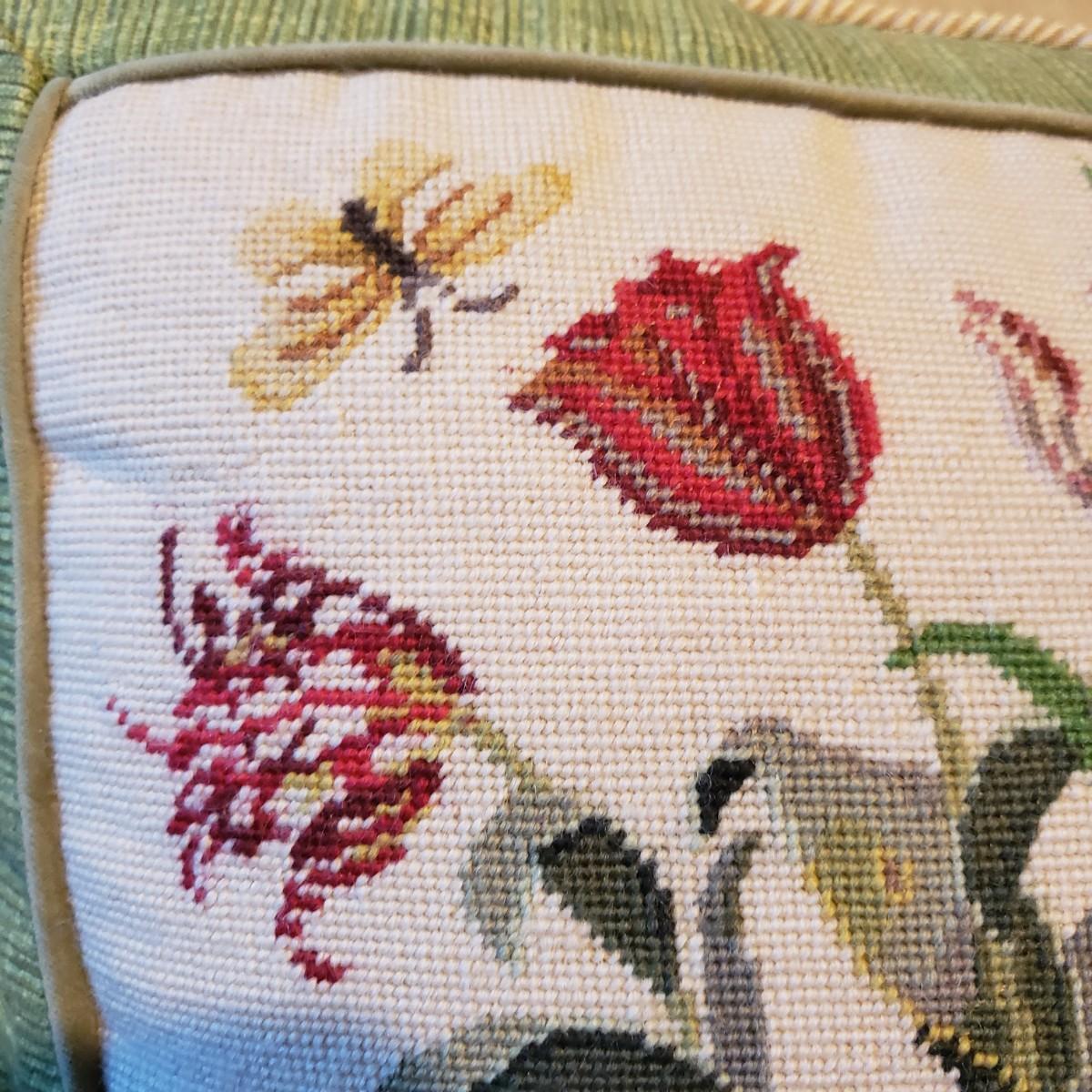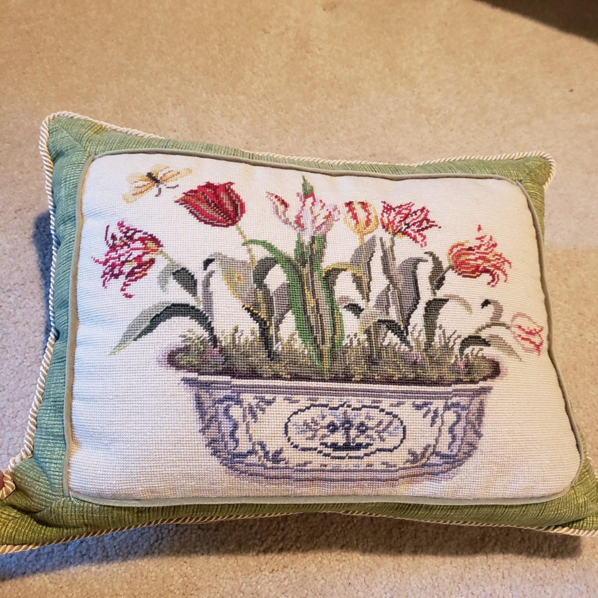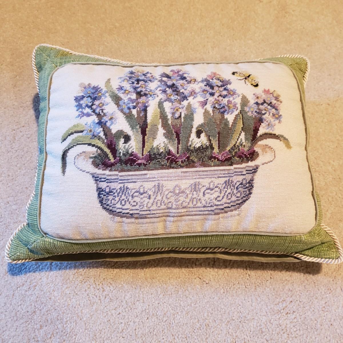 This floral lot features two embroidered pillows measuring 16" x 12". The pillows are super soft and the embroidery is very detailed. The pillows zipper open for washing purposes. The two signed prints by Bertrand number 289/1500 and 313/1500. Both matching gold, wooden and glass frames measure 9" x 11".