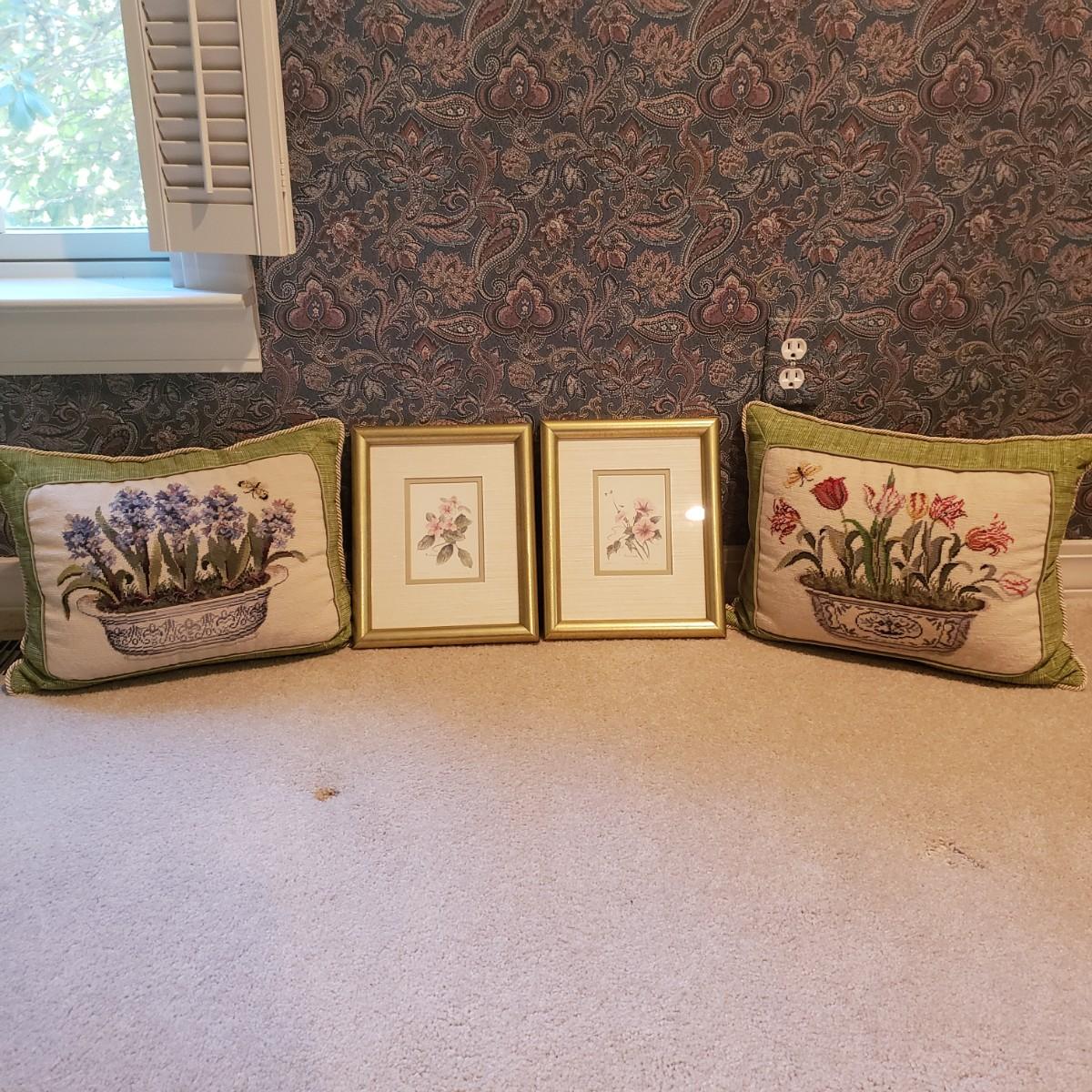 Two Signed Floral Prints and Two Floral Embroidered Pillows (2S-KD)