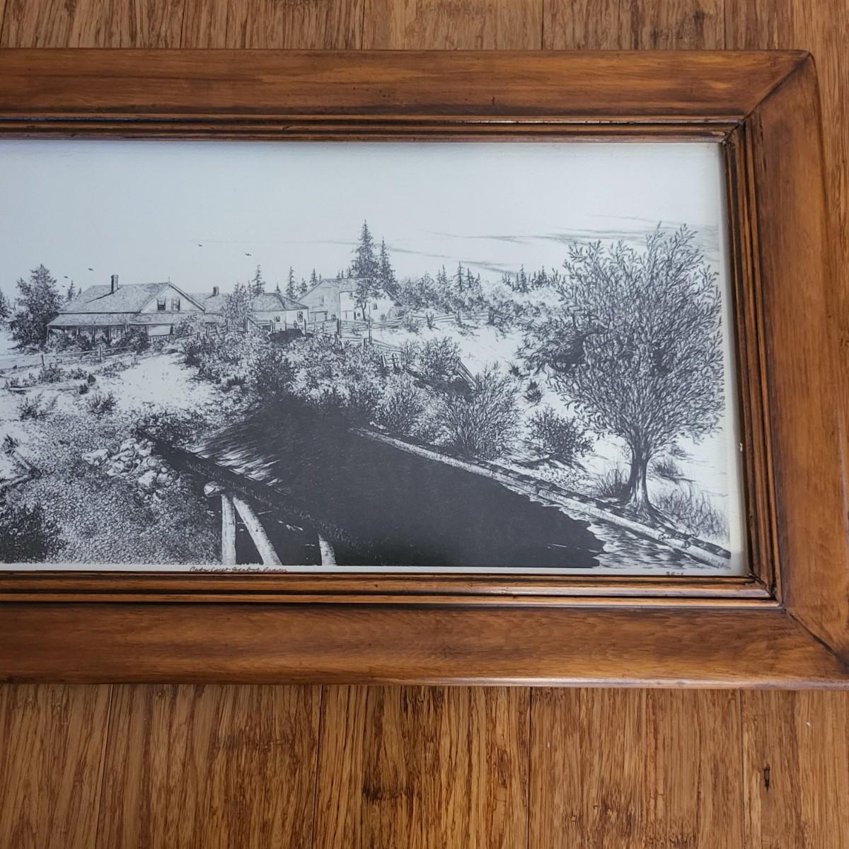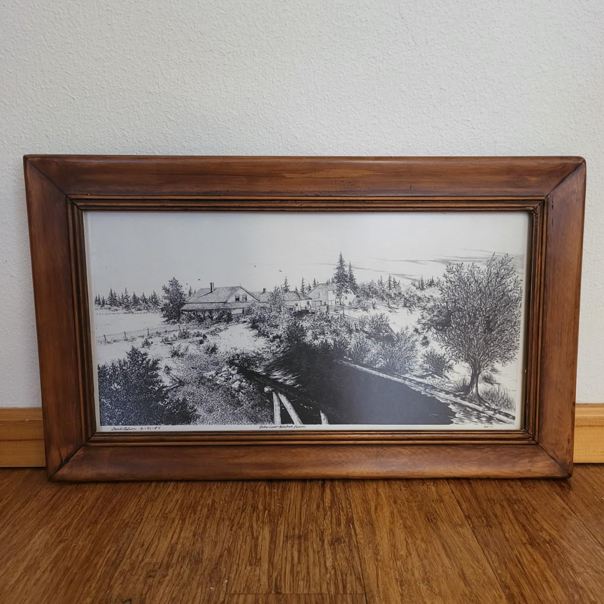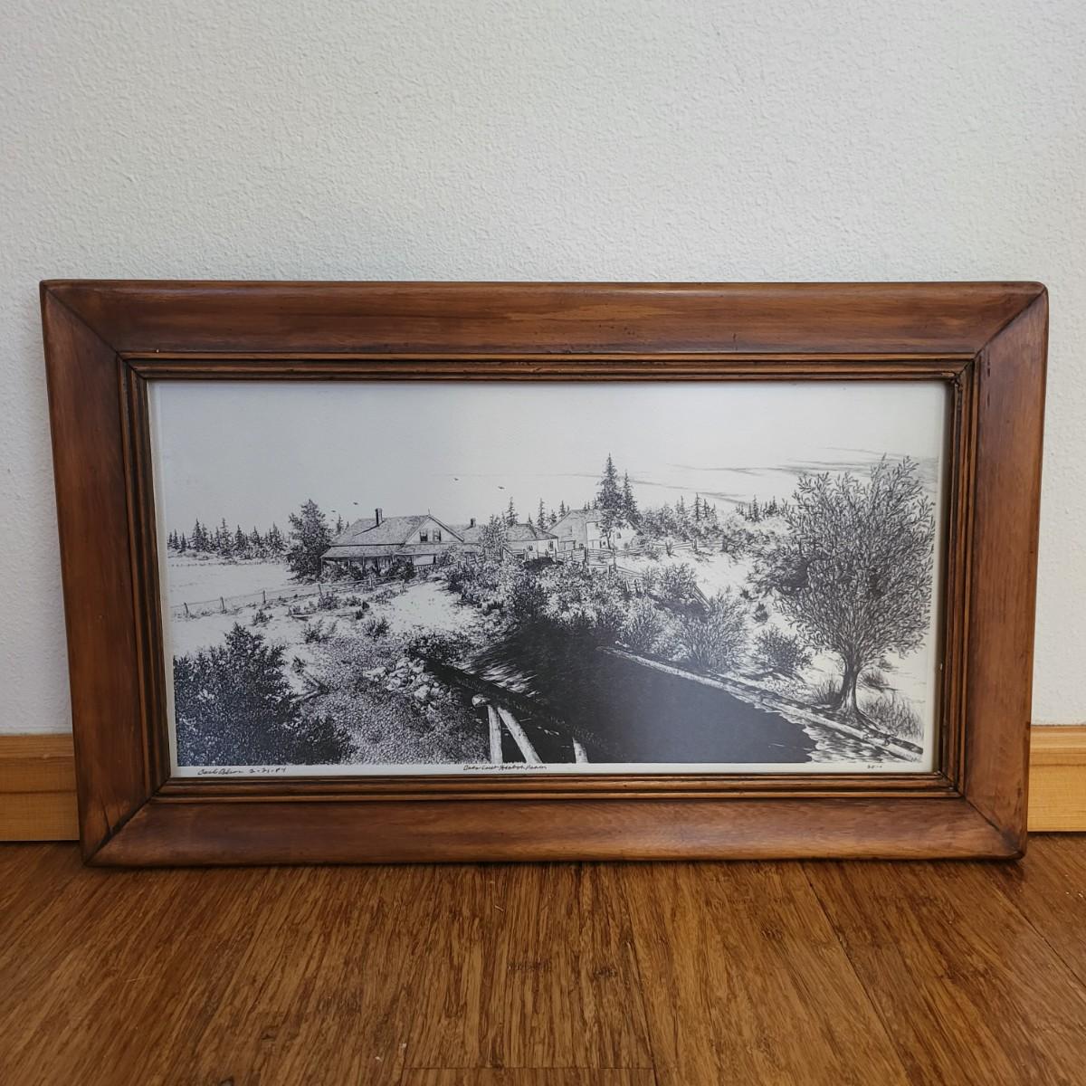 Homestead black & white etching print, Carol Olson. Antique wood frame 22" x 15".