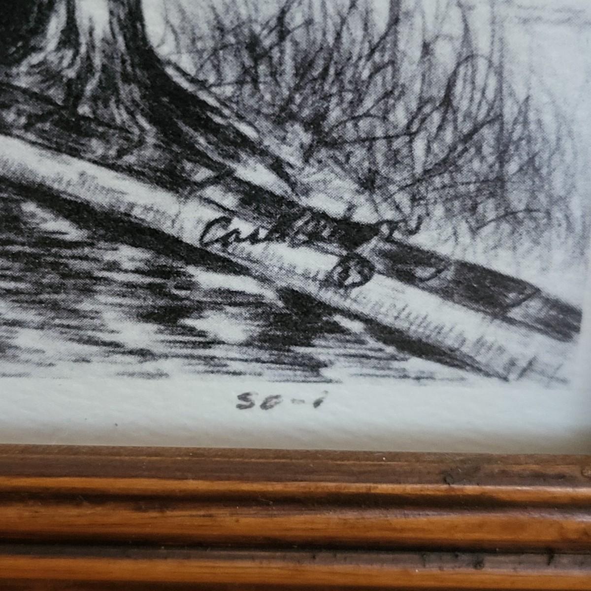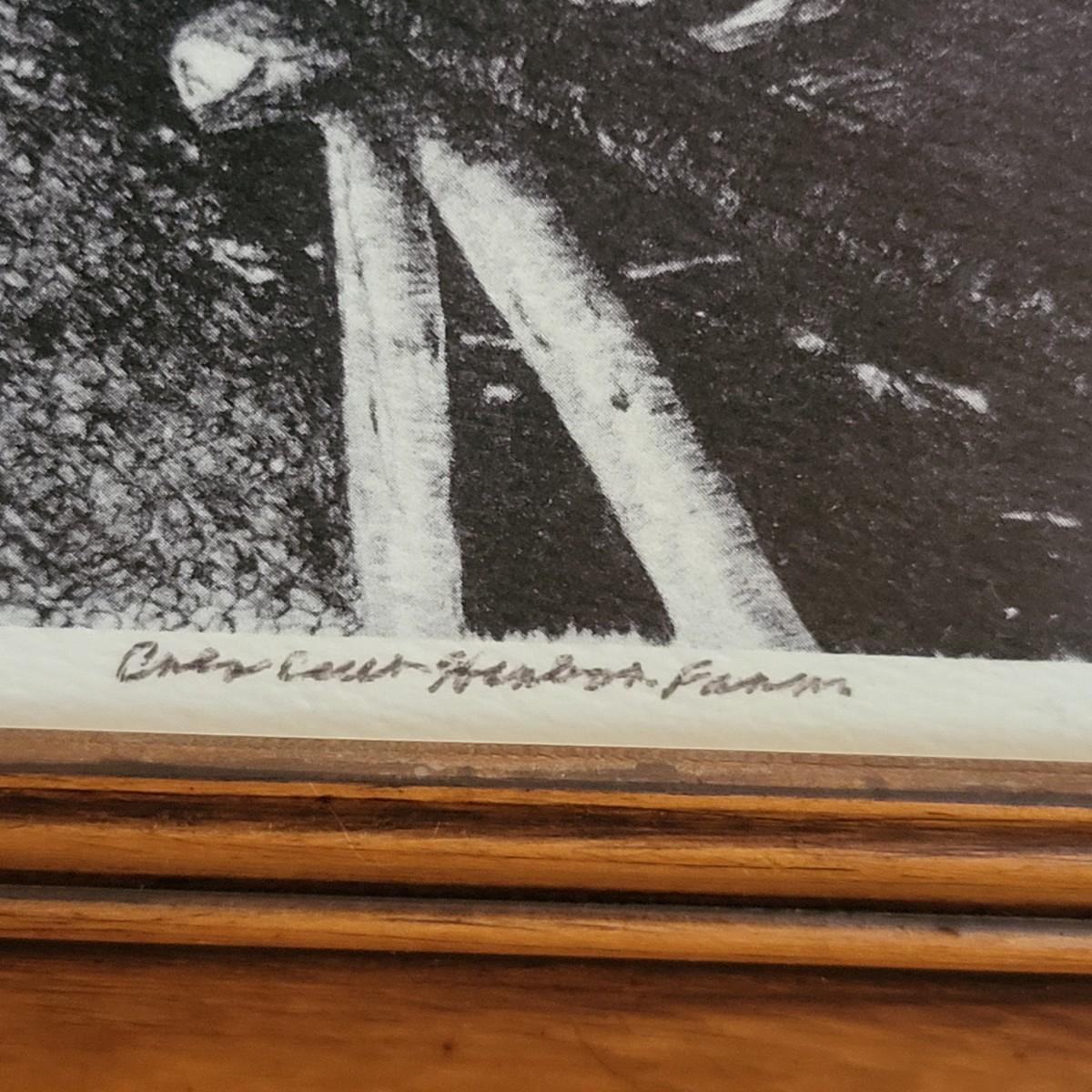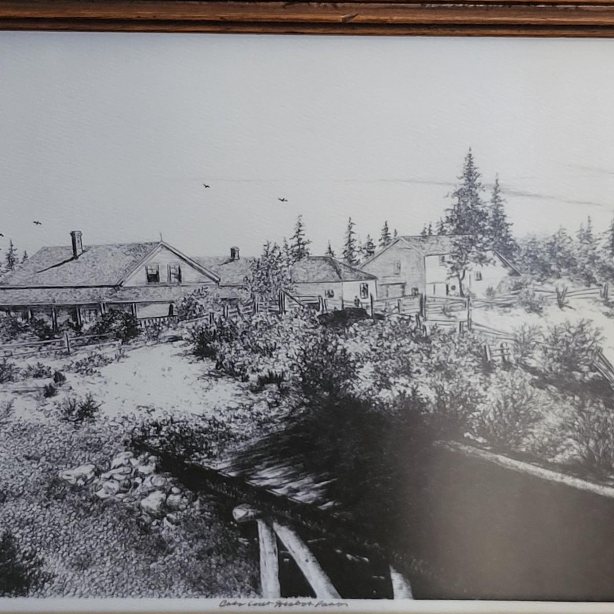 Homestead black & white etching print, Carol Olson. Antique wood frame 22" x 15".