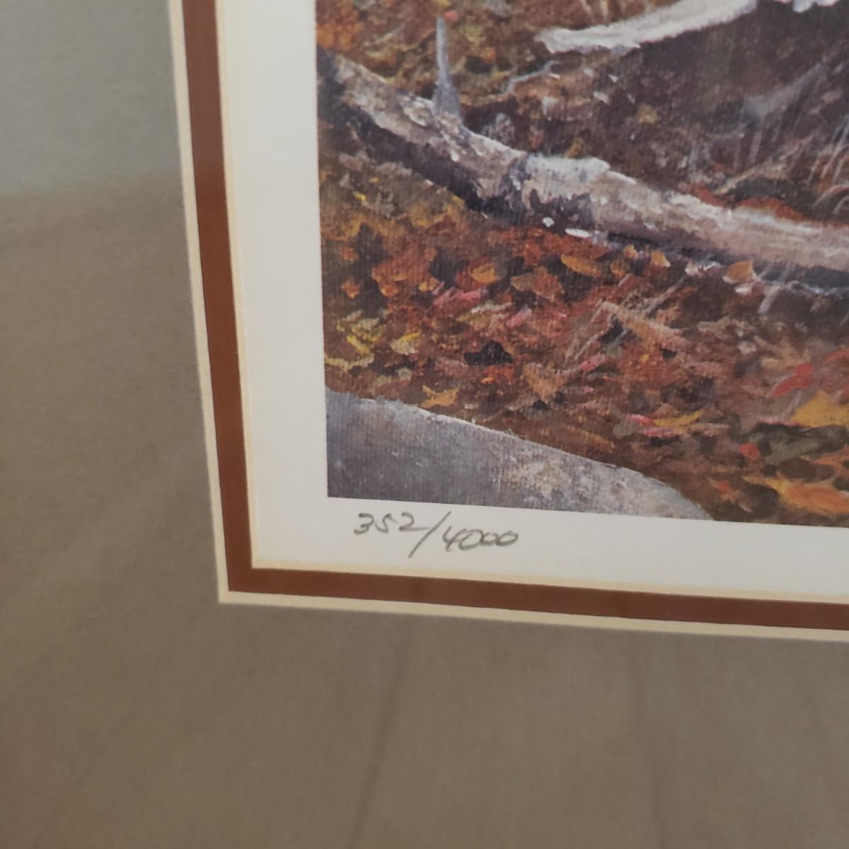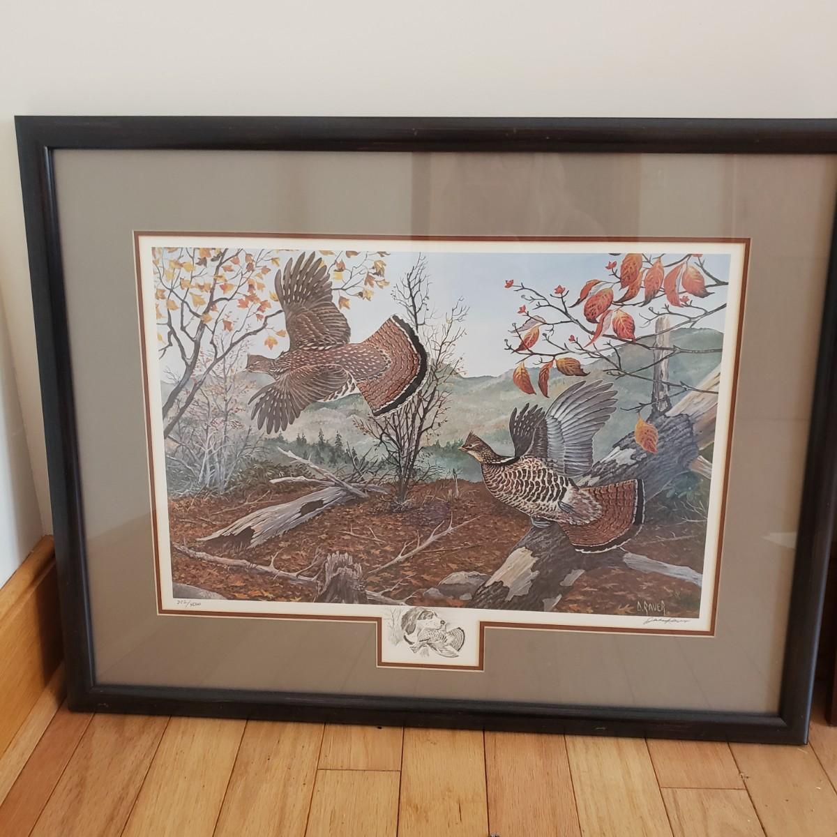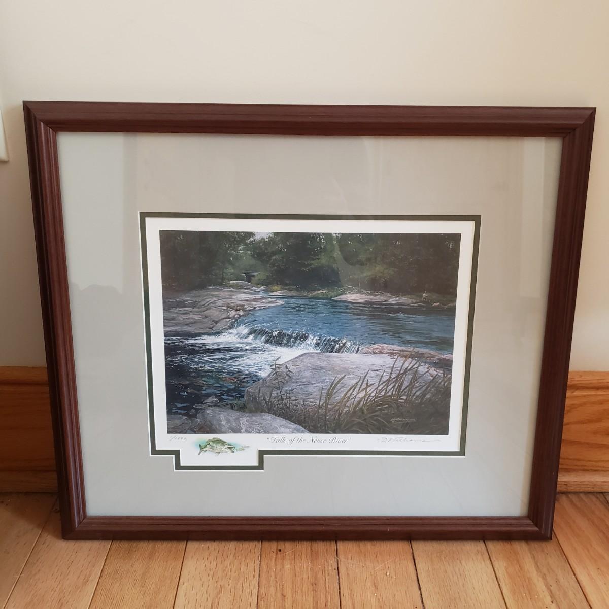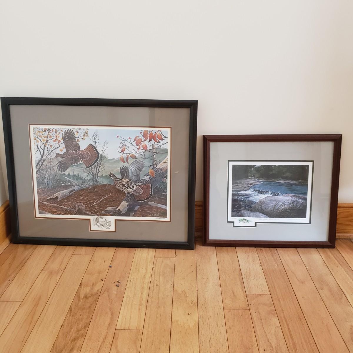 The "Falls of the Neuse River" by D. Williams #1/1000, features a small river and waterfall scene. This is in a wooden frame with glass. The larger print by D. Raver #352/4000 features two pheasants in a fall scene. The wooden frame with glass measures 28" x 22".