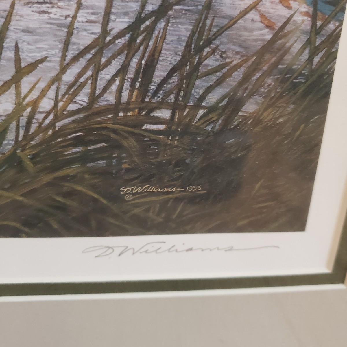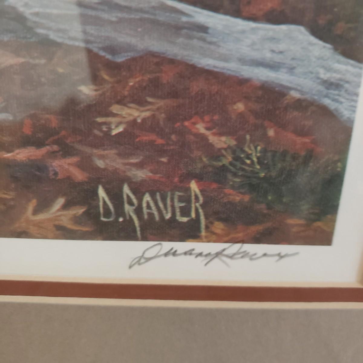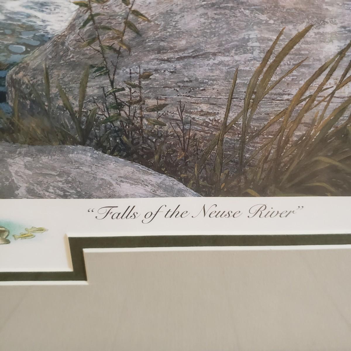 The "Falls of the Neuse River" by D. Williams #1/1000, features a small river and waterfall scene. This is in a wooden frame with glass. The larger print by D. Raver #352/4000 features two pheasants in a fall scene. The wooden frame with glass measures 28" x 22".