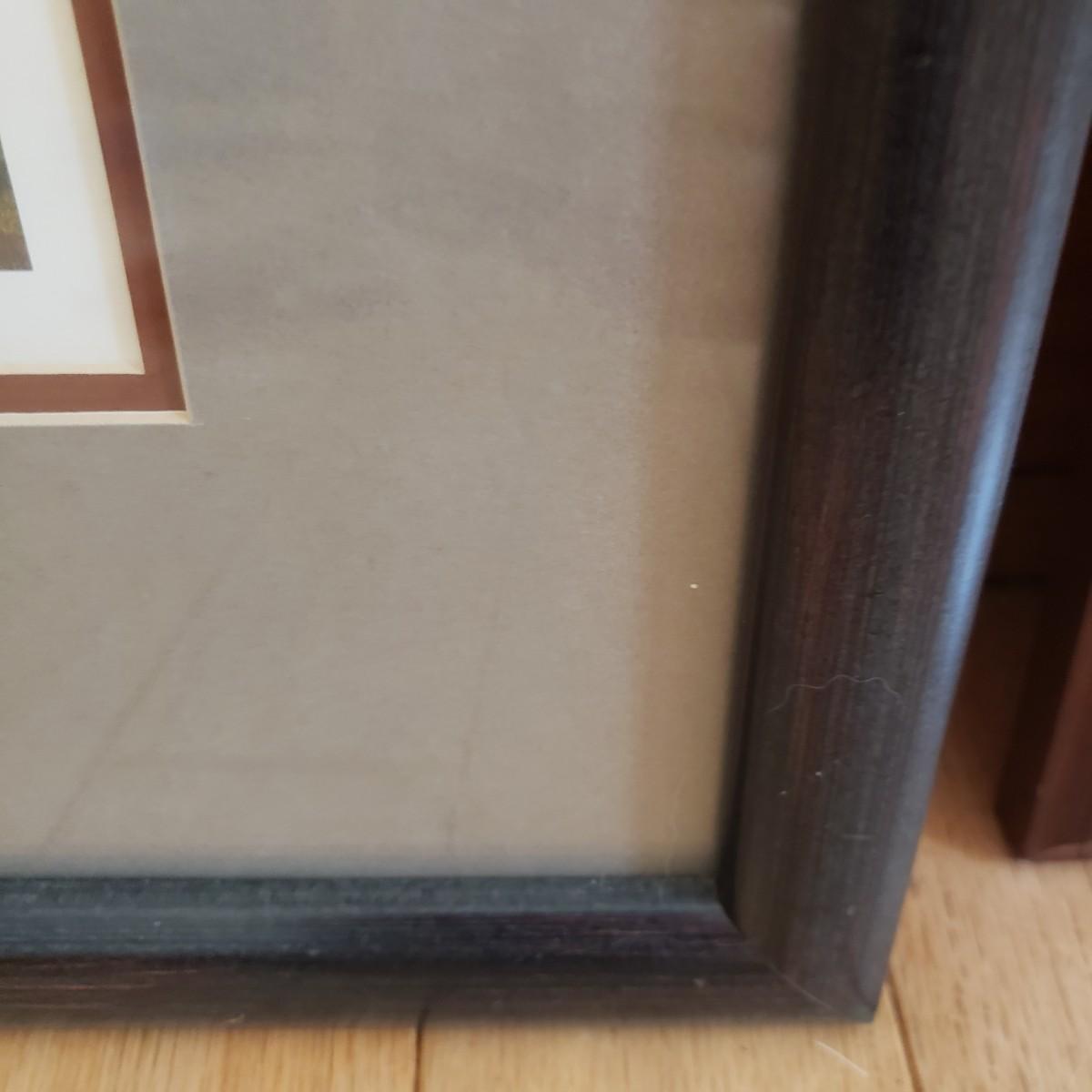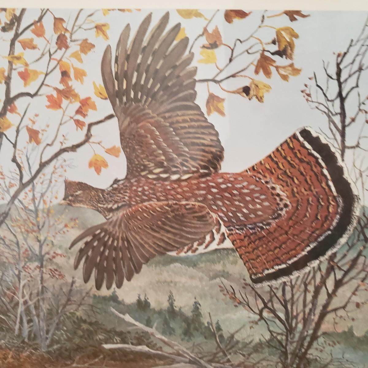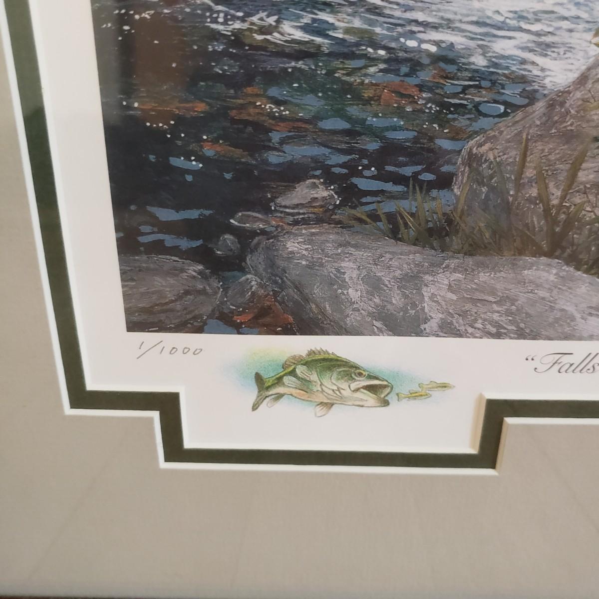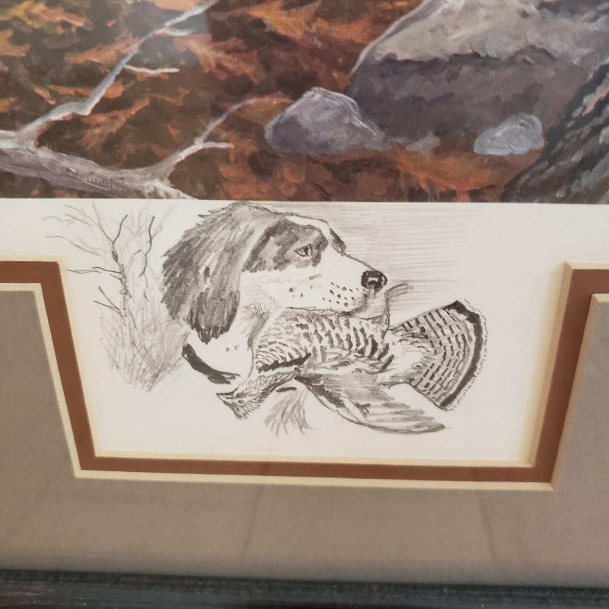 The "Falls of the Neuse River" by D. Williams #1/1000, features a small river and waterfall scene. This is in a wooden frame with glass. The larger print by D. Raver #352/4000 features two pheasants in a fall scene. The wooden frame with glass measures 28" x 22".