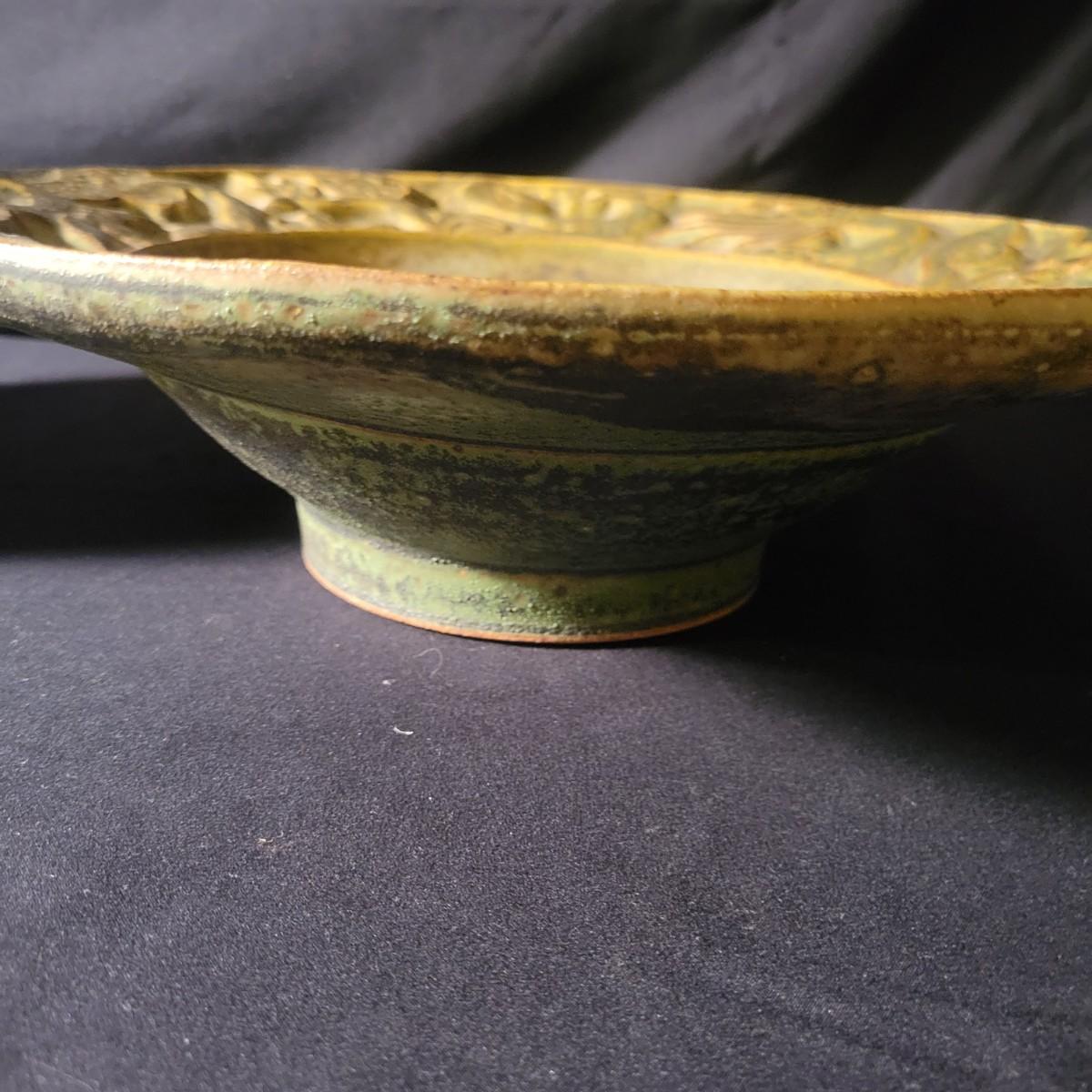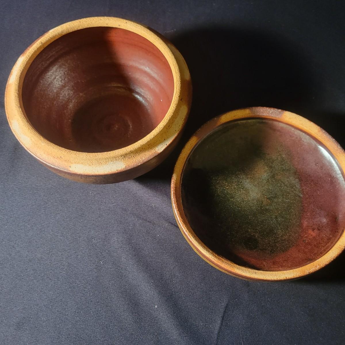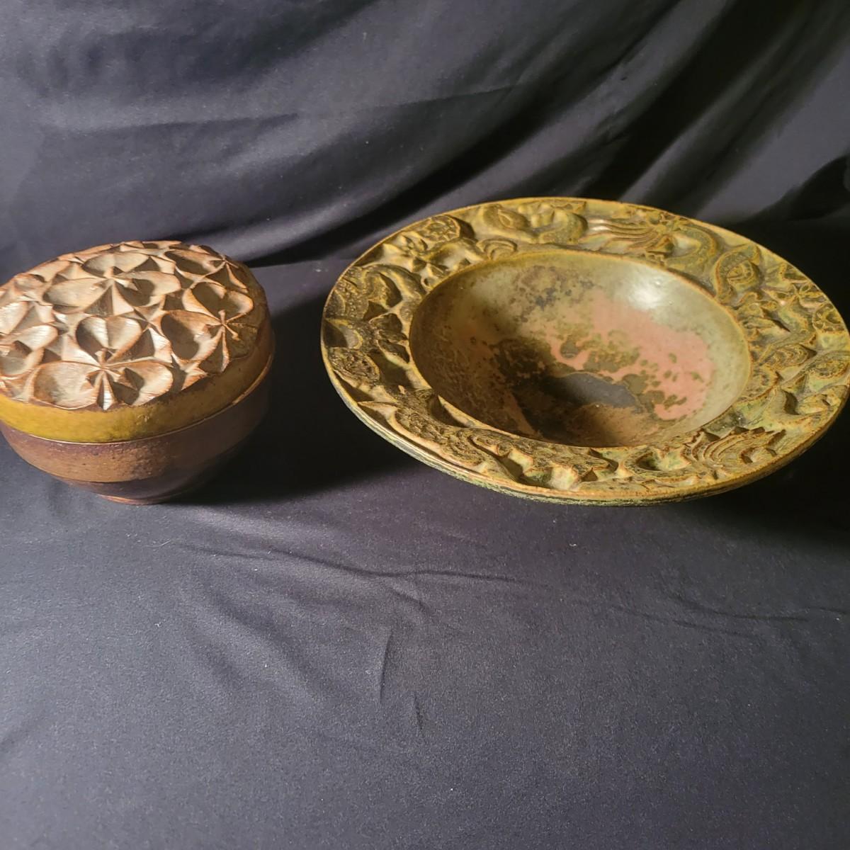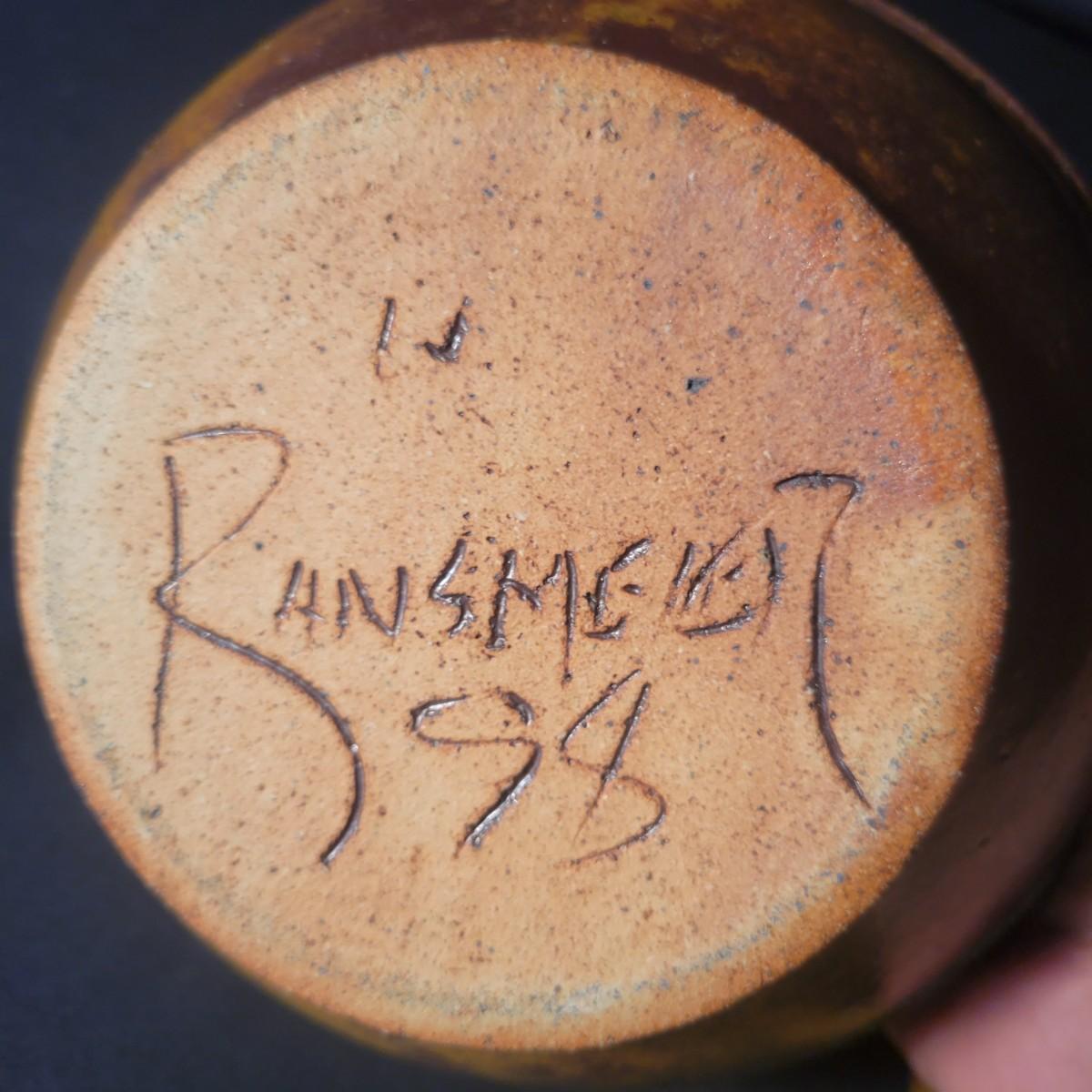 Two signed pieces of John Ransmeier pottery that are in excellent condition. These pieces by local pottery include a lidded bowl with a decorative top. The other is a large display bowl with unique designs and glaze. Larger piece measures approximately 13" x 4" Shipping available. Shipping can be costly please call UPS store at 828-252-6930 for quote