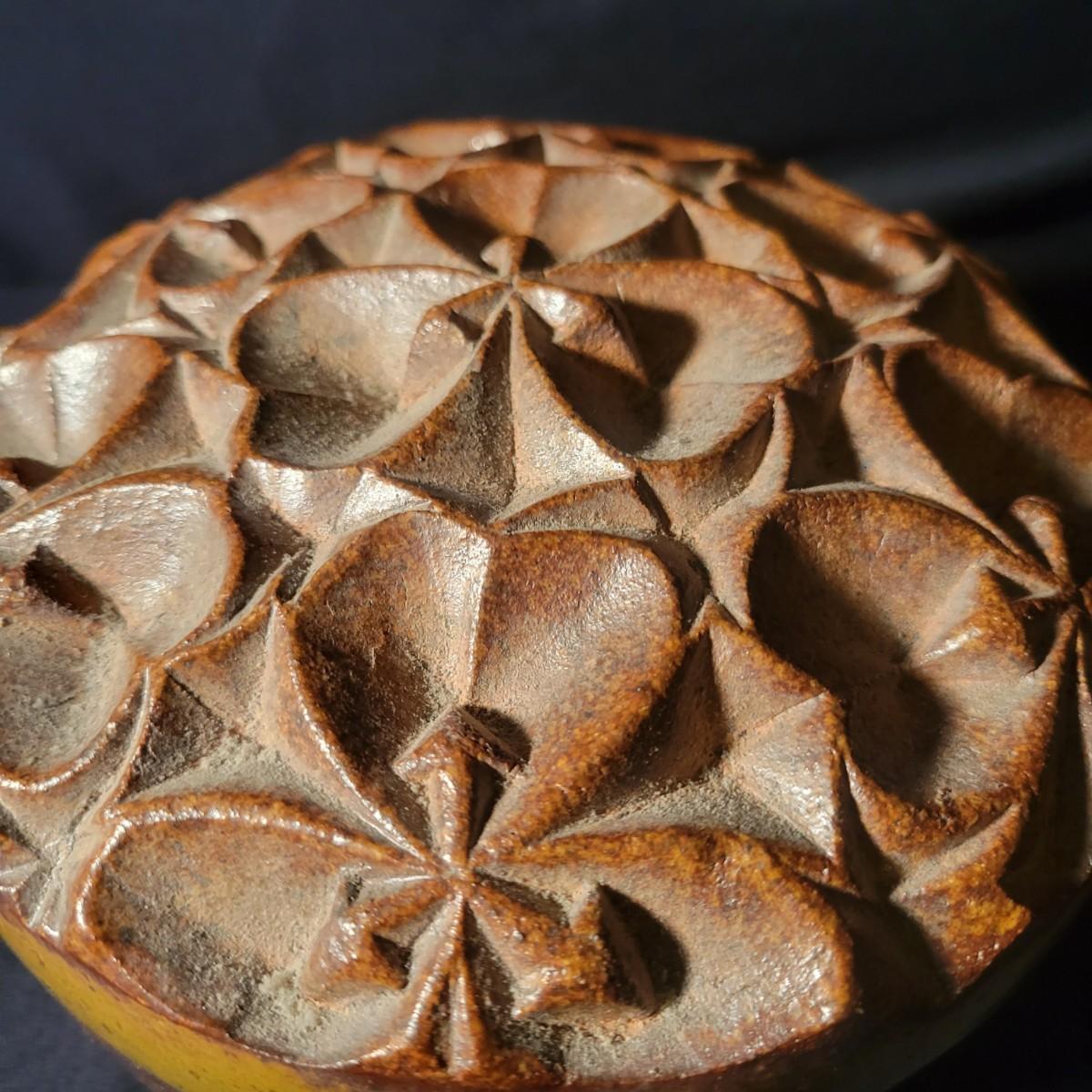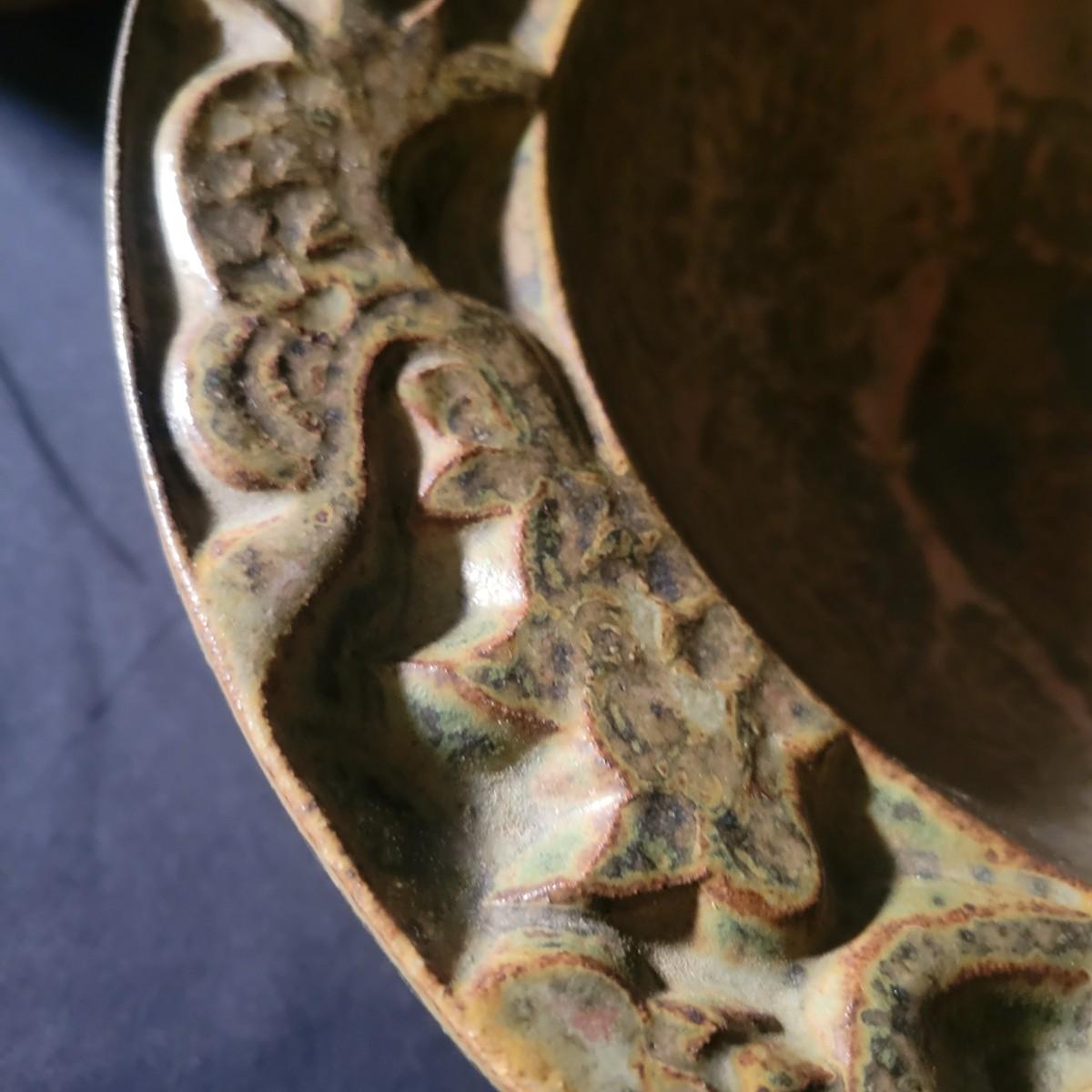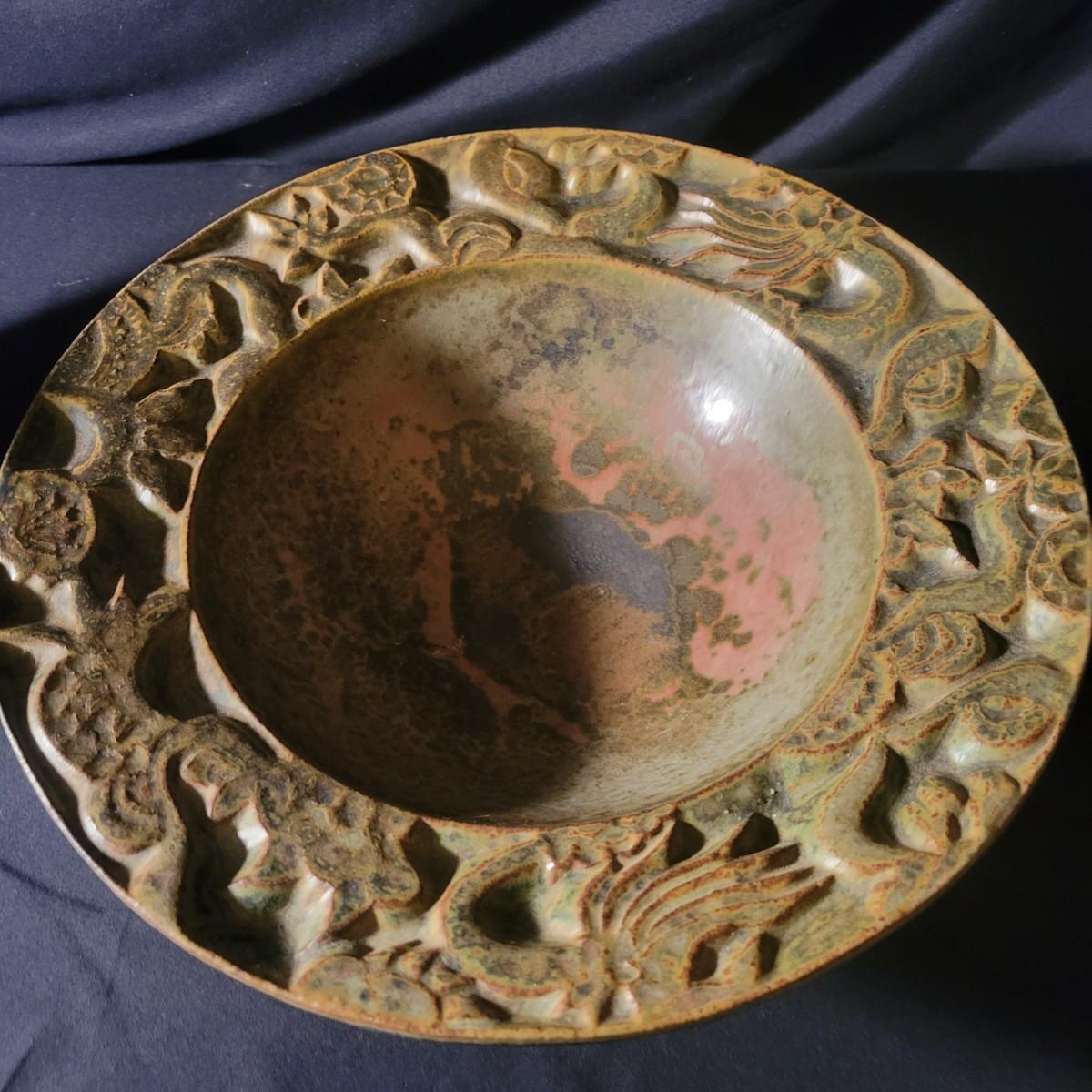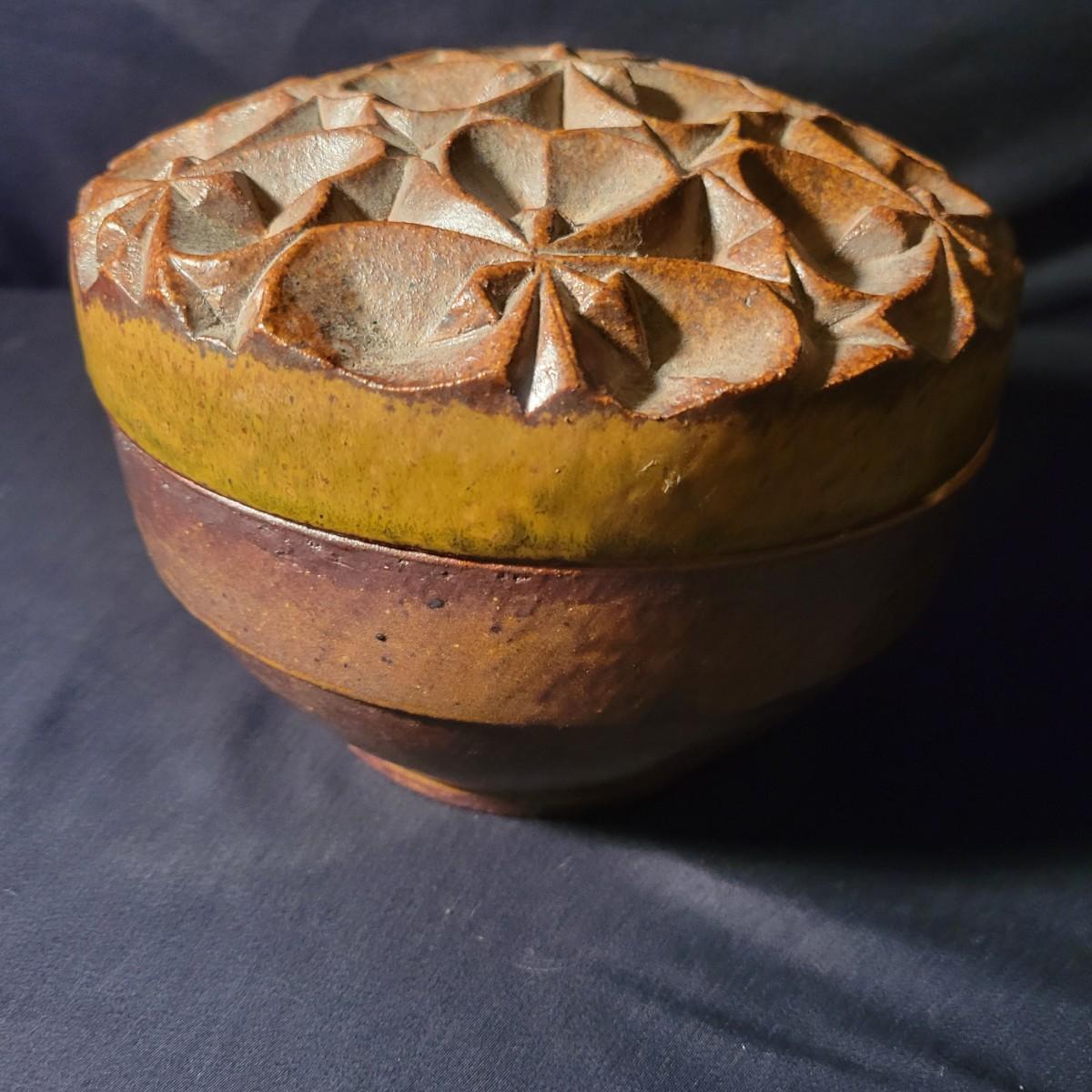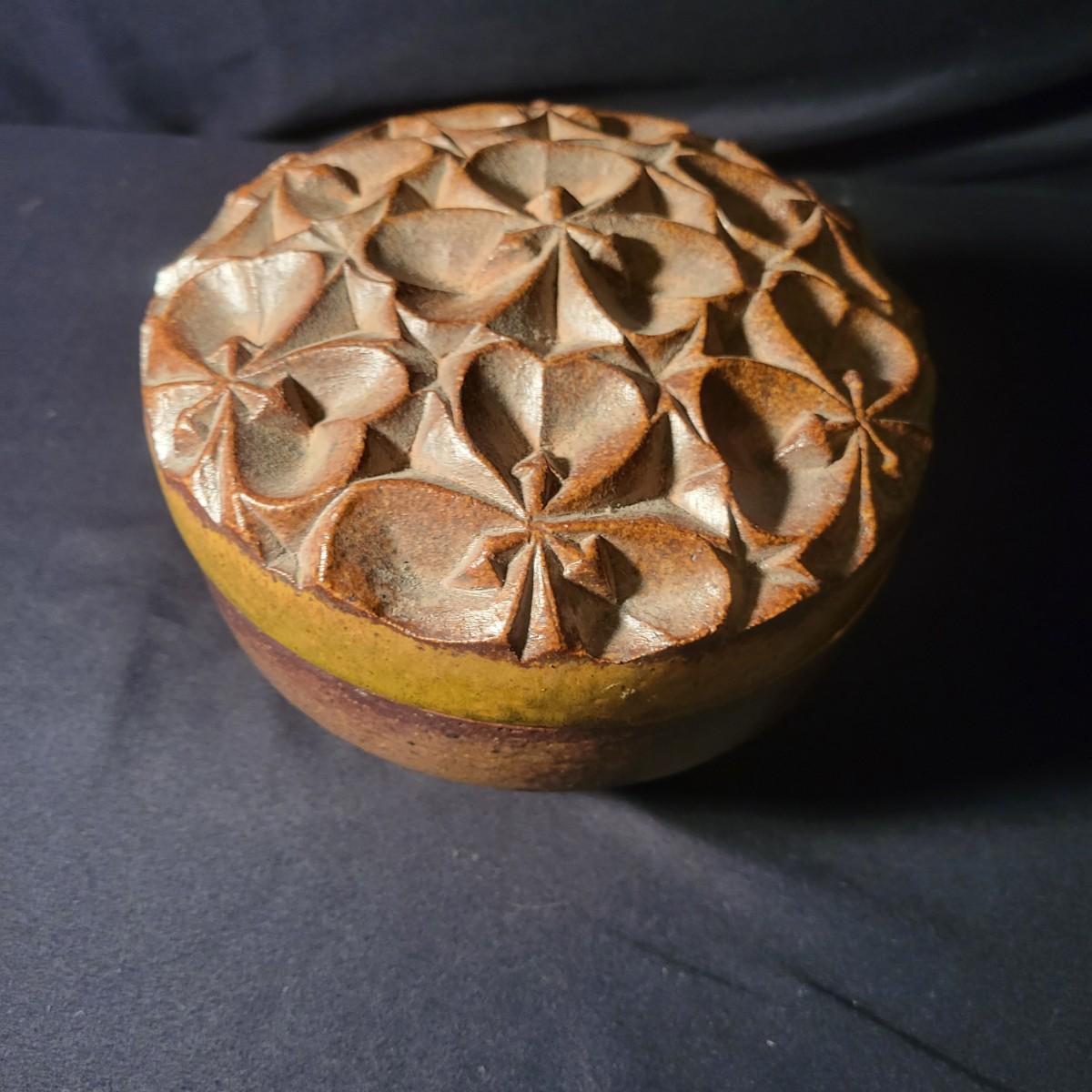 Two signed pieces of John Ransmeier pottery that are in excellent condition. These pieces by local pottery include a lidded bowl with a decorative top. The other is a large display bowl with unique designs and glaze. Larger piece measures approximately 13" x 4" Shipping available. Shipping can be costly please call UPS store at 828-252-6930 for quote