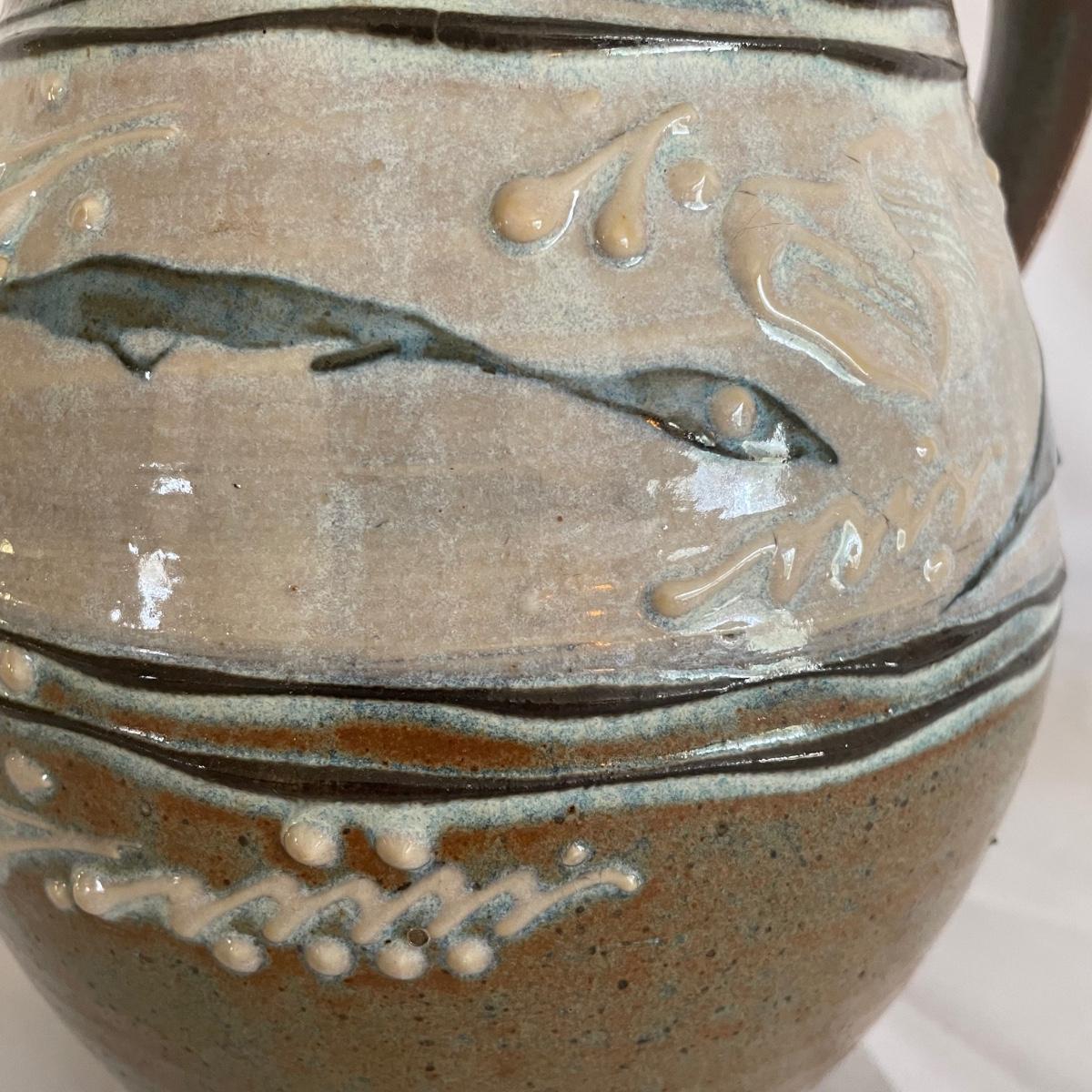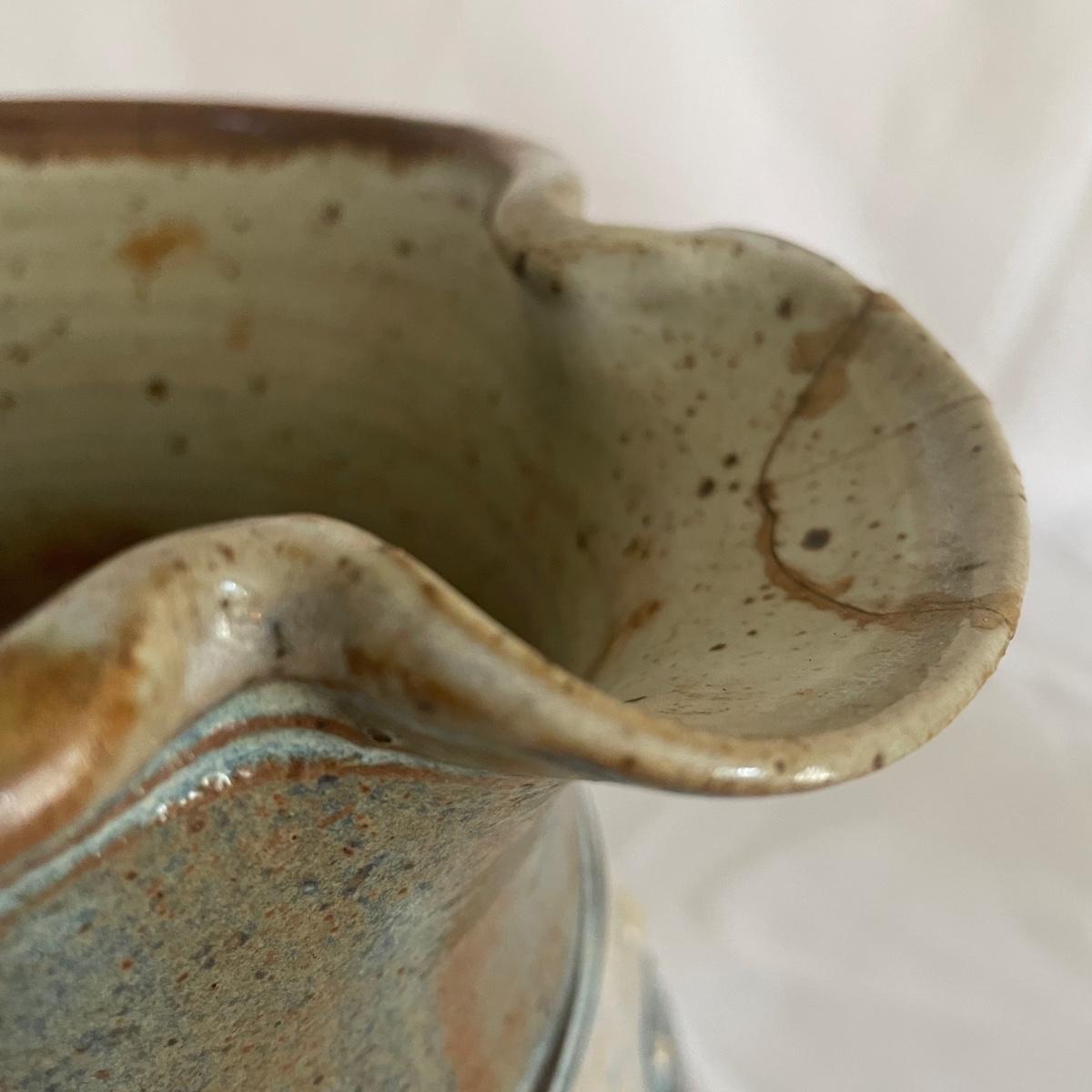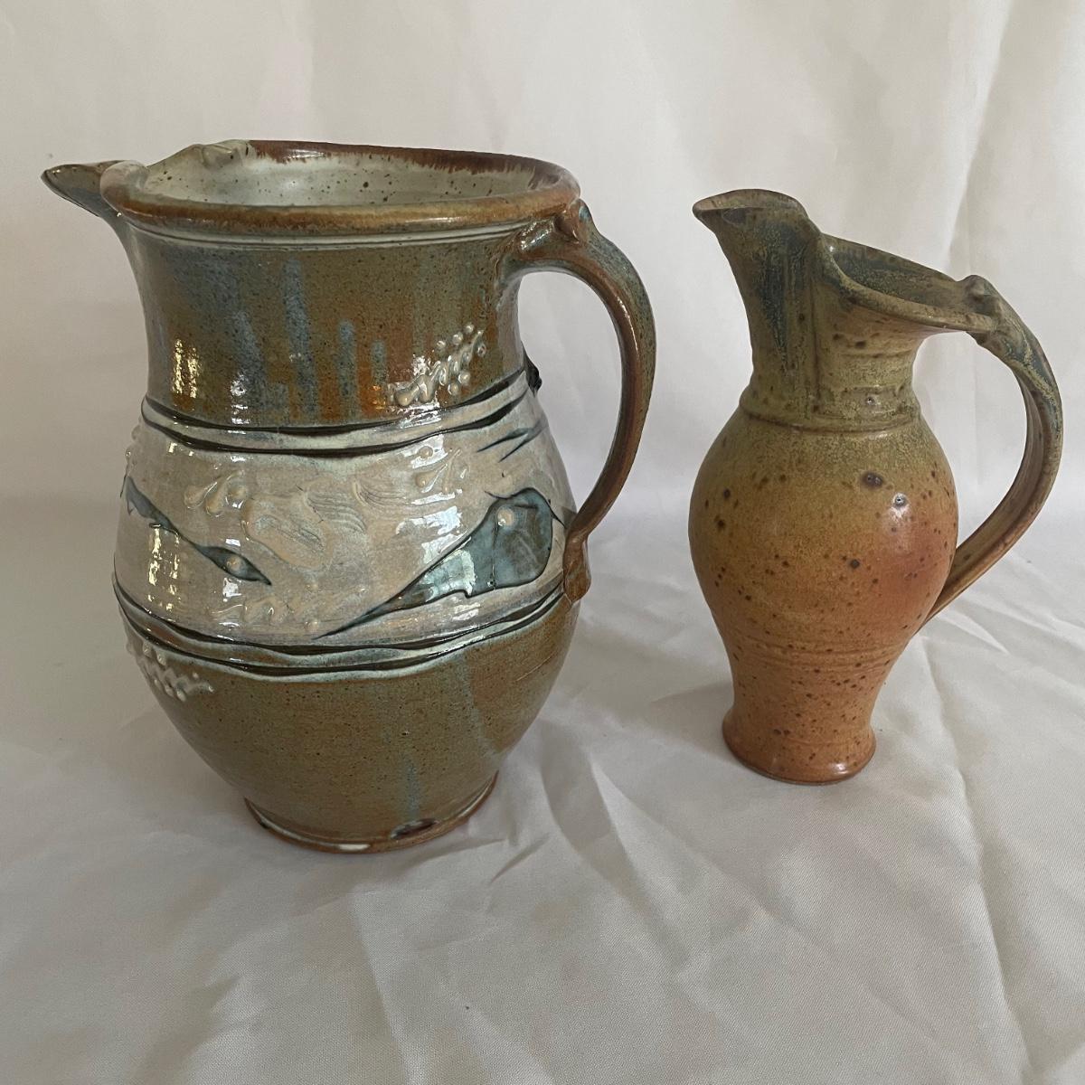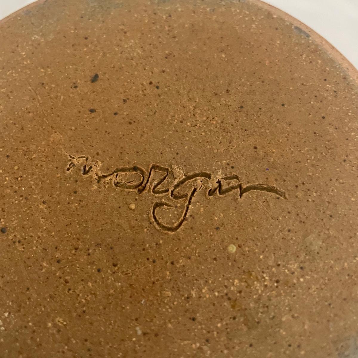 The larger of these two pottery pitchers (measures 6” d x 9.5” tall) is signed "Morgan"; it’s a speckled stoneware clay with slip detailing under an iridescent stripe of glaze around the middle. It has a crack in the spout area that was fixed with glue. The smaller pitcher is signed also but signature is indecipherable. Shipping Available