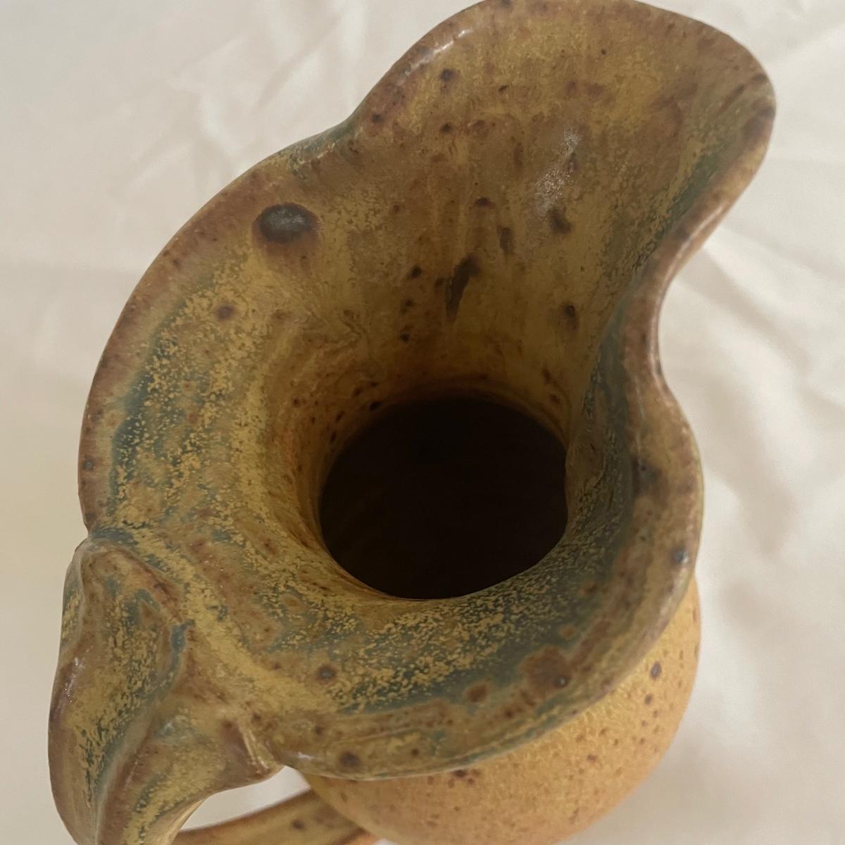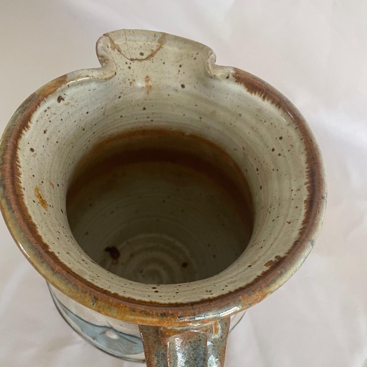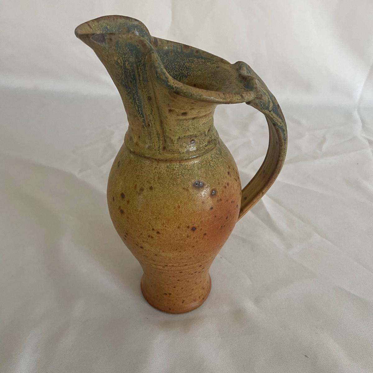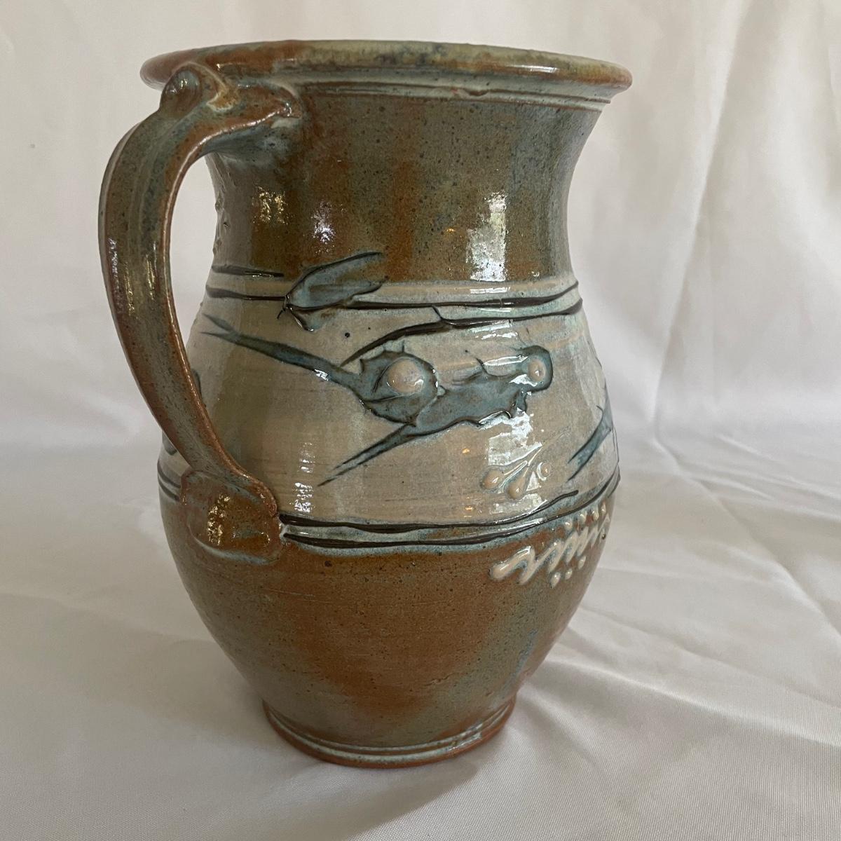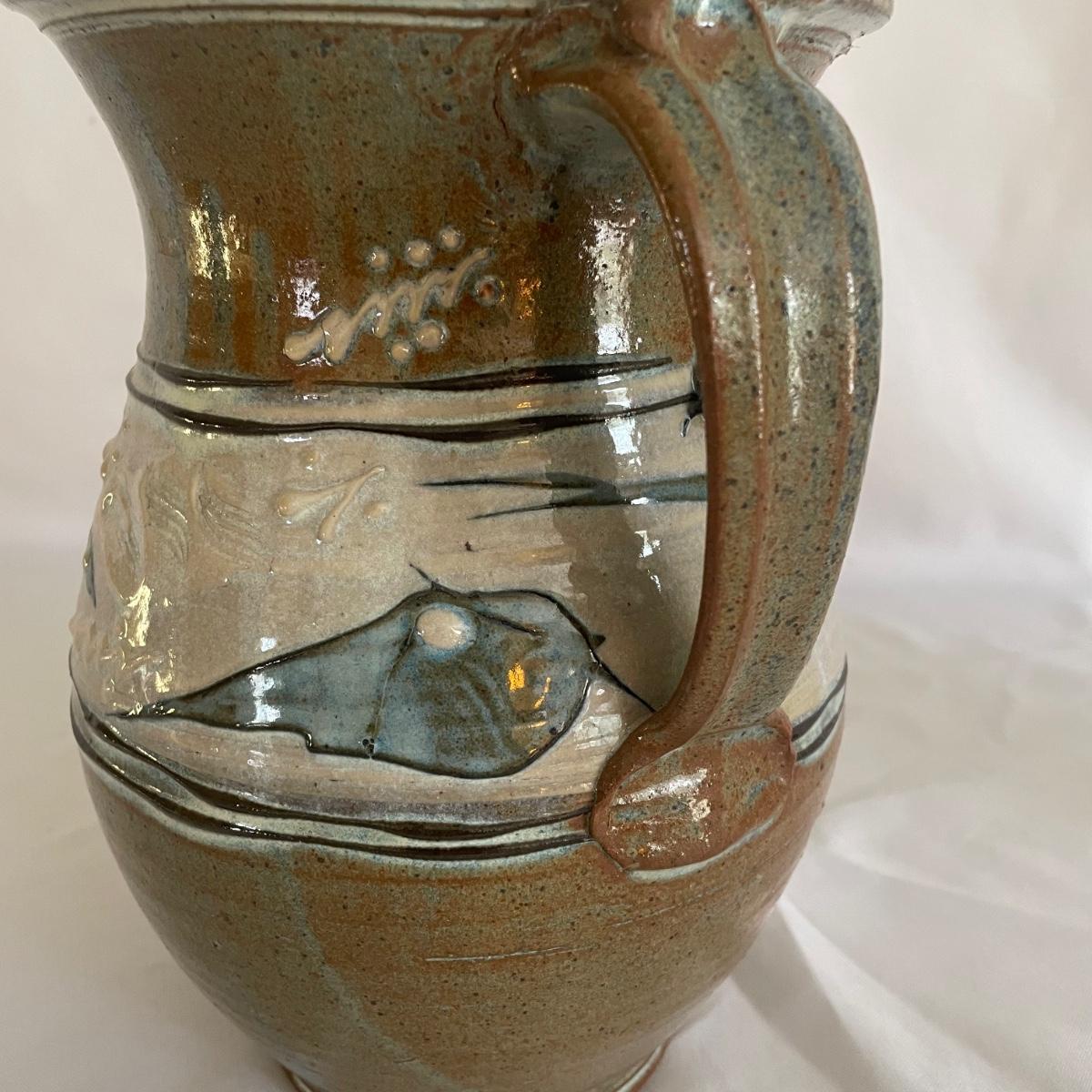 The larger of these two pottery pitchers (measures 6” d x 9.5” tall) is signed "Morgan"; it’s a speckled stoneware clay with slip detailing under an iridescent stripe of glaze around the middle. It has a crack in the spout area that was fixed with glue. The smaller pitcher is signed also but signature is indecipherable. Shipping Available