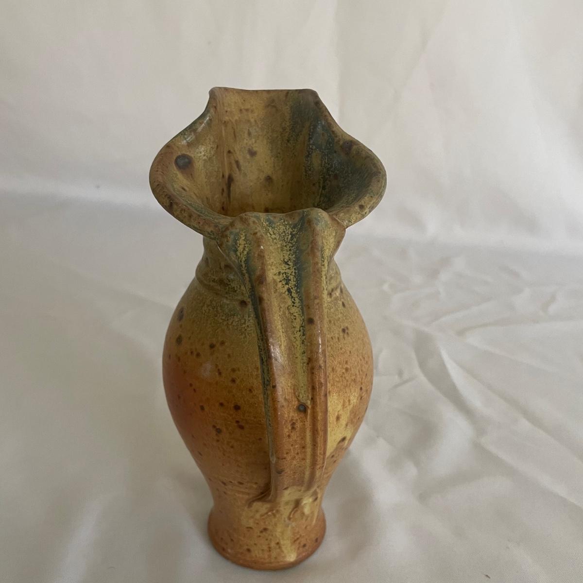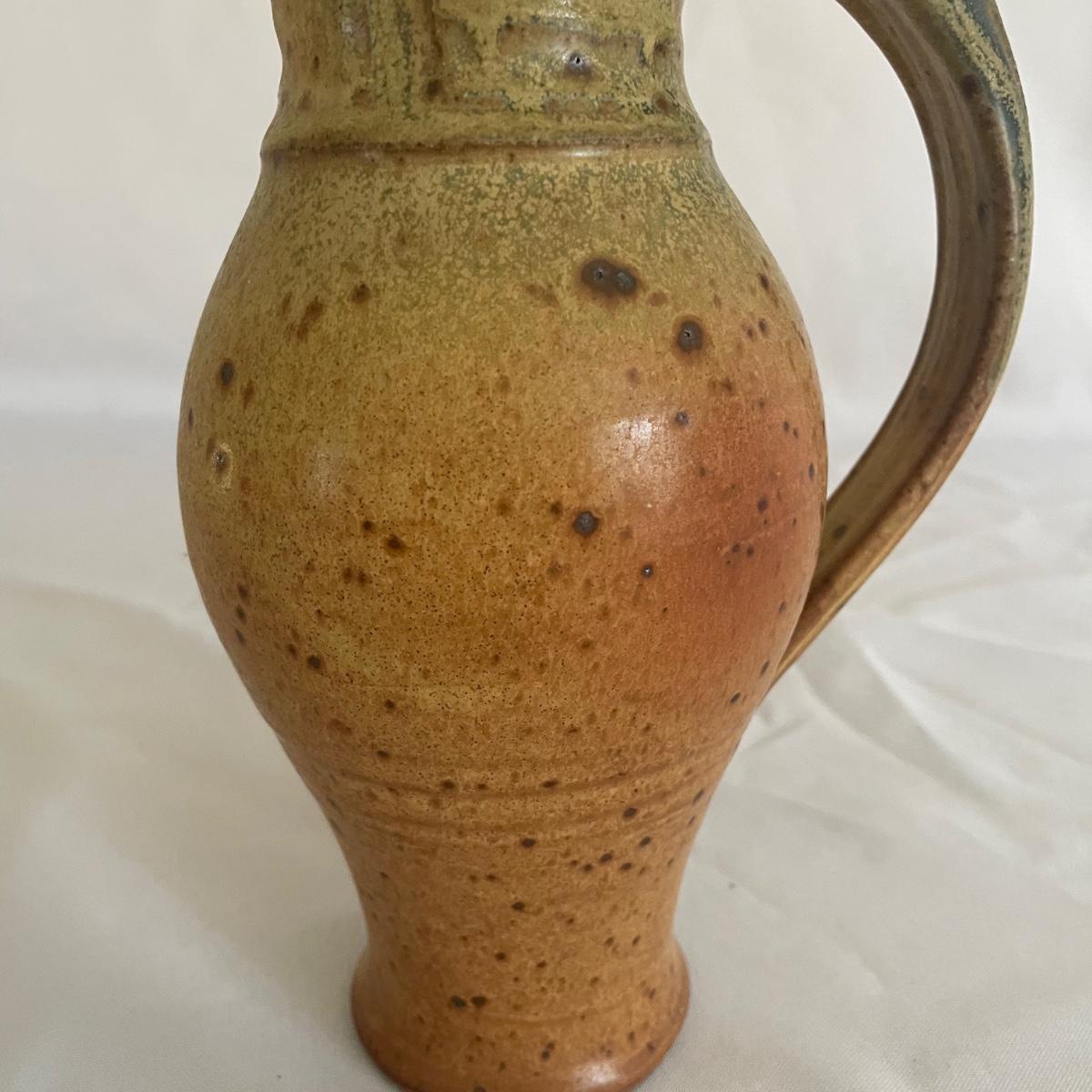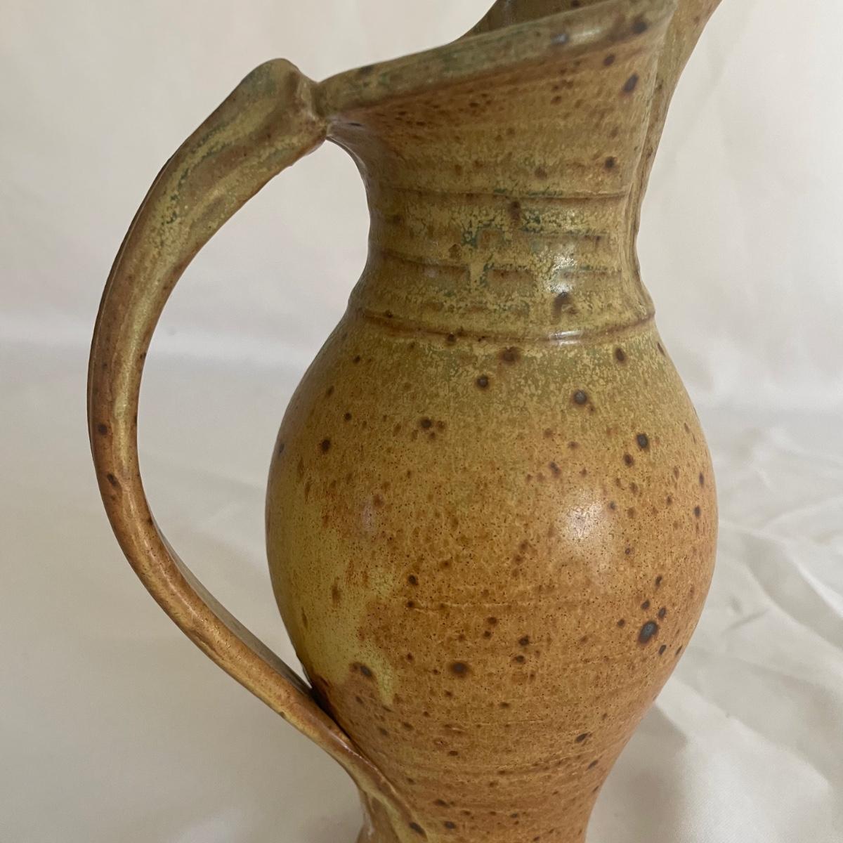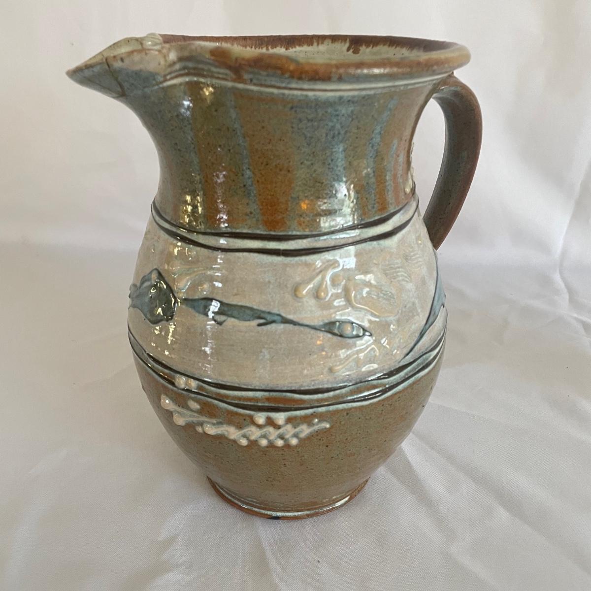 The larger of these two pottery pitchers (measures 6” d x 9.5” tall) is signed "Morgan"; it’s a speckled stoneware clay with slip detailing under an iridescent stripe of glaze around the middle. It has a crack in the spout area that was fixed with glue. The smaller pitcher is signed also but signature is indecipherable. Shipping Available