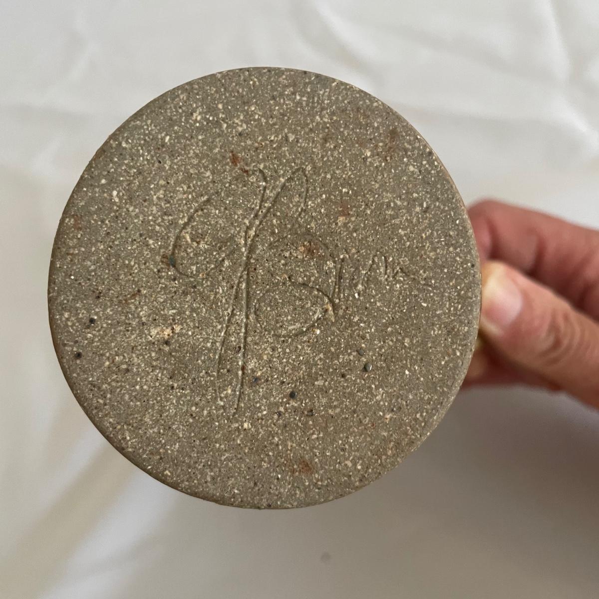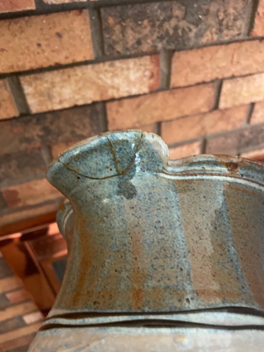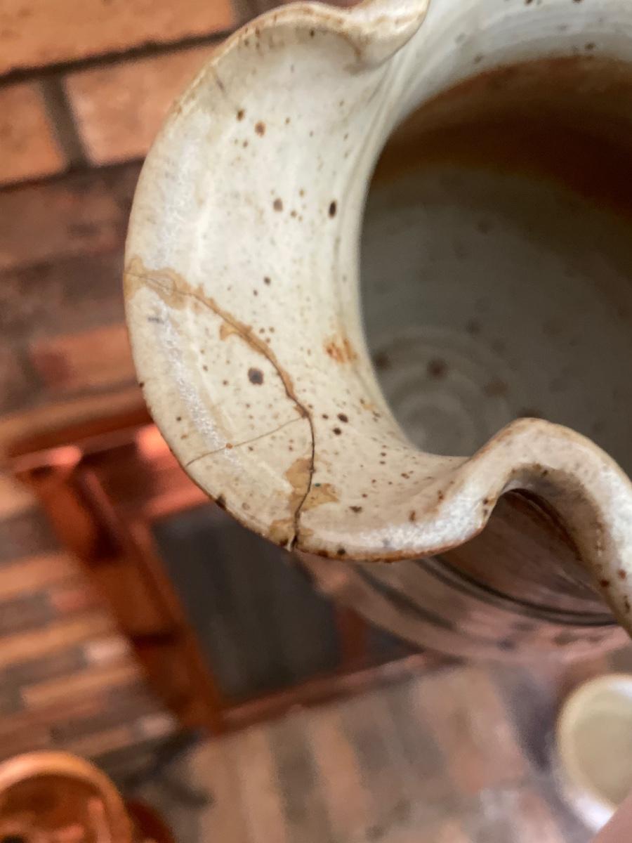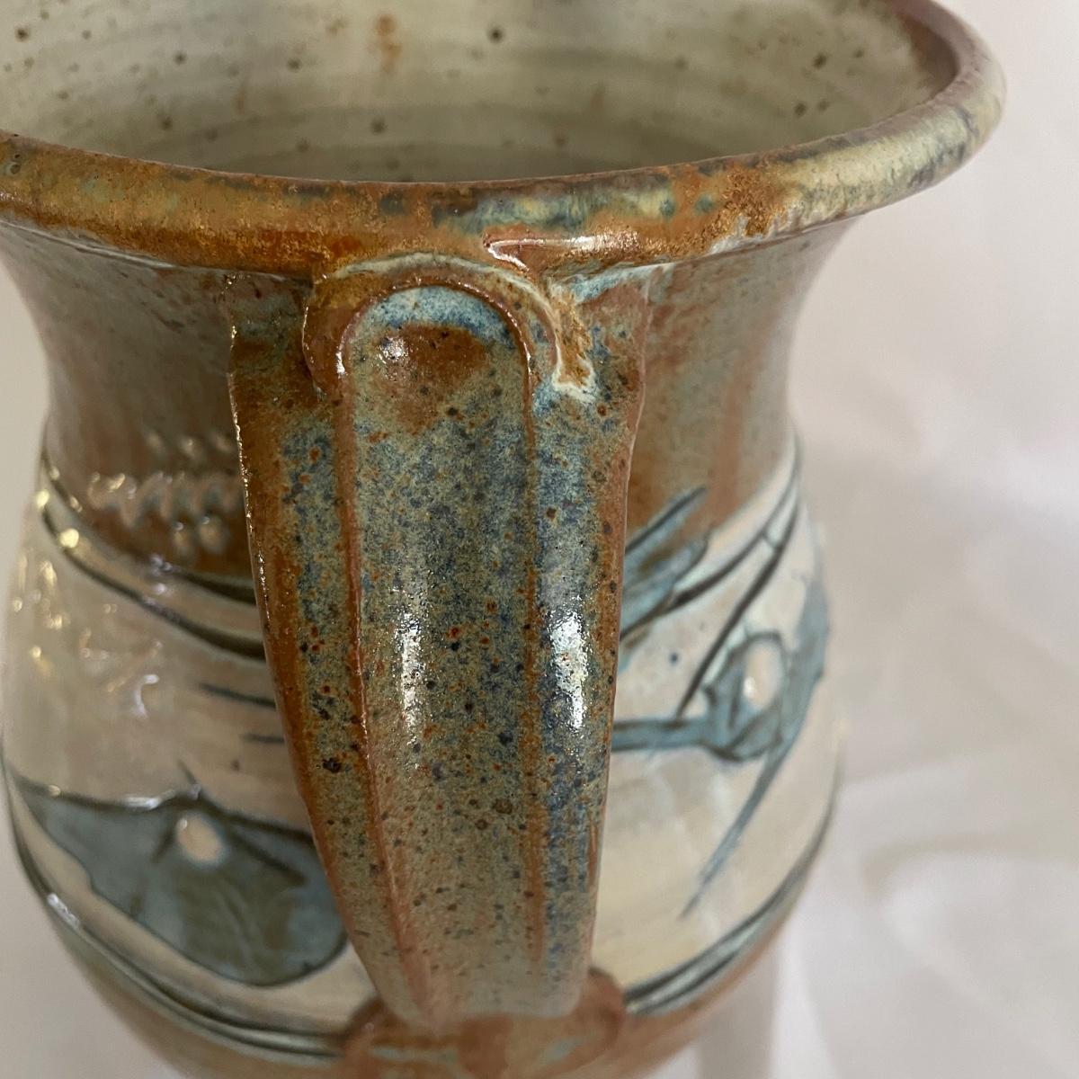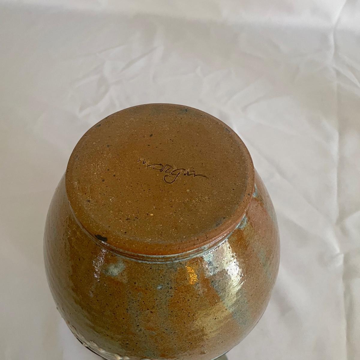 The larger of these two pottery pitchers (measures 6” d x 9.5” tall) is signed "Morgan"; it’s a speckled stoneware clay with slip detailing under an iridescent stripe of glaze around the middle. It has a crack in the spout area that was fixed with glue. The smaller pitcher is signed also but signature is indecipherable. Shipping Available