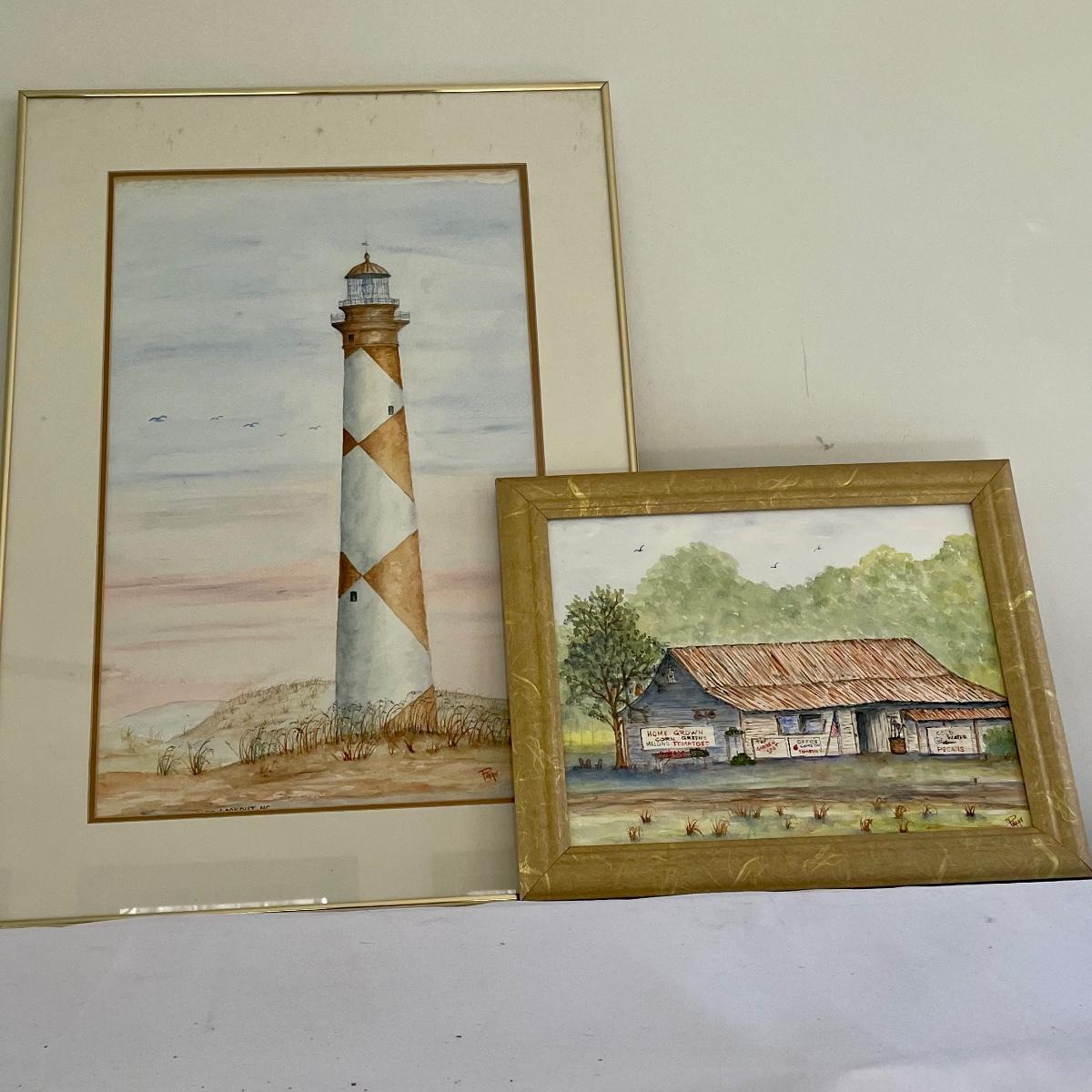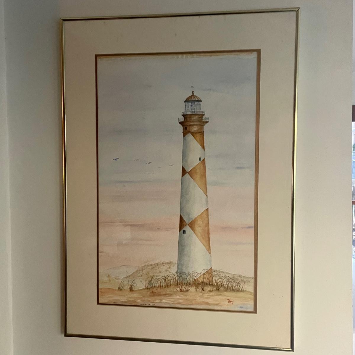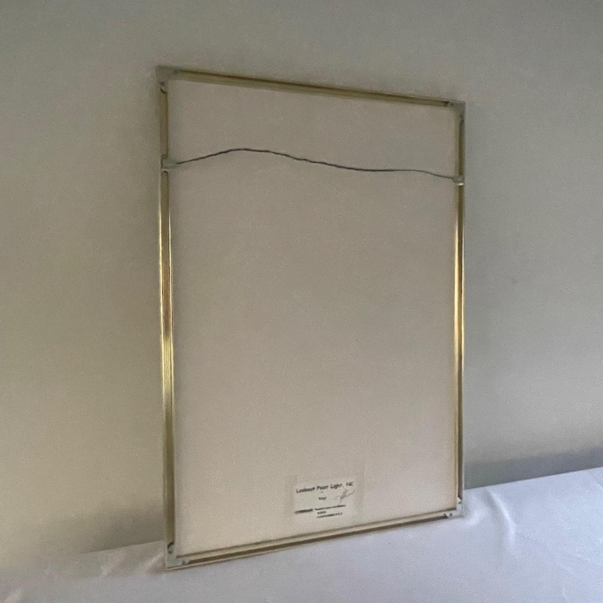 Lighthouse piece is titled Cape Lookout, NC and its golden metal frame measures 20” x 28”. Smaller frame for piece titled Americana is a gold colored resin like material.