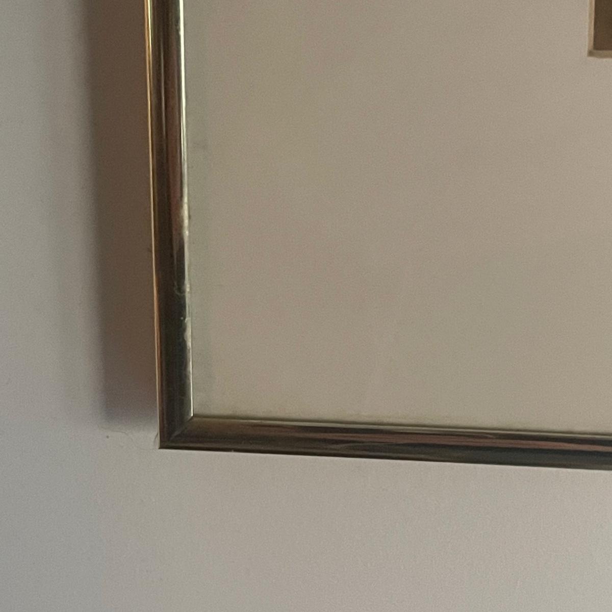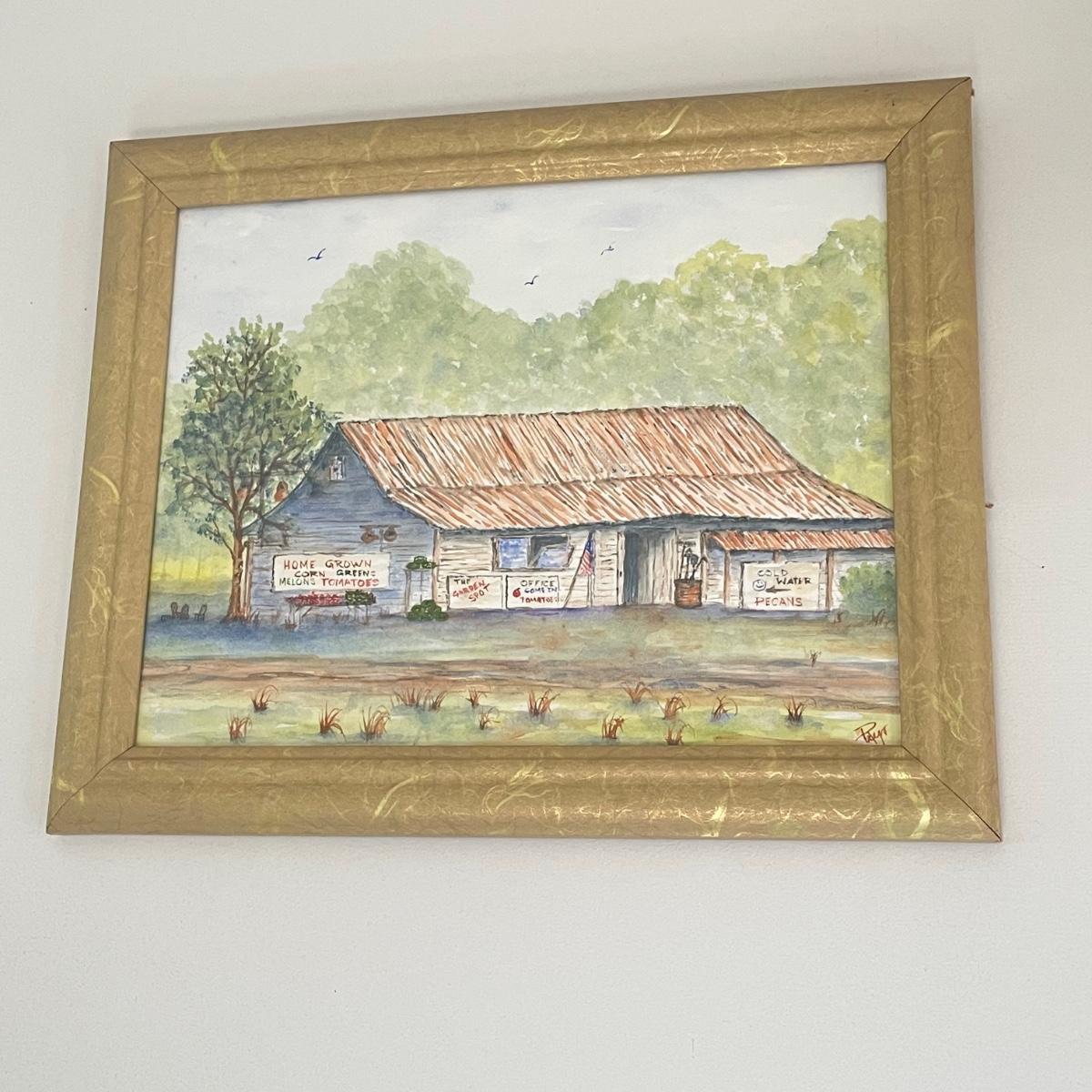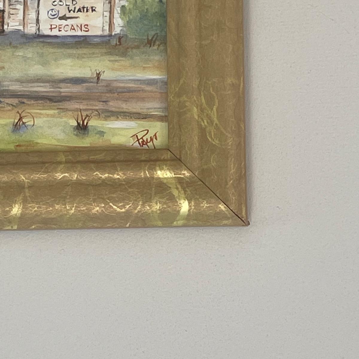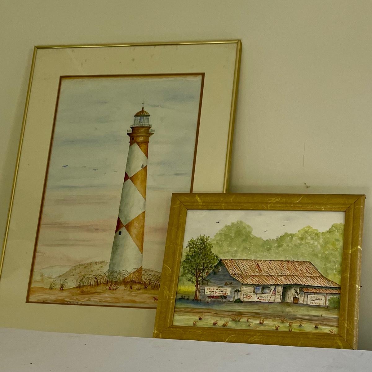 Lighthouse piece is titled Cape Lookout, NC and its golden metal frame measures 20” x 28”. Smaller frame for piece titled Americana is a gold colored resin like material.