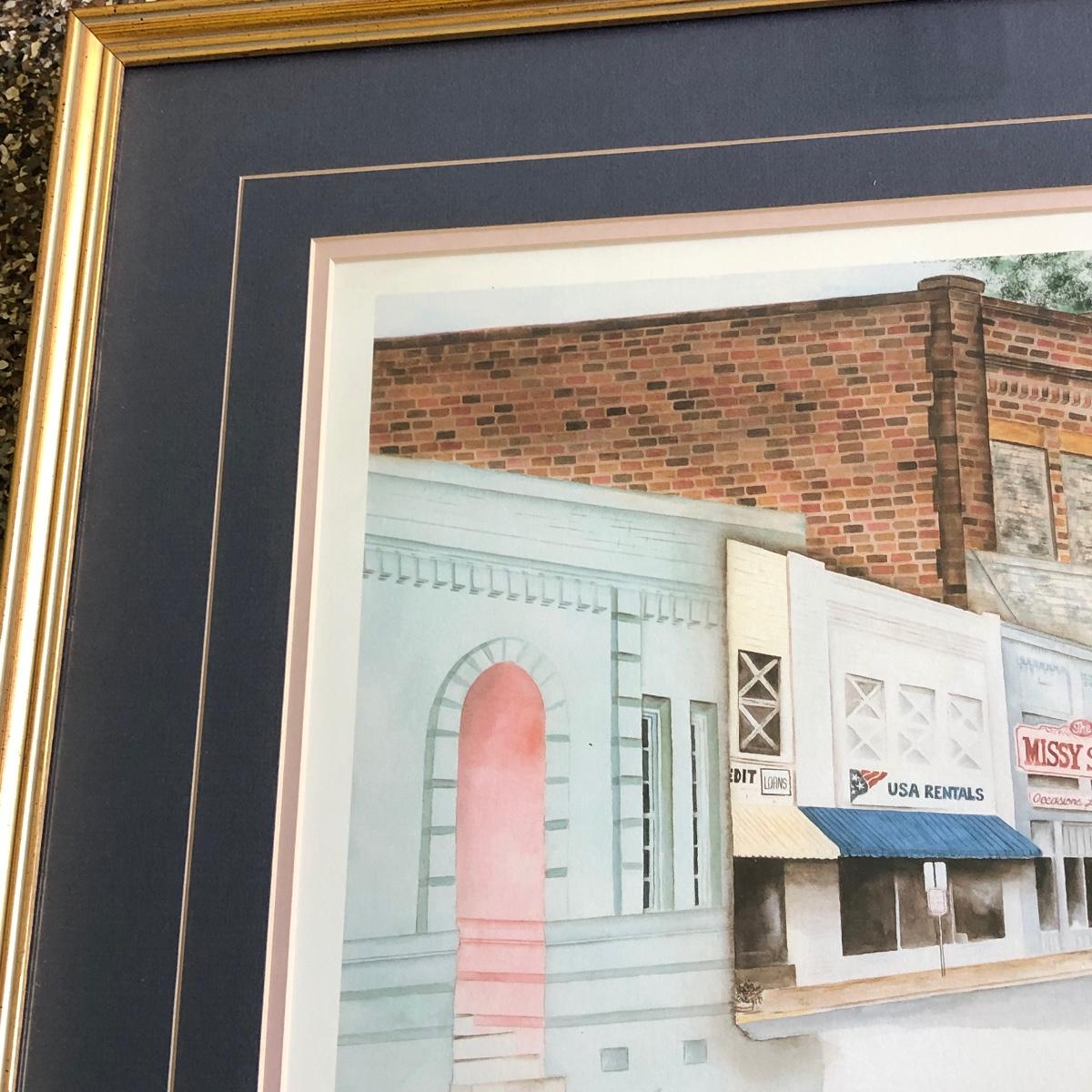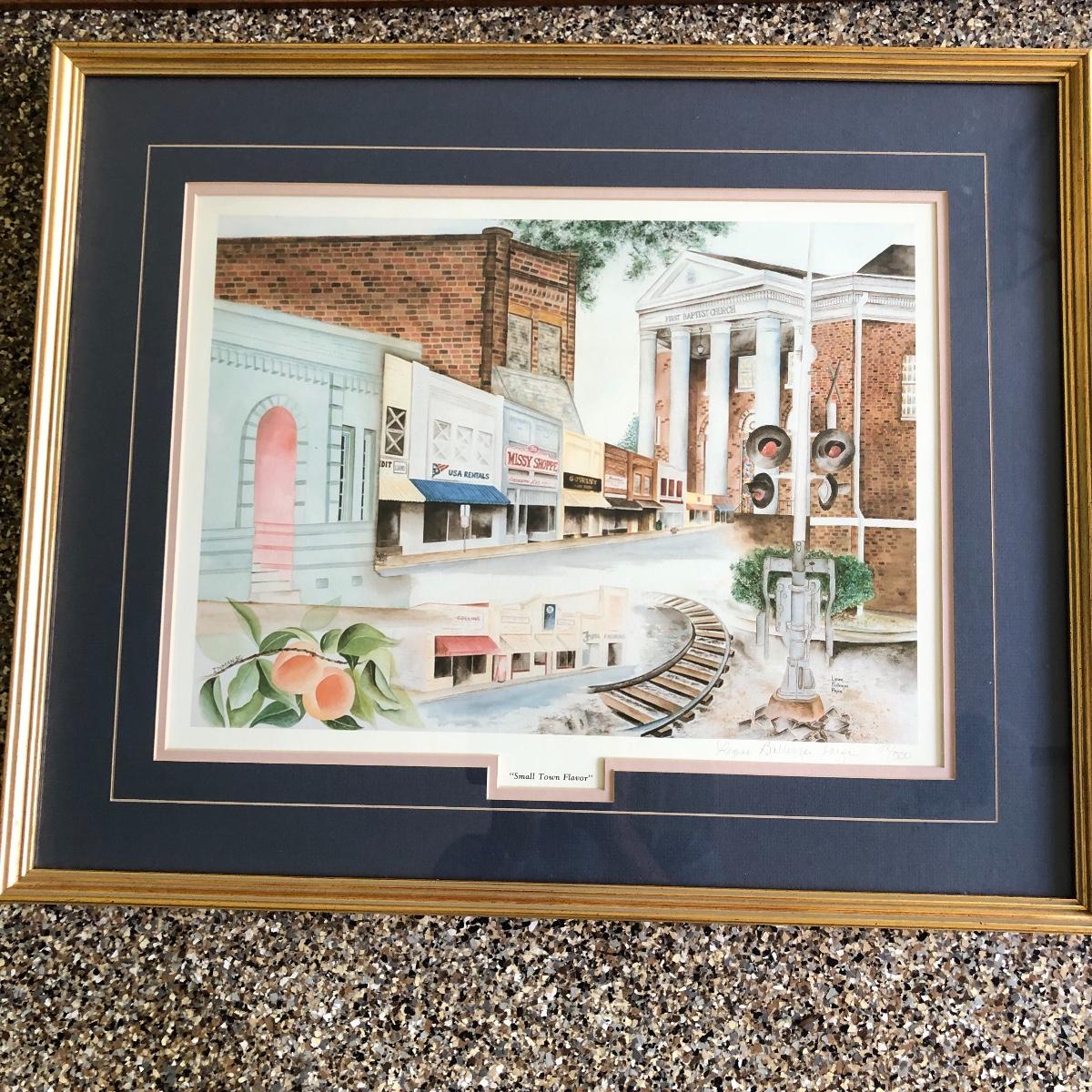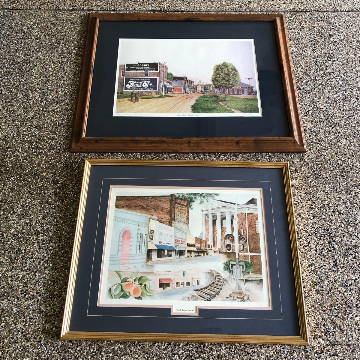 This lot includes two signed prints. Note both pencil signatures. “Small Town Flavor” measures 26.5” x 21.5”. Note the matting on this print. “Main Street Inman 1910” measures 32” x 26”. Both prints are framed in glass. Shipping Available. Please call UPS for a shipping estimate as shipping Art can be costly.