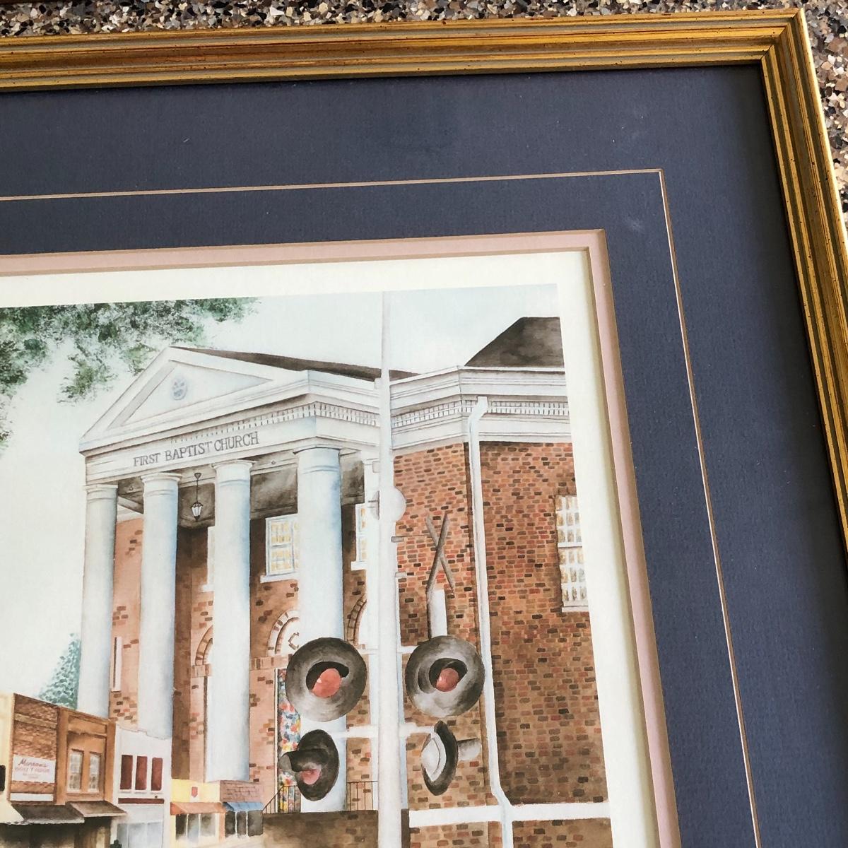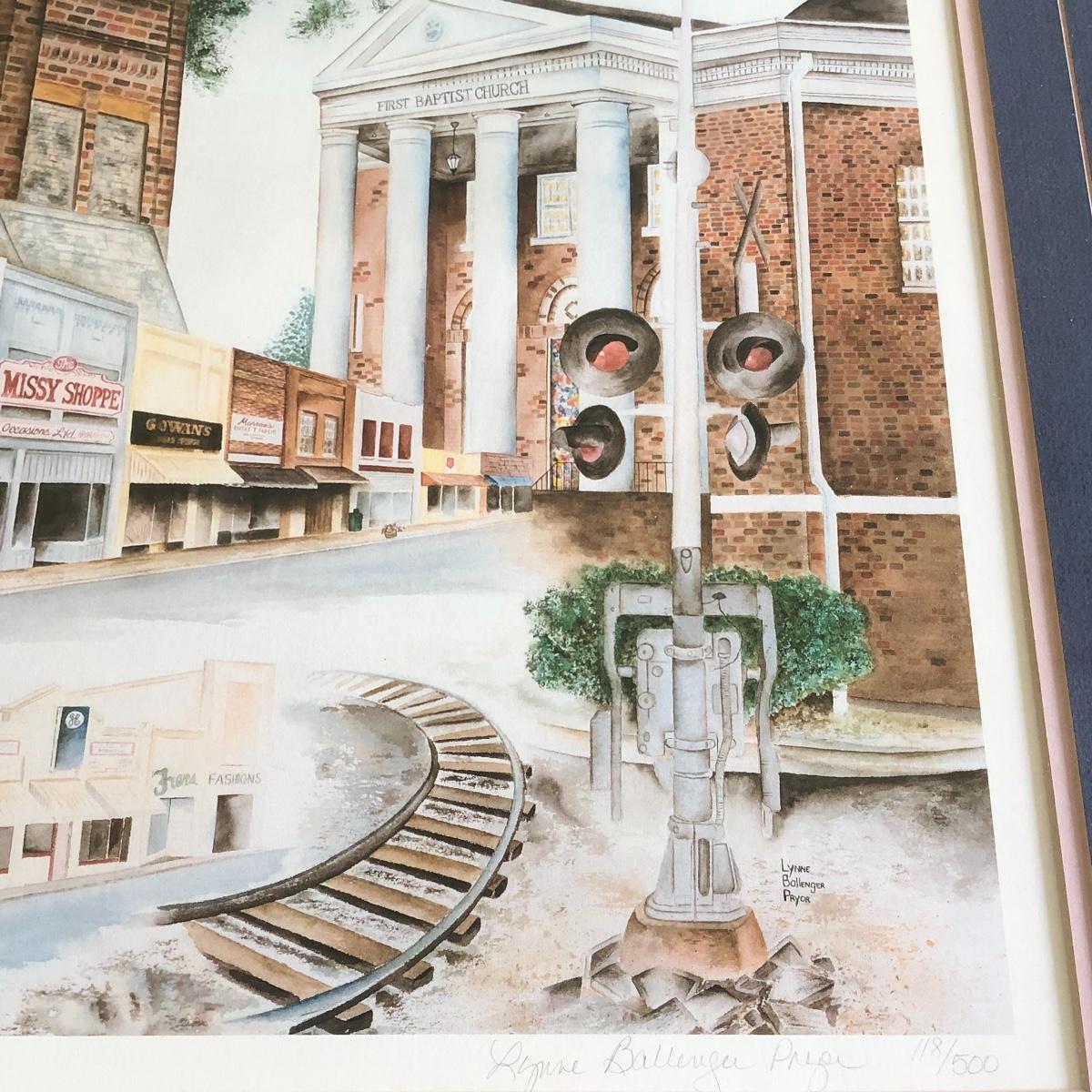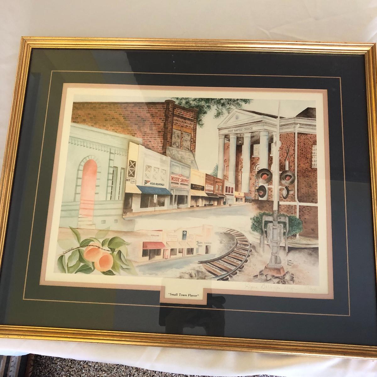 This lot includes two signed prints. Note both pencil signatures. “Small Town Flavor” measures 26.5” x 21.5”. Note the matting on this print. “Main Street Inman 1910” measures 32” x 26”. Both prints are framed in glass. Shipping Available. Please call UPS for a shipping estimate as shipping Art can be costly.