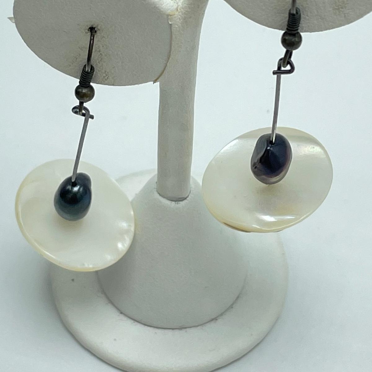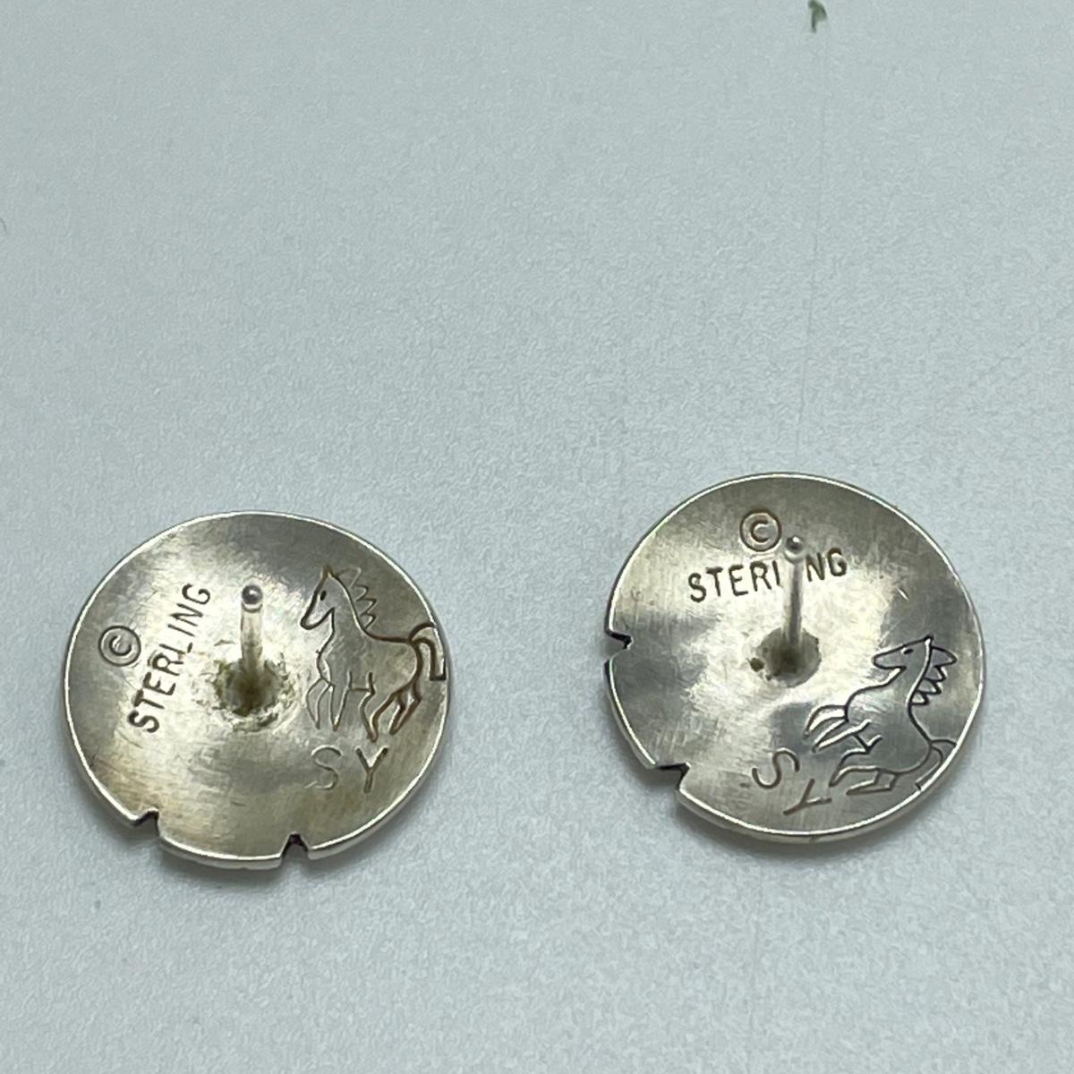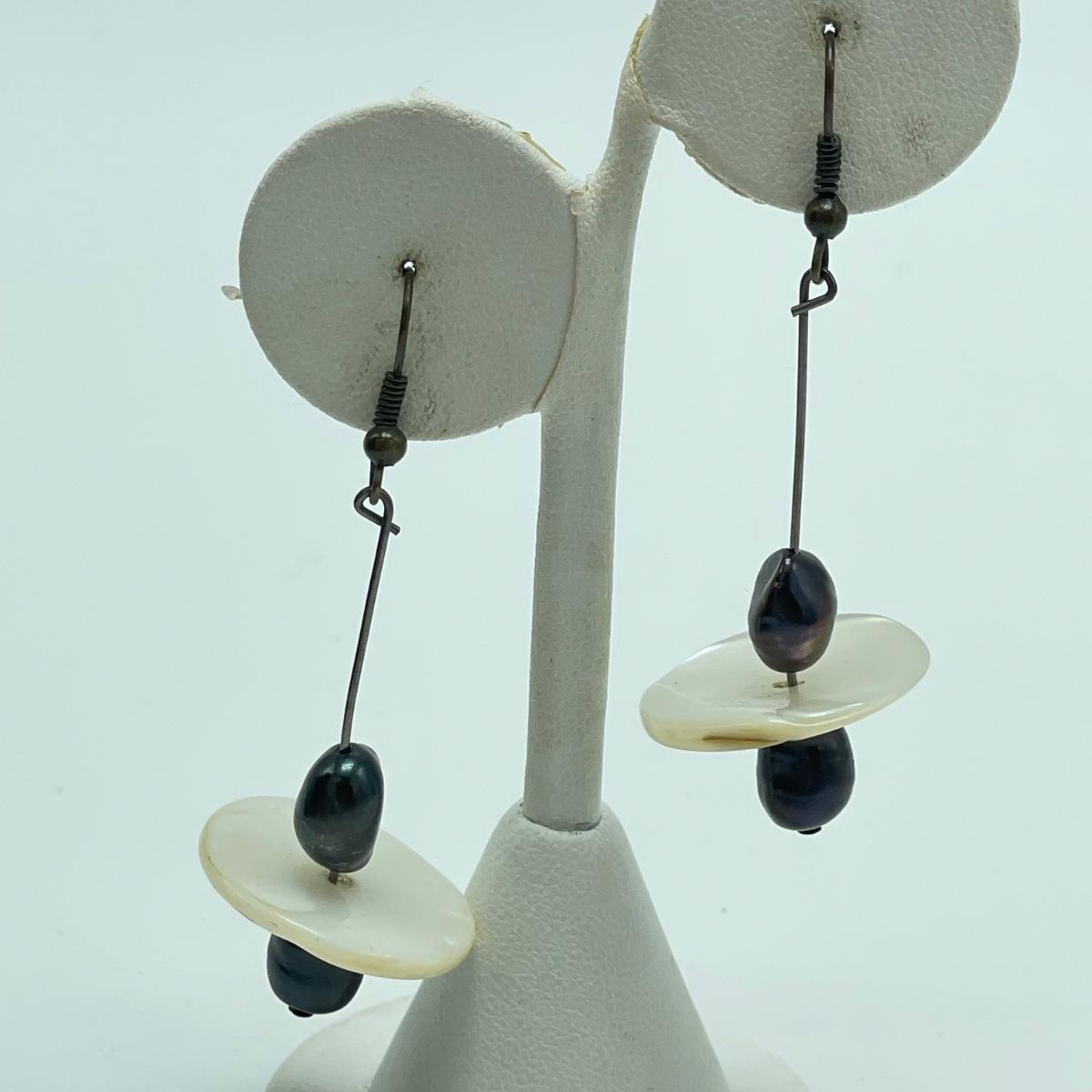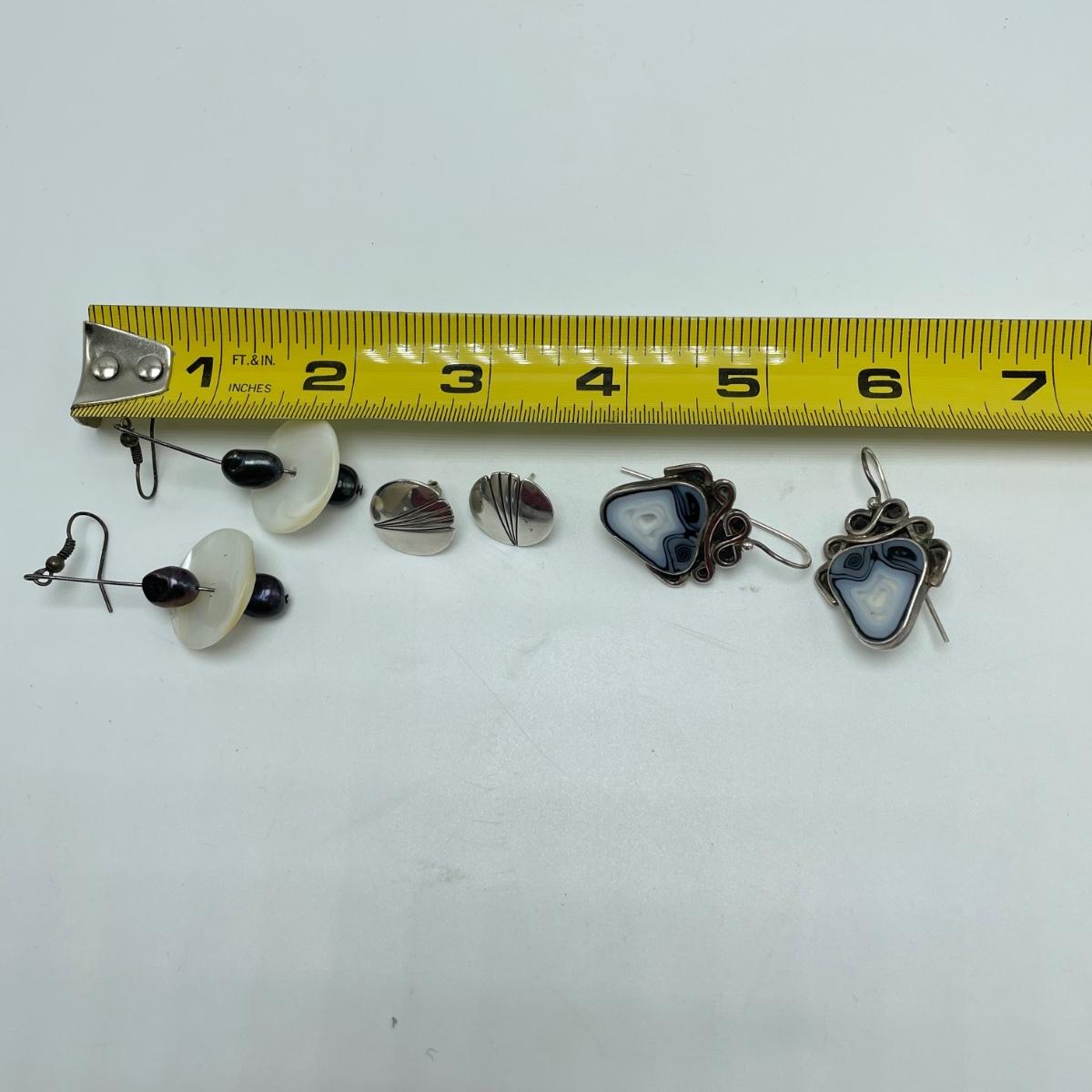 Sterling studs by Navajo Steve Yellowhorse, another pair marked 925 signed, these have a glass like center in their sterling setting. Lastly a dangle pair of French wire earrings with two black freshwater pearls each. See images. Shipping available.