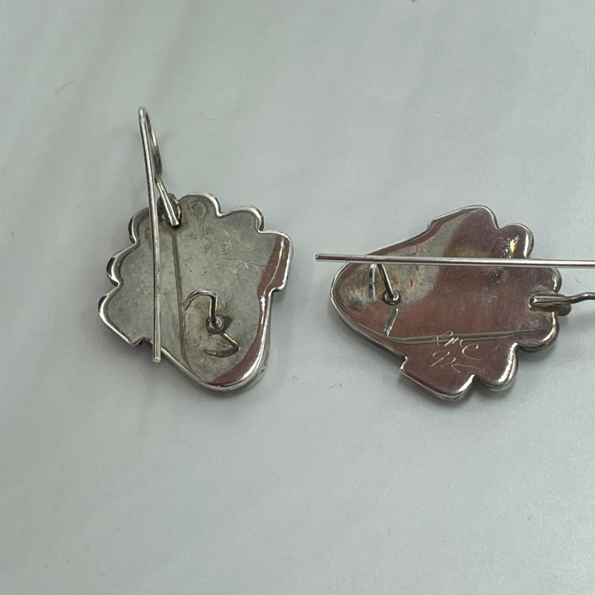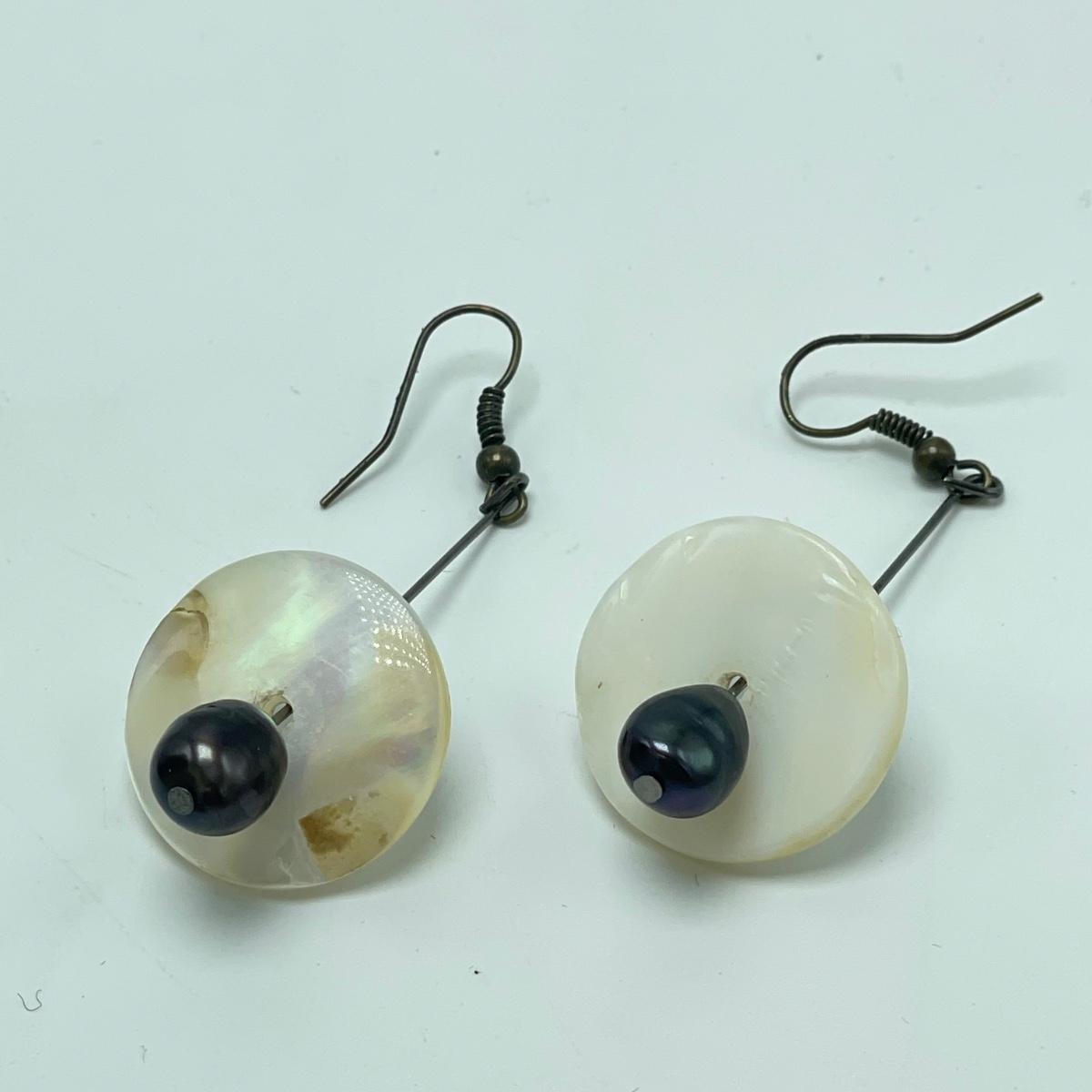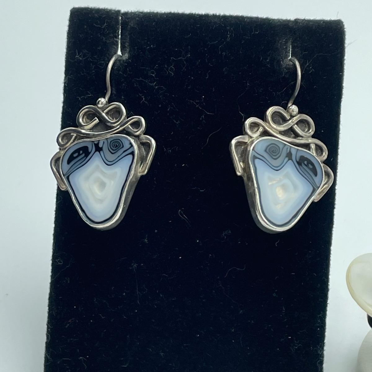 Sterling studs by Navajo Steve Yellowhorse, another pair marked 925 signed, these have a glass like center in their sterling setting. Lastly a dangle pair of French wire earrings with two black freshwater pearls each. See images. Shipping available.