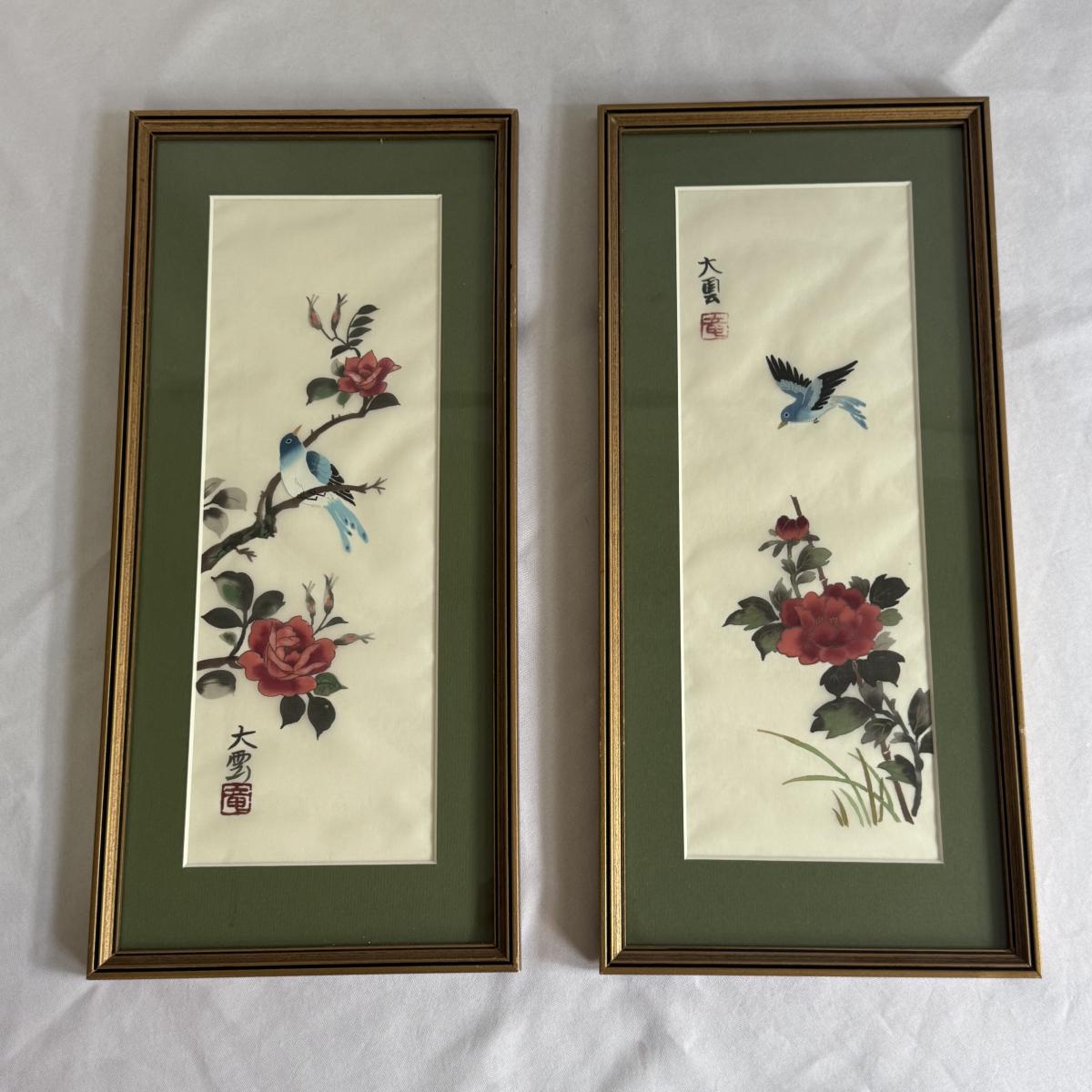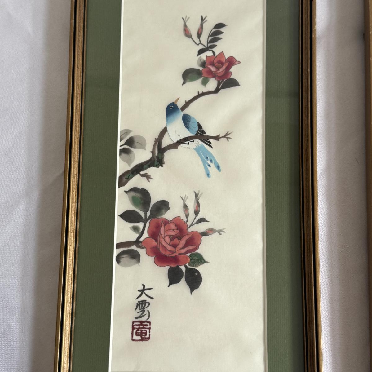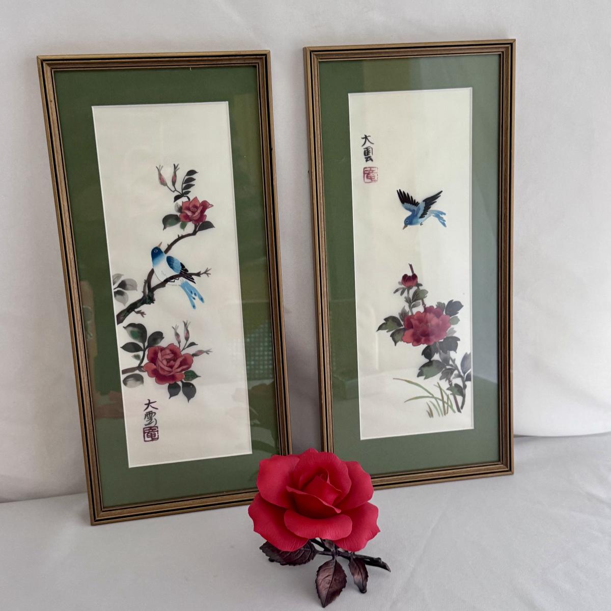 This lot includes two rectangular framed Asian silk paintings of birds, along with one metal Boehm rose titled “Mr.Lincoln.” Both pieces of art are protected with a green matte, along with glass and a wooden frame. The frames individually measure 7.5” x 16.5”H. The metal rose is stamped twice with Boehm. Shipping available.