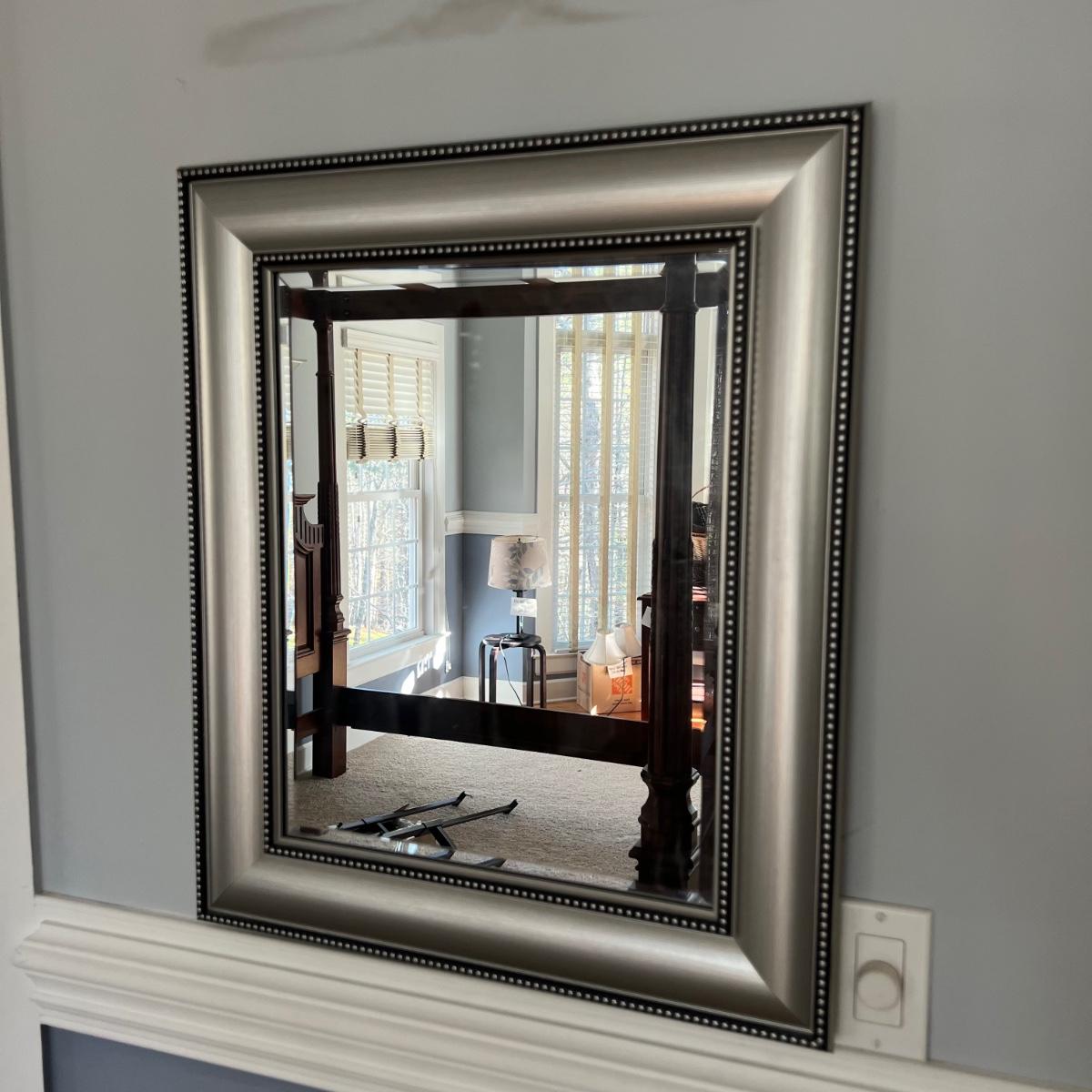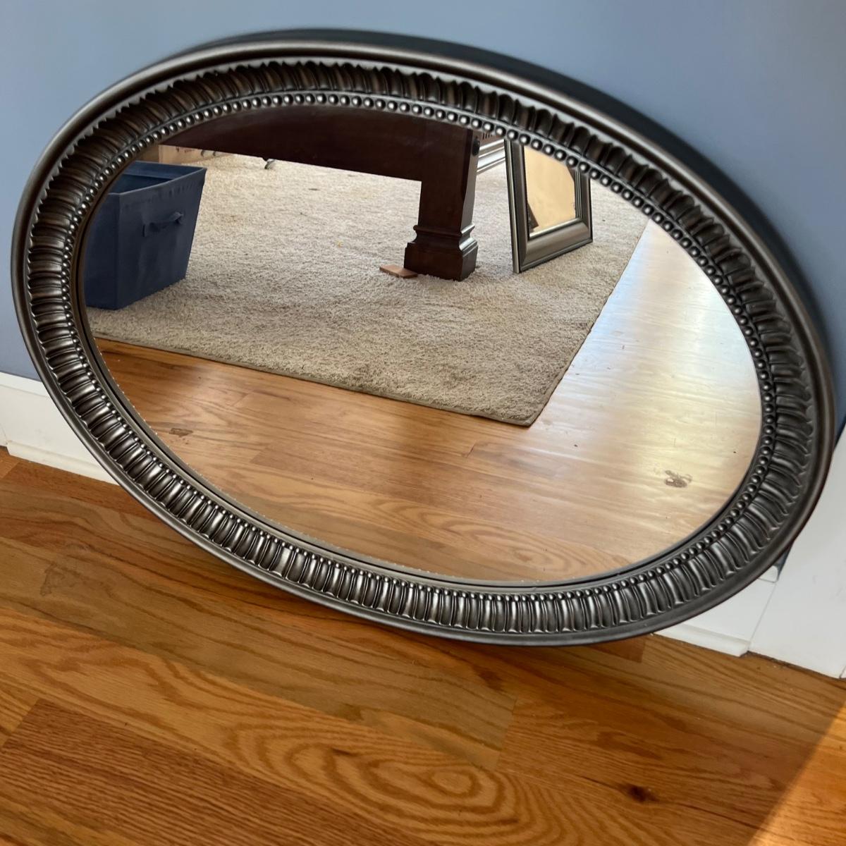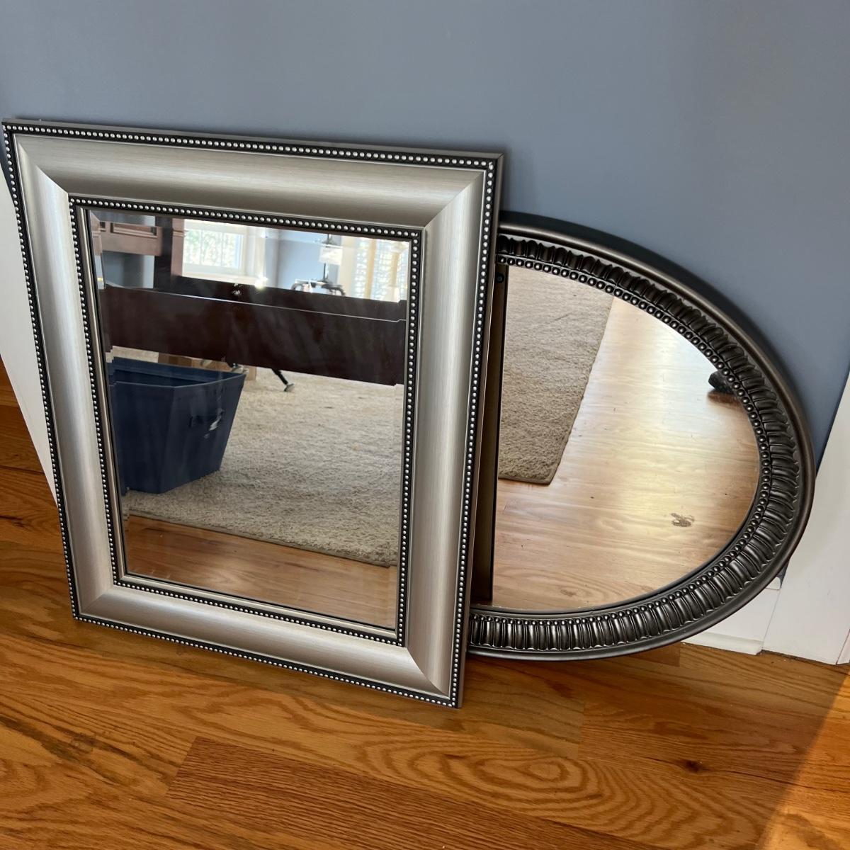 Two silver colored frame mirrors. Large square mirror is 22“ x 28”. The oval mirror is 23” x 24”. Note the small scratch on the square mirror shown in the photographs. Both frames are made of high density styrofoam. Local pickup only..