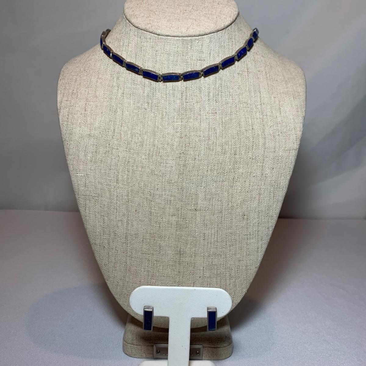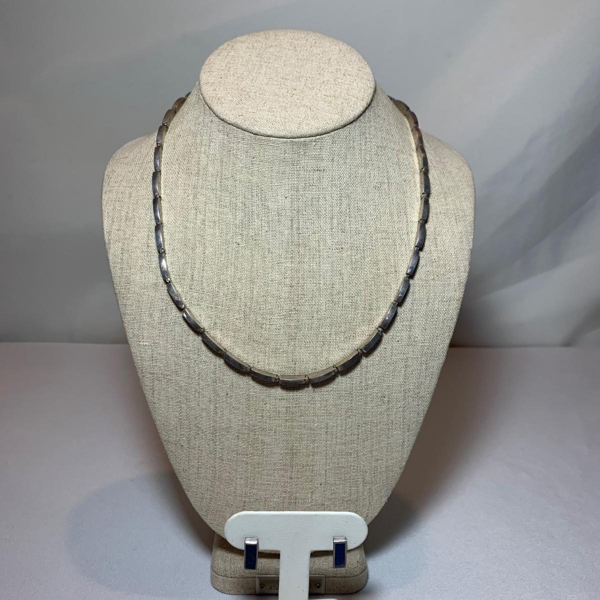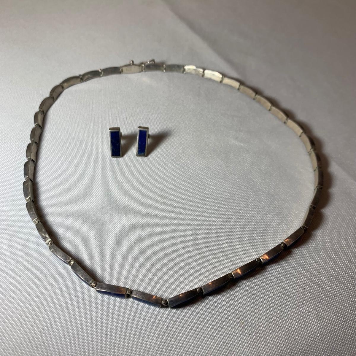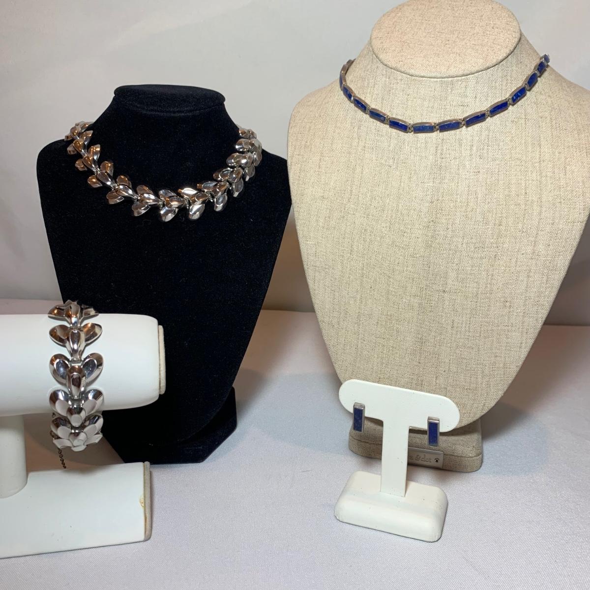 Two sets of silver colored jewelry. One set has a necklace and earrings with gorgeous rectangular blue colored stones. The necklace is 20” long. The necklace metal is marked 980 and the earrings are marked 970. The other set features a matching necklace and bracelet. This set is marked “˜Monet’. This necklace is 14.5”. The bracelet closes but has a secondary clasp that is broken; see photos.