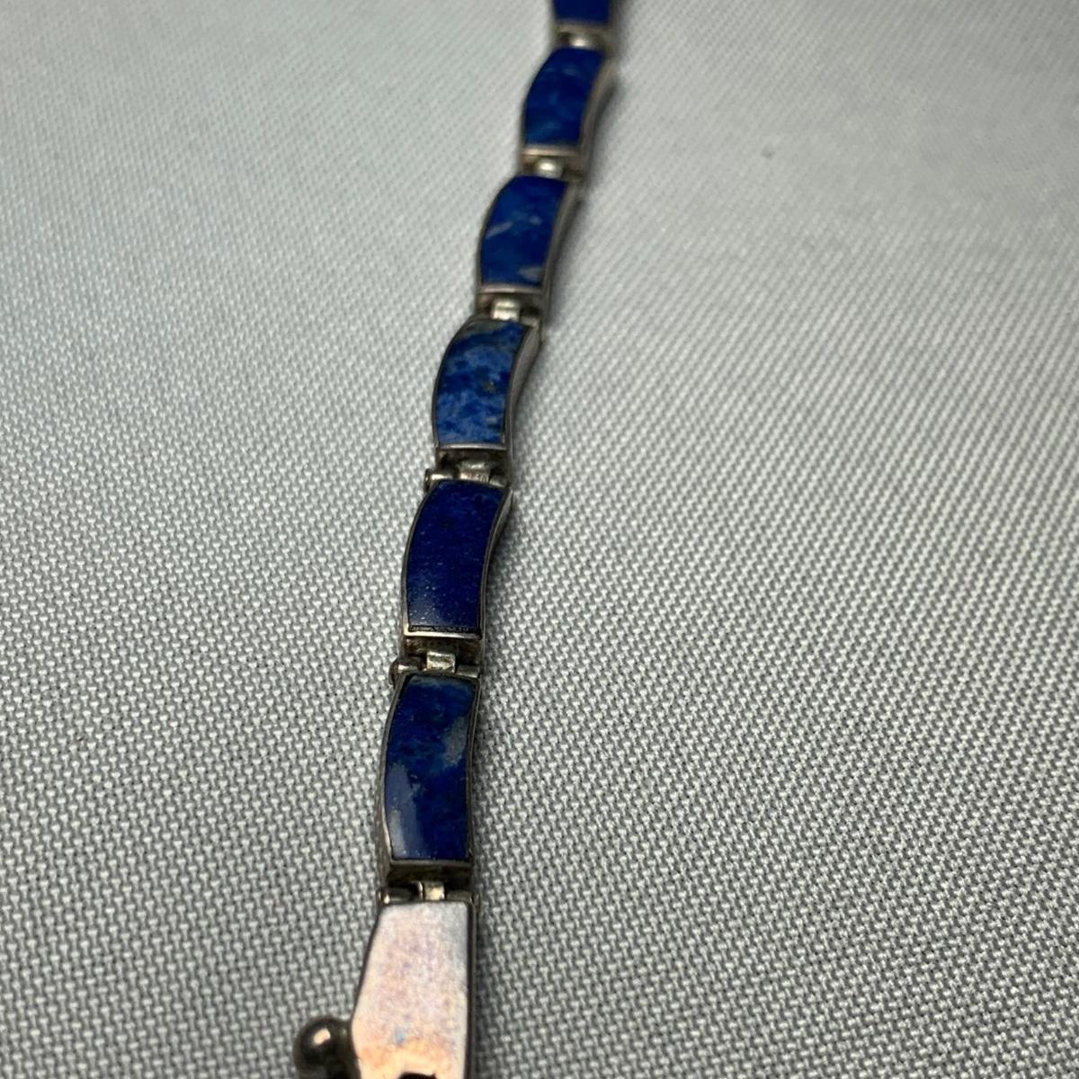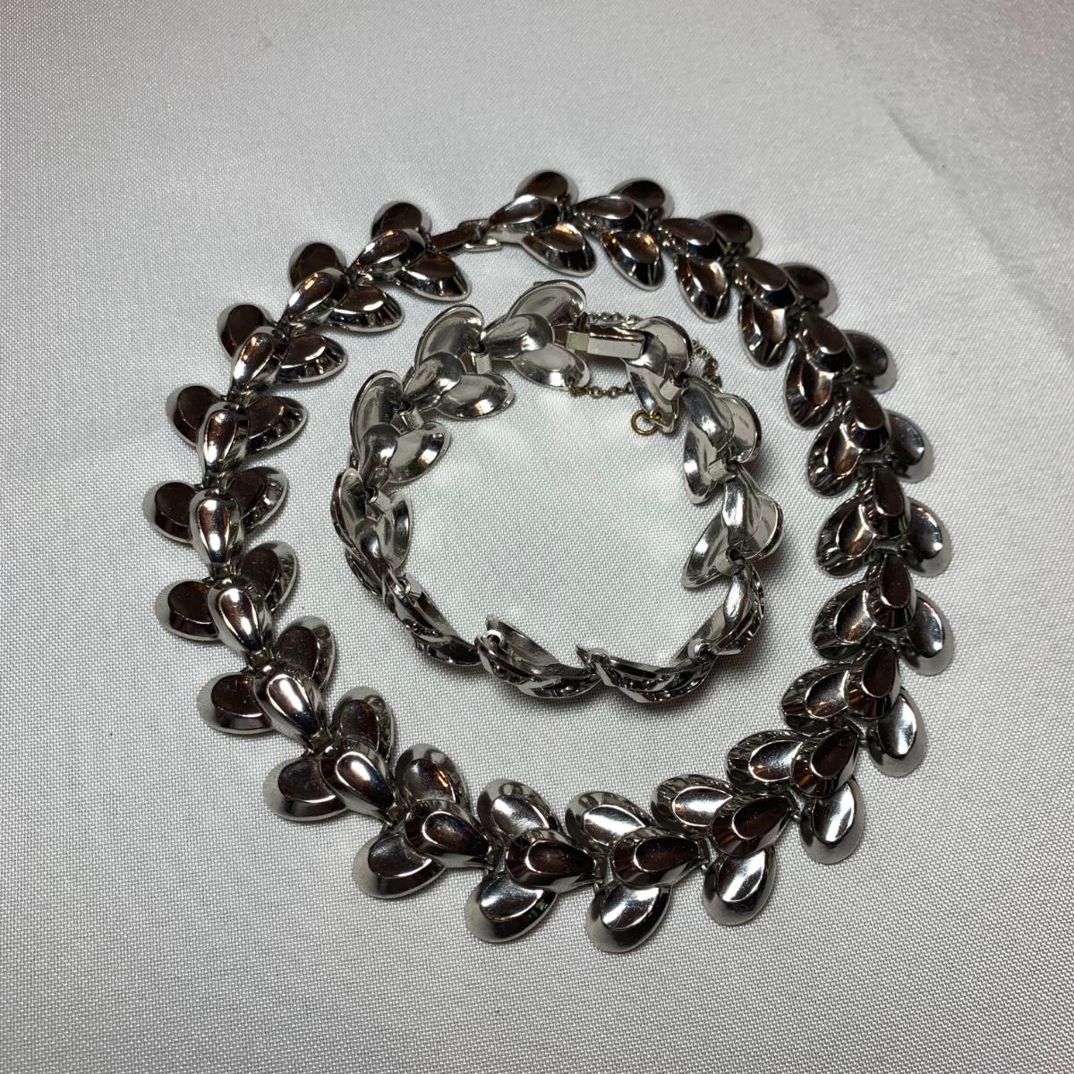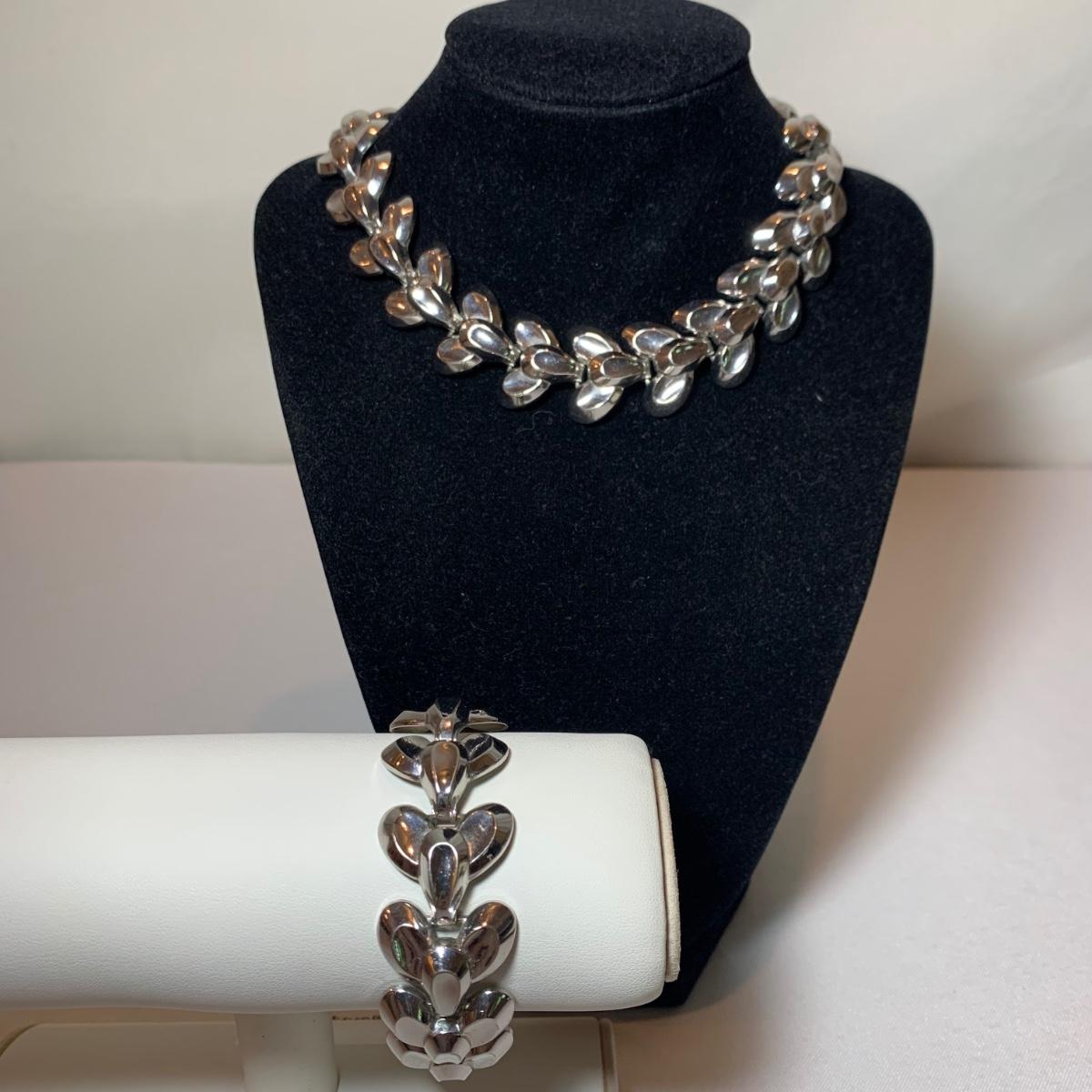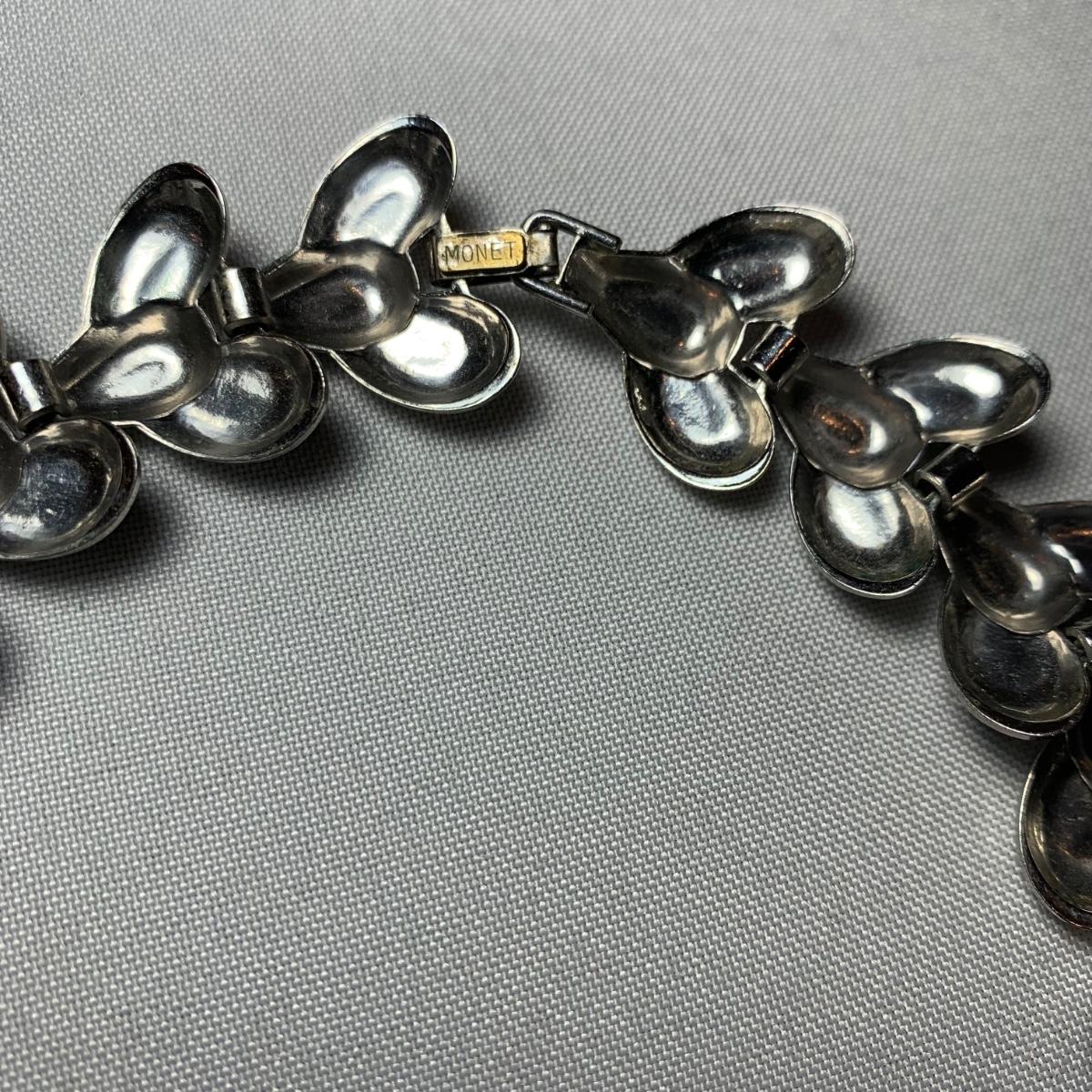 Two sets of silver colored jewelry. One set has a necklace and earrings with gorgeous rectangular blue colored stones. The necklace is 20” long. The necklace metal is marked 980 and the earrings are marked 970. The other set features a matching necklace and bracelet. This set is marked “˜Monet’. This necklace is 14.5”. The bracelet closes but has a secondary clasp that is broken; see photos.