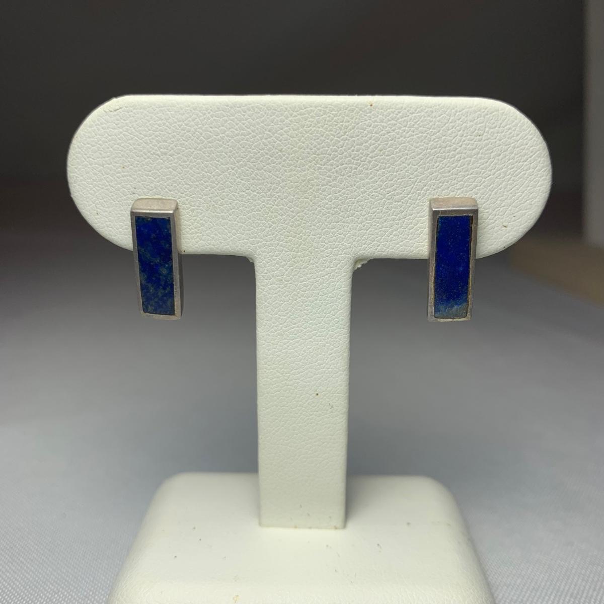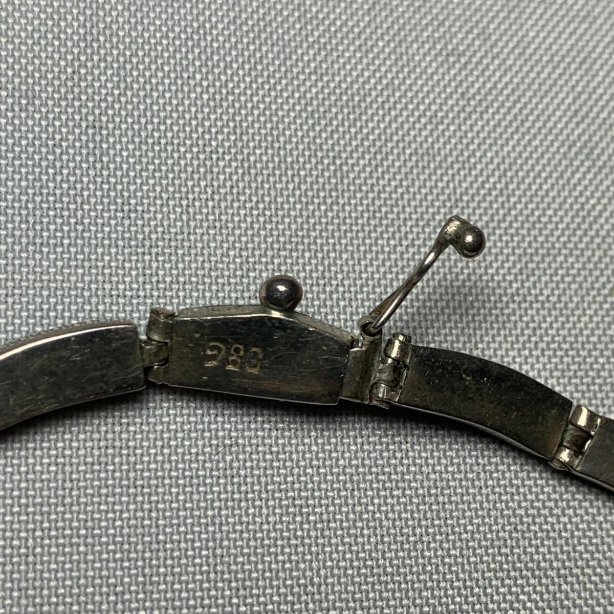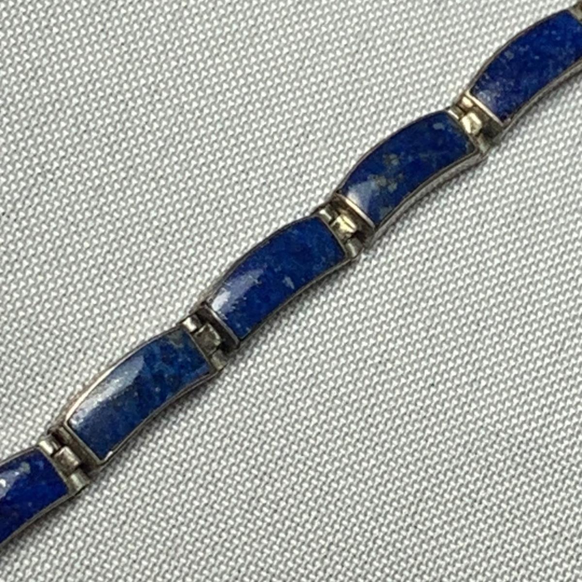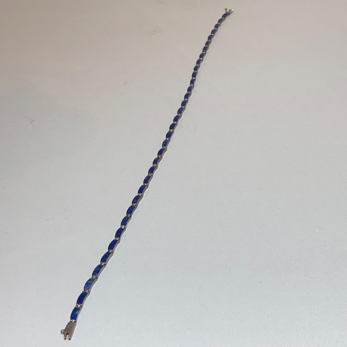 Two sets of silver colored jewelry. One set has a necklace and earrings with gorgeous rectangular blue colored stones. The necklace is 20” long. The necklace metal is marked 980 and the earrings are marked 970. The other set features a matching necklace and bracelet. This set is marked “˜Monet’. This necklace is 14.5”. The bracelet closes but has a secondary clasp that is broken; see photos.