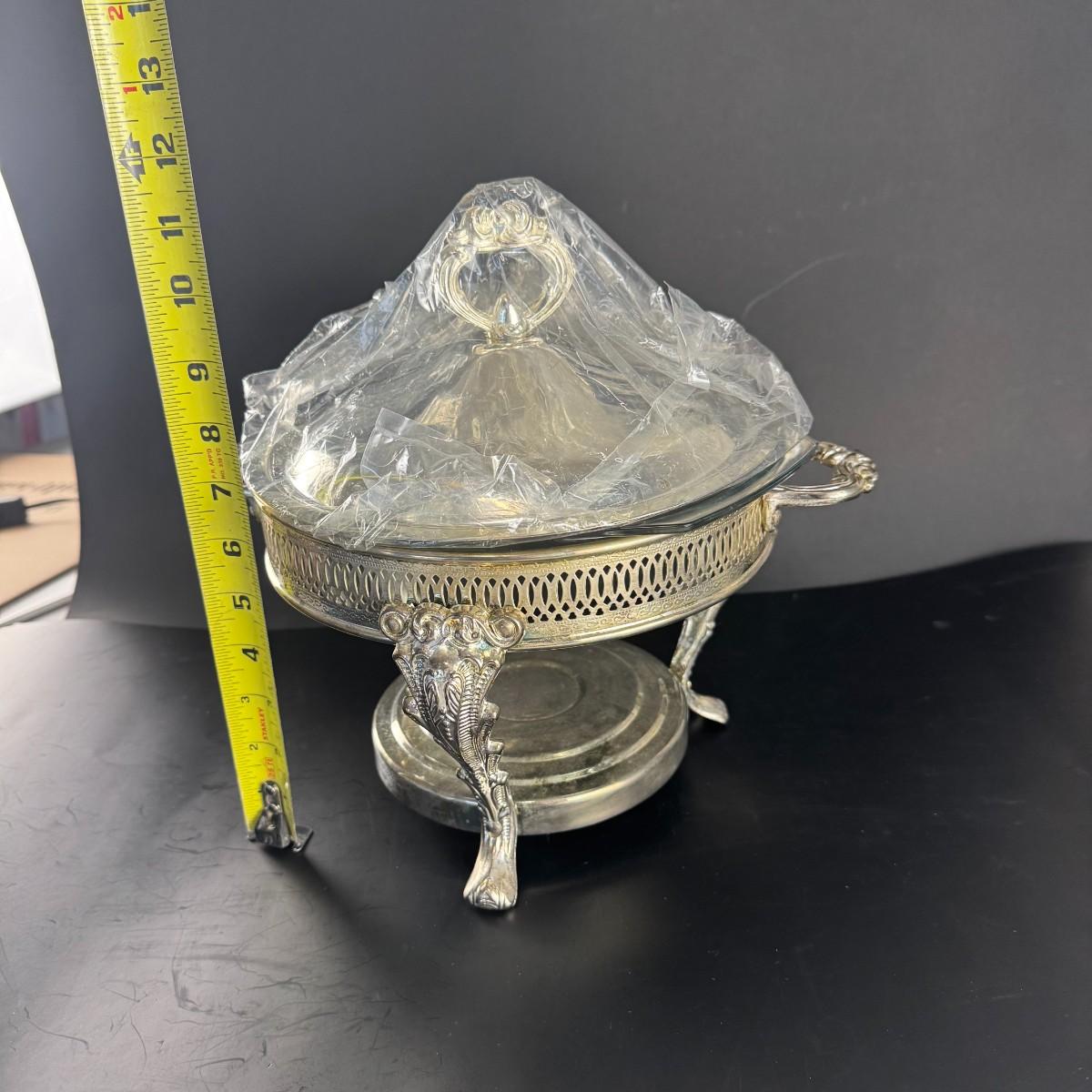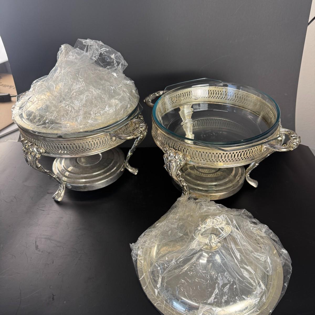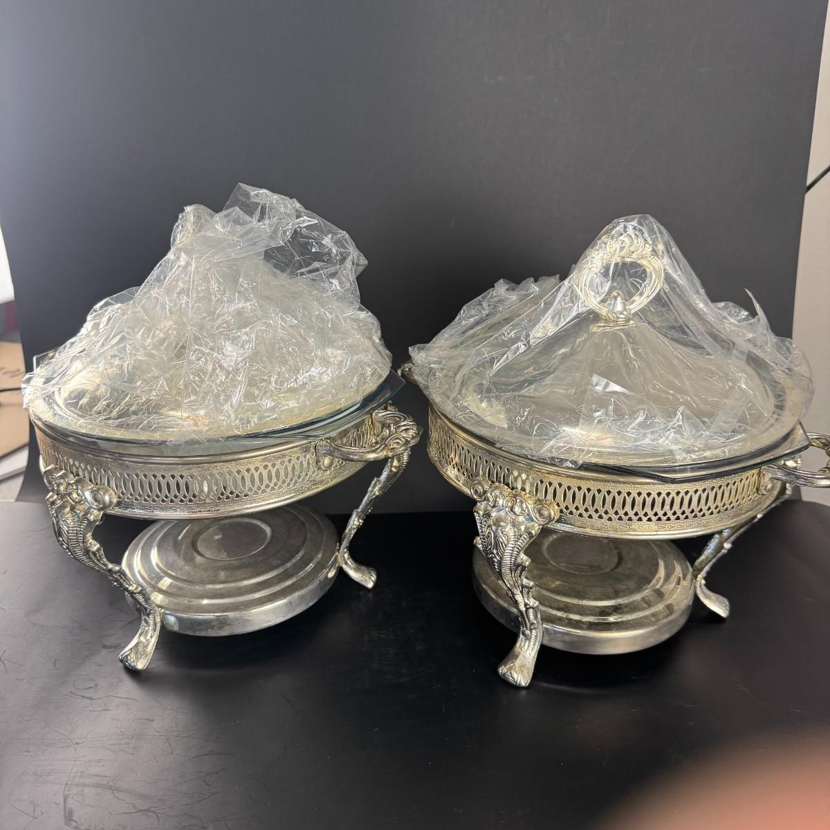 Two Leonard silver-plated three-footed chafing dishes with glass casserole inserts. These are used for serving and keeping food warm.
