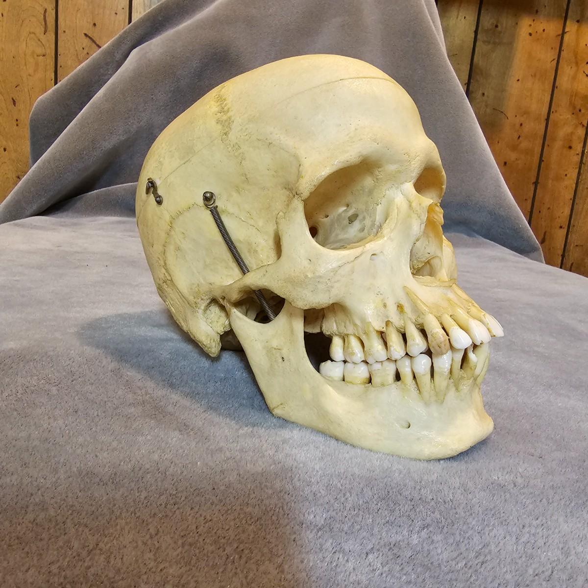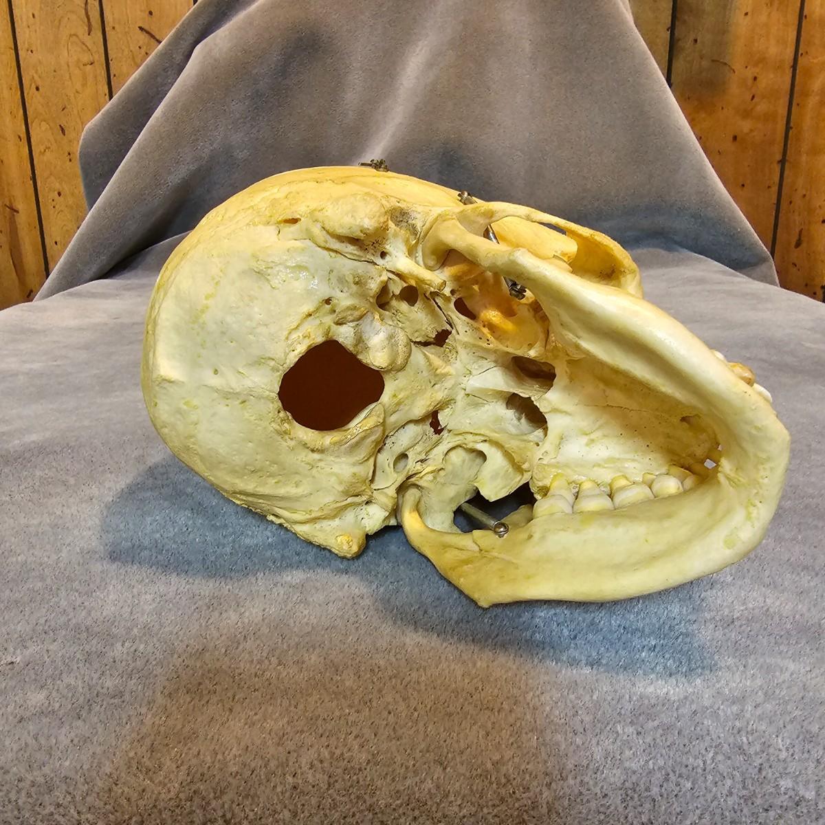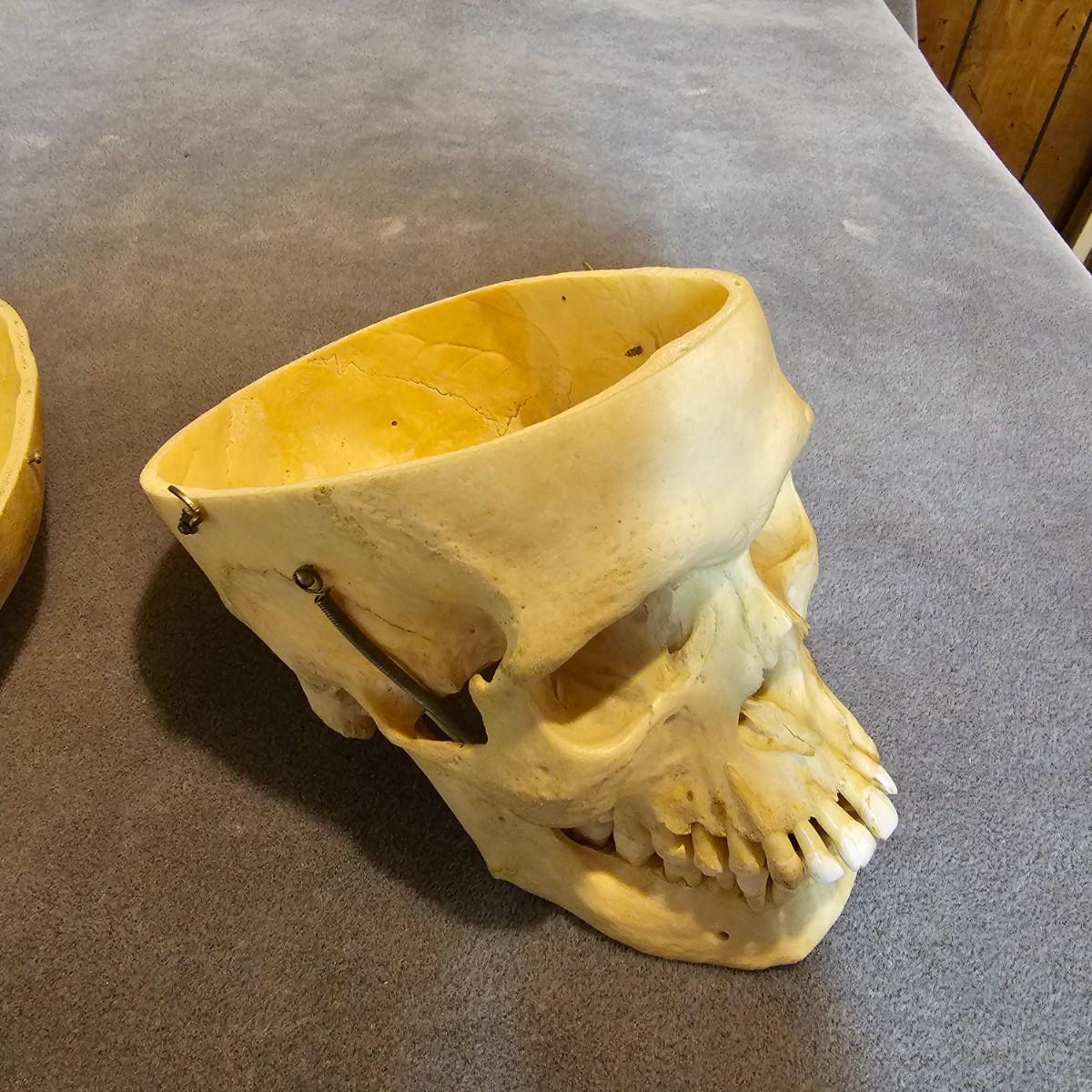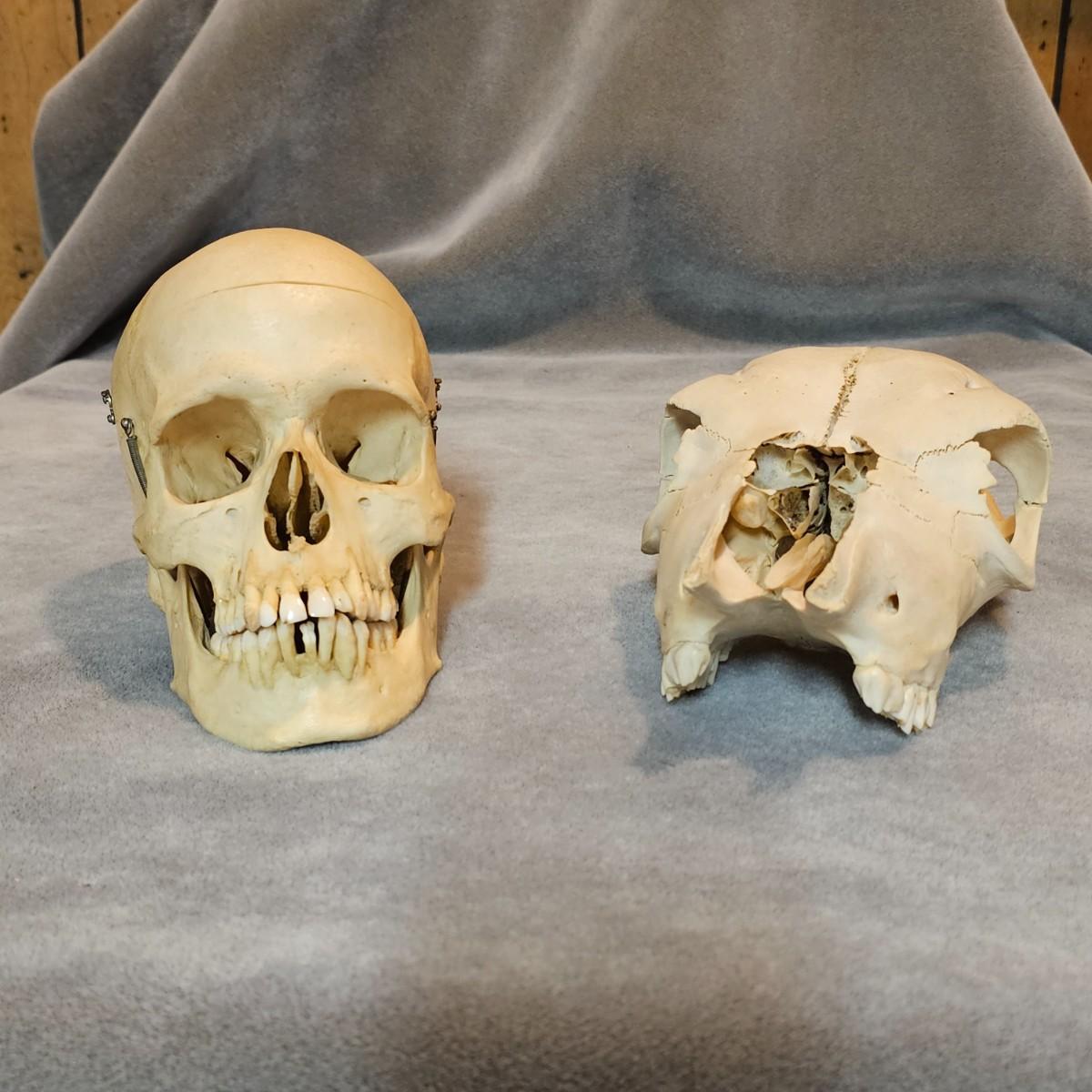 A pair of skulls, one human and one animal. Human skull is 5" x 8" x 6"H, has hinged movable jaw and is real. Top of skull is removable. Animal skull is some type of herbivore, measures 6" x 10" x 5"H. Sutures and teeth visible in both, see photos for details. Shipping available.