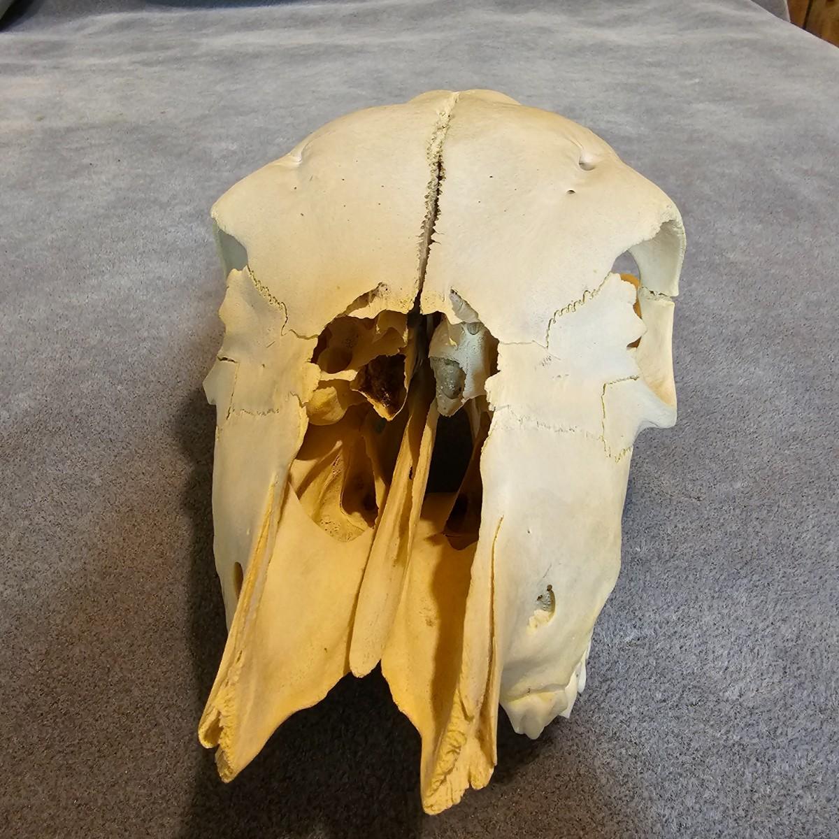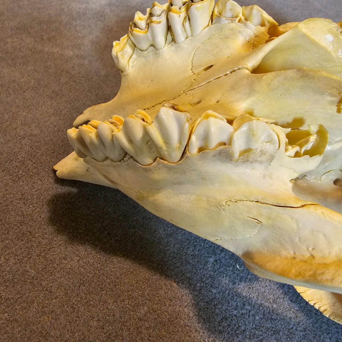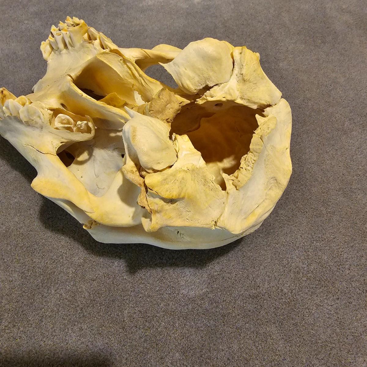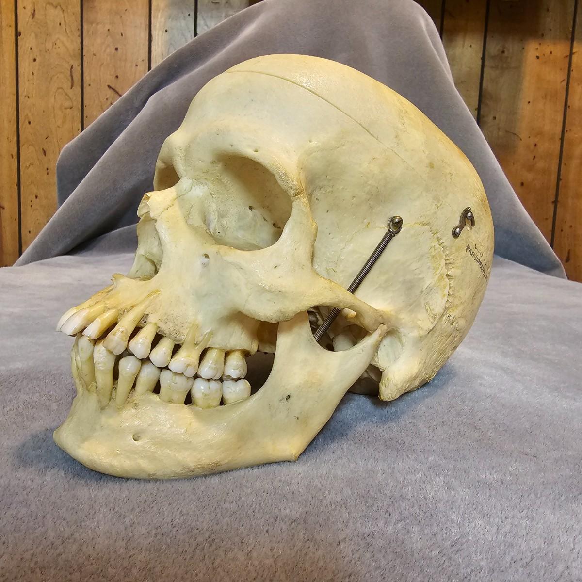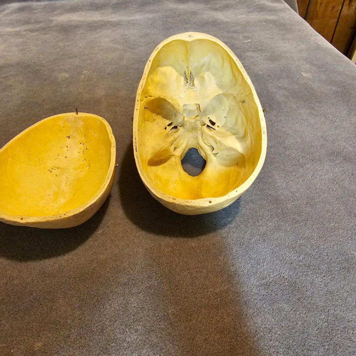 A pair of skulls, one human and one animal. Human skull is 5" x 8" x 6"H, has hinged movable jaw and is real. Top of skull is removable. Animal skull is some type of herbivore, measures 6" x 10" x 5"H. Sutures and teeth visible in both, see photos for details. Shipping available.