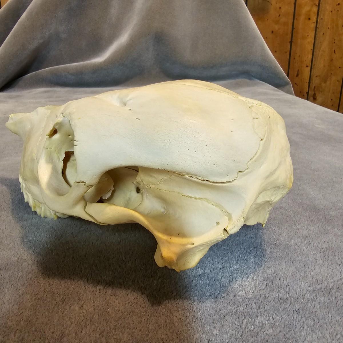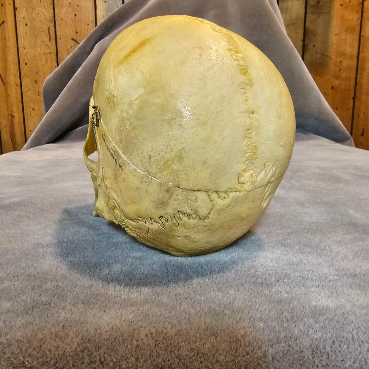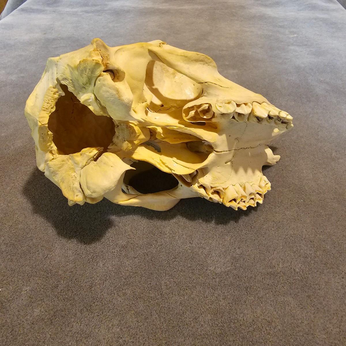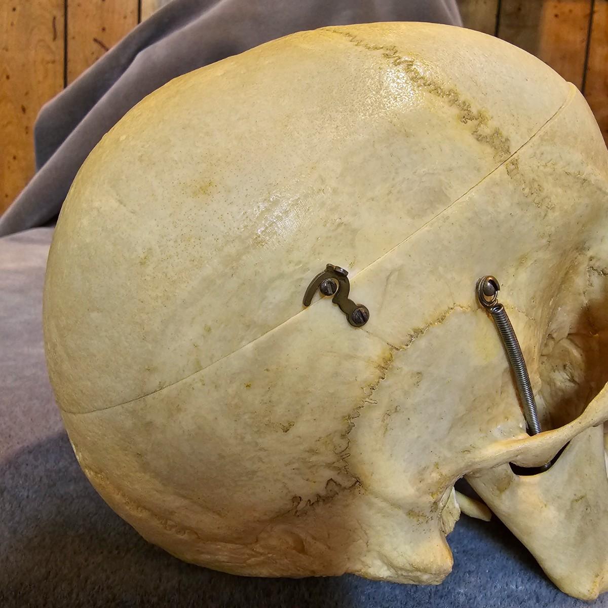 A pair of skulls, one human and one animal. Human skull is 5" x 8" x 6"H, has hinged movable jaw and is real. Top of skull is removable. Animal skull is some type of herbivore, measures 6" x 10" x 5"H. Sutures and teeth visible in both, see photos for details. Shipping available.