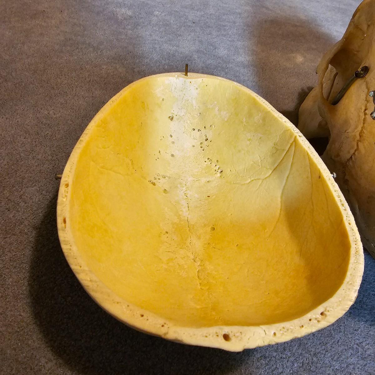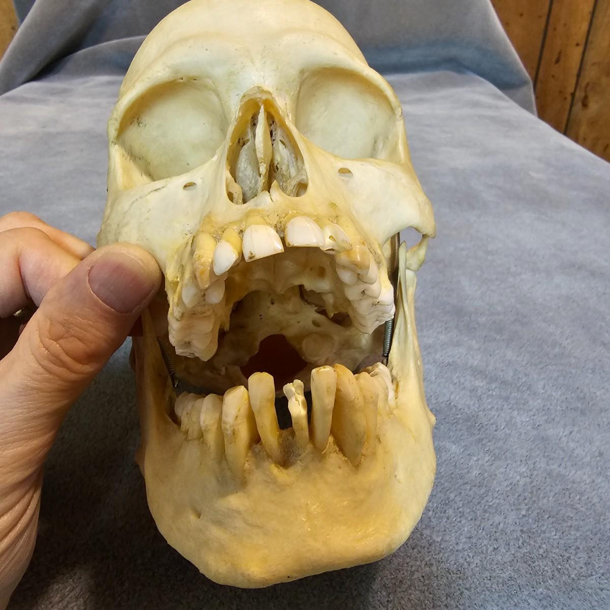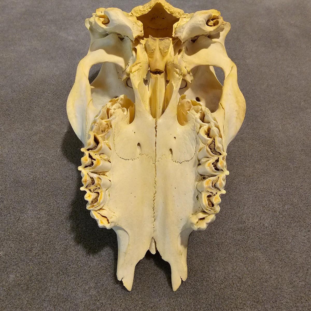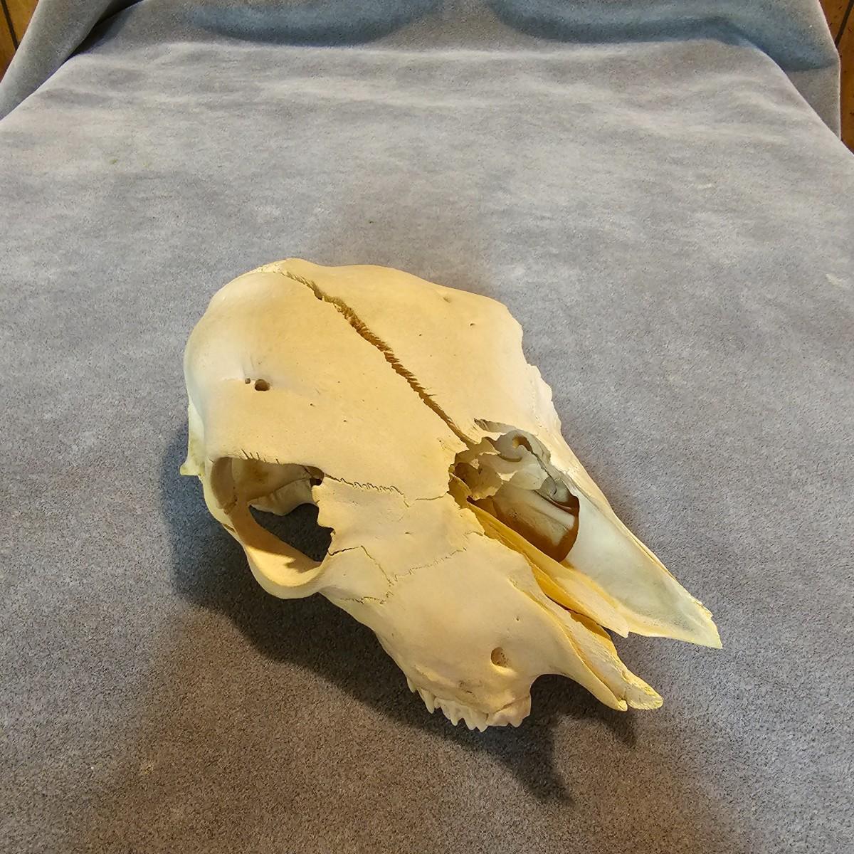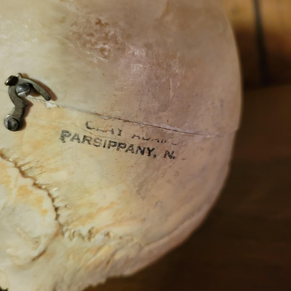 A pair of skulls, one human and one animal. Human skull is 5" x 8" x 6"H, has hinged movable jaw and is real. Top of skull is removable. Animal skull is some type of herbivore, measures 6" x 10" x 5"H. Sutures and teeth visible in both, see photos for details. Shipping available.