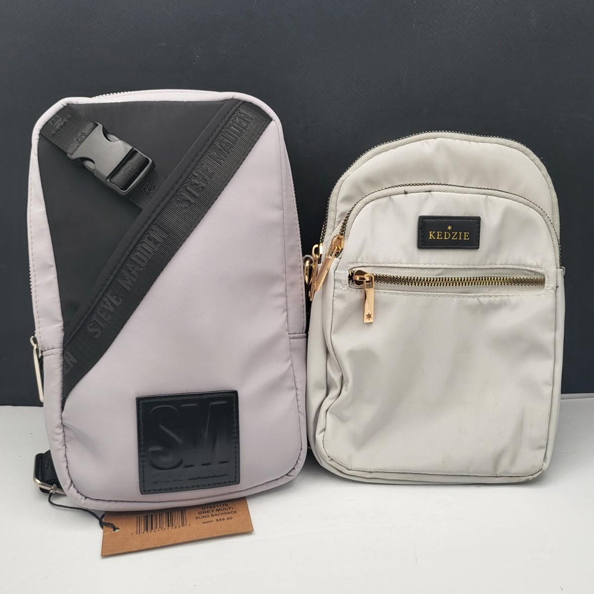 Two small zipper sling backpacks. NEW Steve Madden, retails for $88. Measures 12" tall x 8" wide x 1.5" deep.