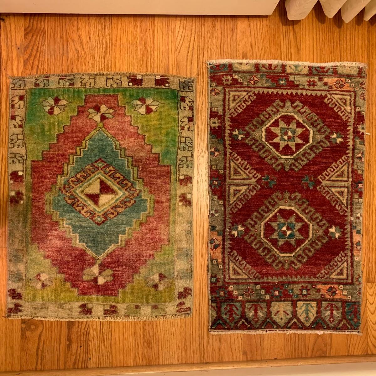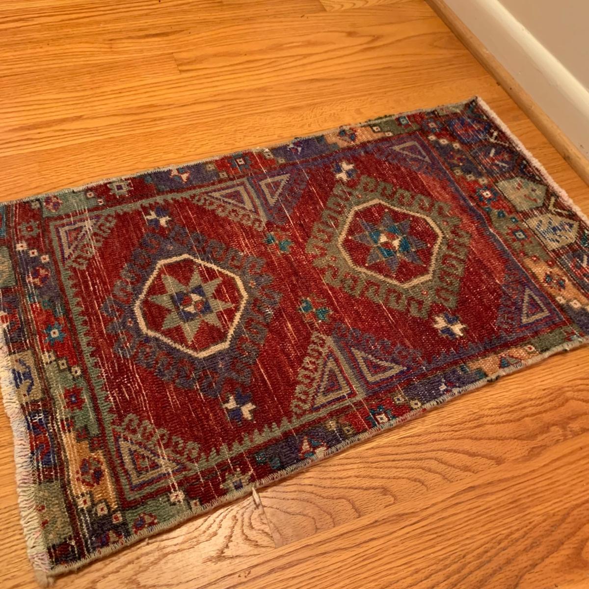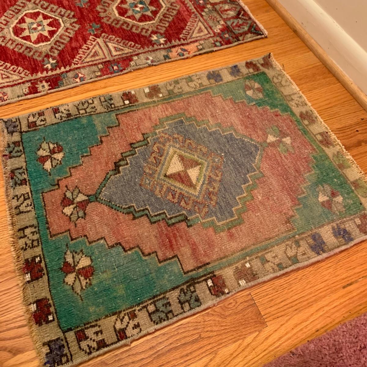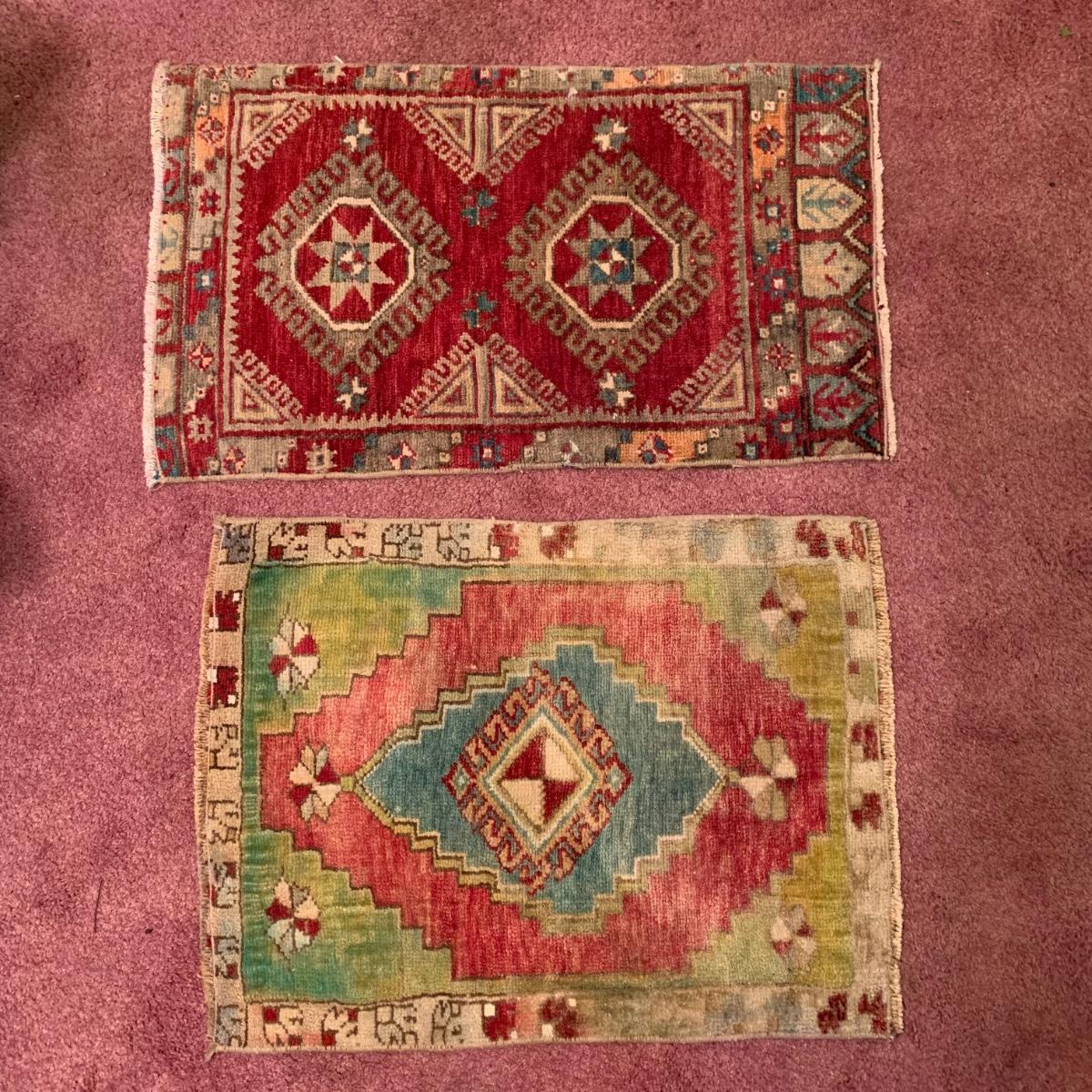 Two small Aztec themed kitchen floor mat rugs. The lighter colored one with the light green background measures 25” x 19”. The red rug is 29” x 16.5”. The green is in fair condition with some faded spots. Both could use a good cleaning. Shipping available.