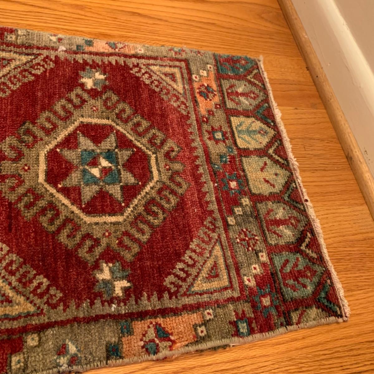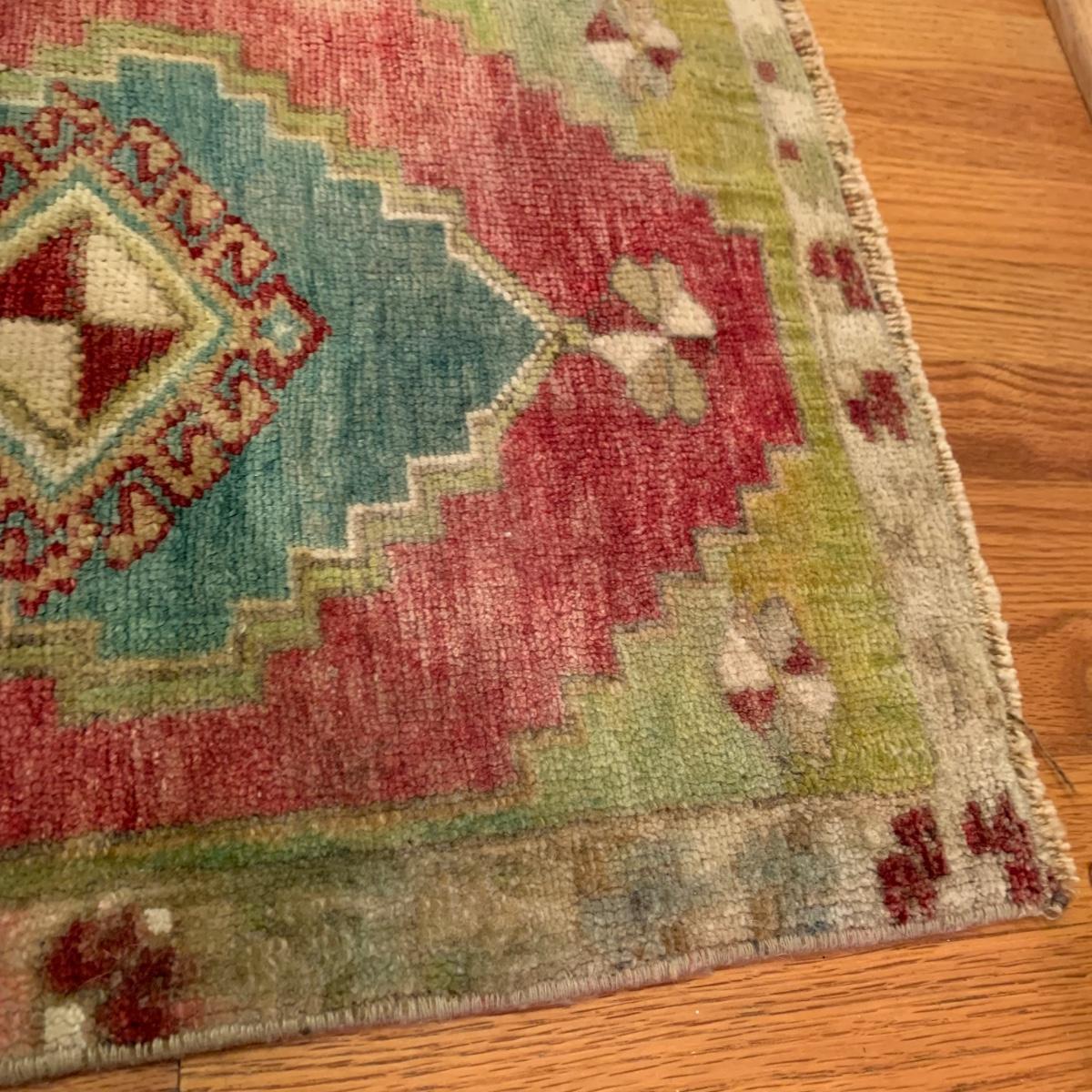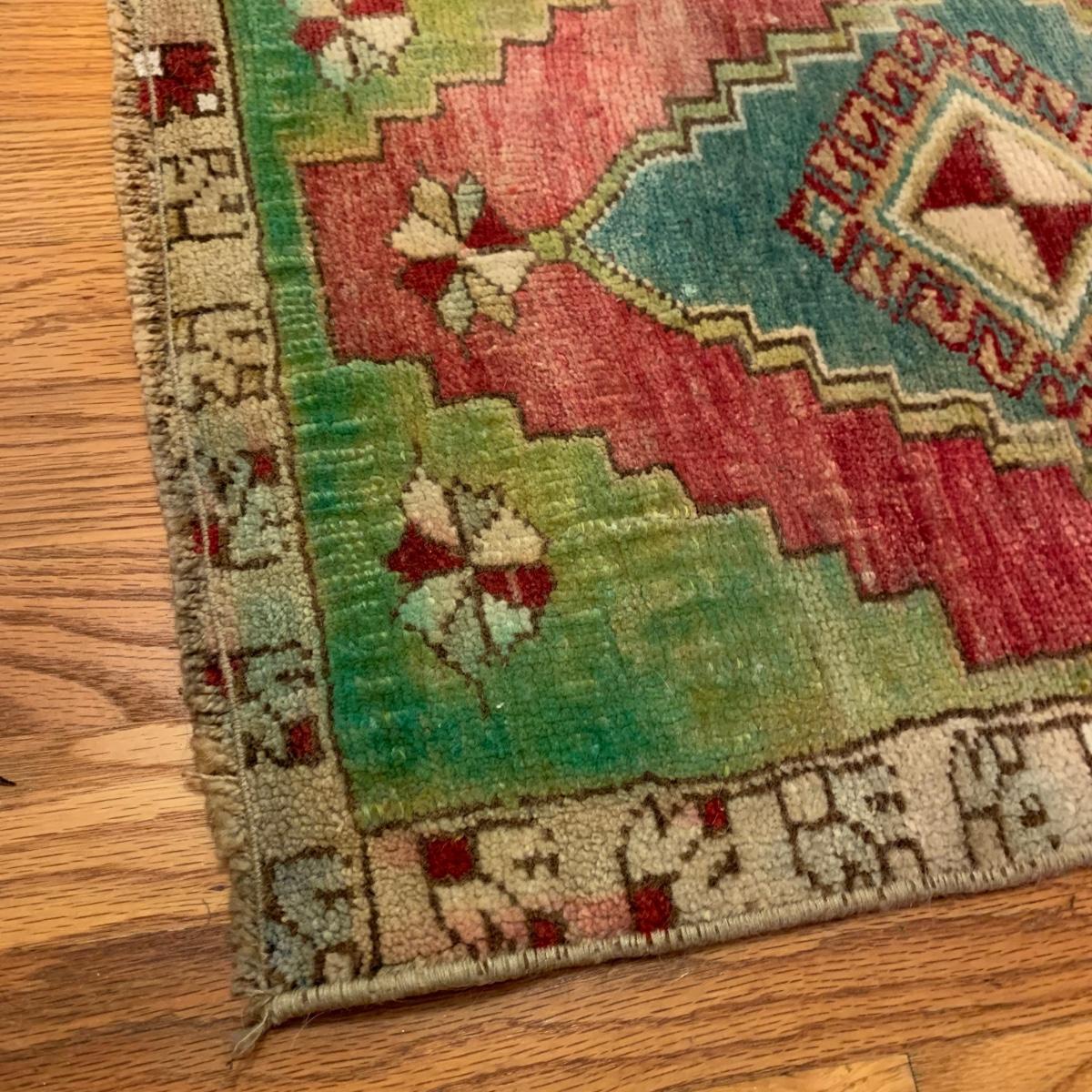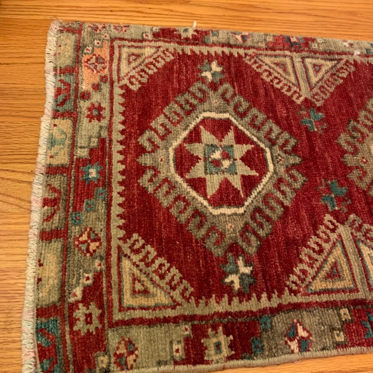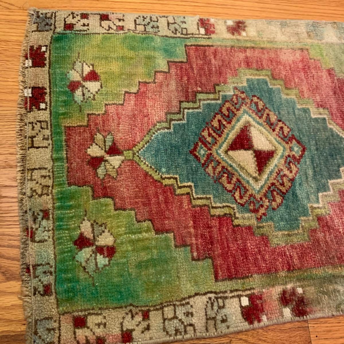 Two small Aztec themed kitchen floor mat rugs. The lighter colored one with the light green background measures 25” x 19”. The red rug is 29” x 16.5”. The green is in fair condition with some faded spots. Both could use a good cleaning. Shipping available.