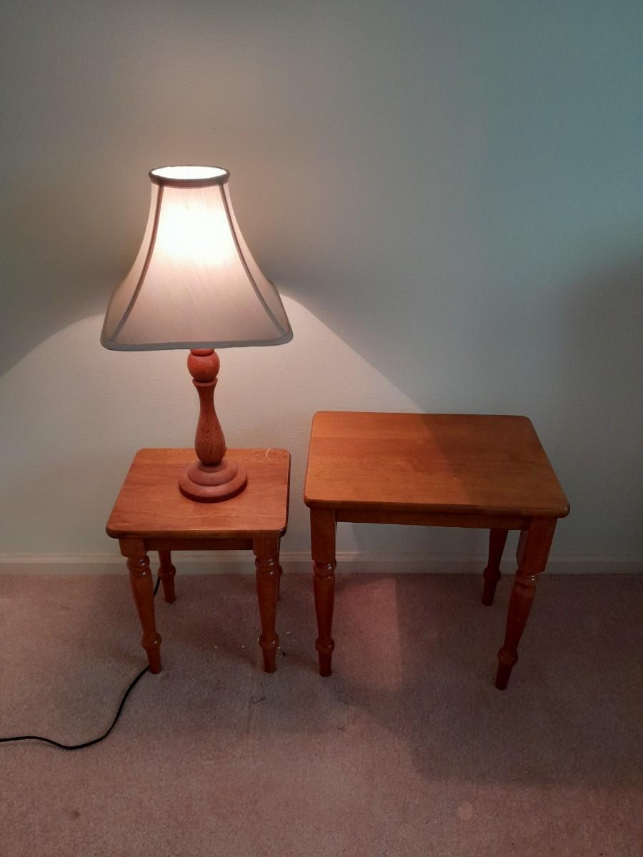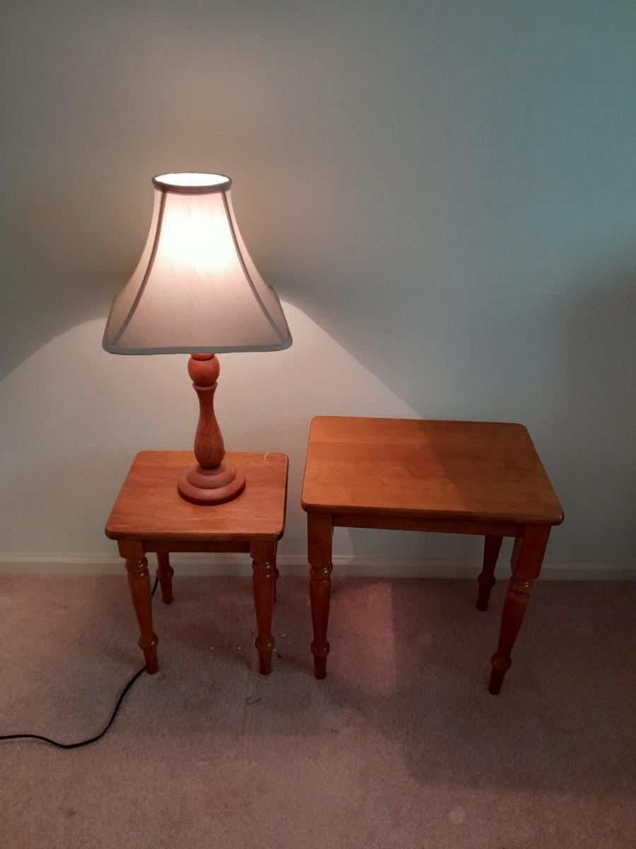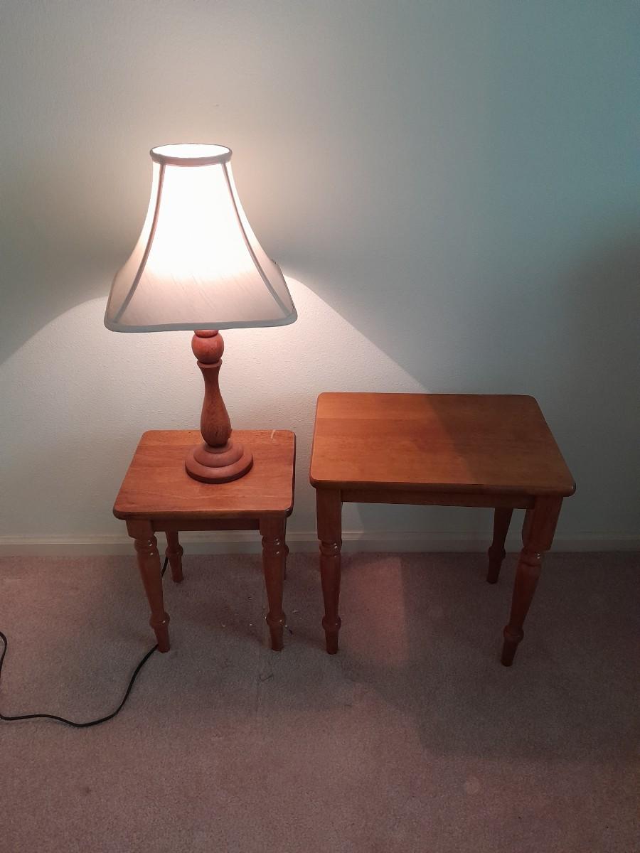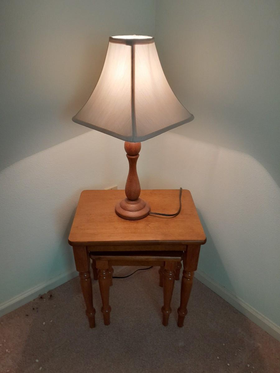 TWO SMALL NESTING TABLES AND A WOODEN LAMP WITH SHADE