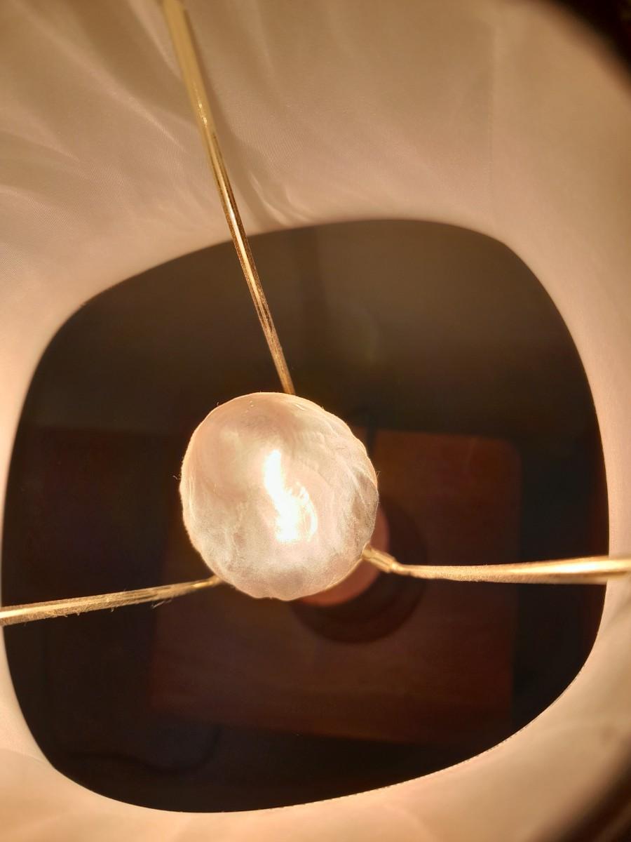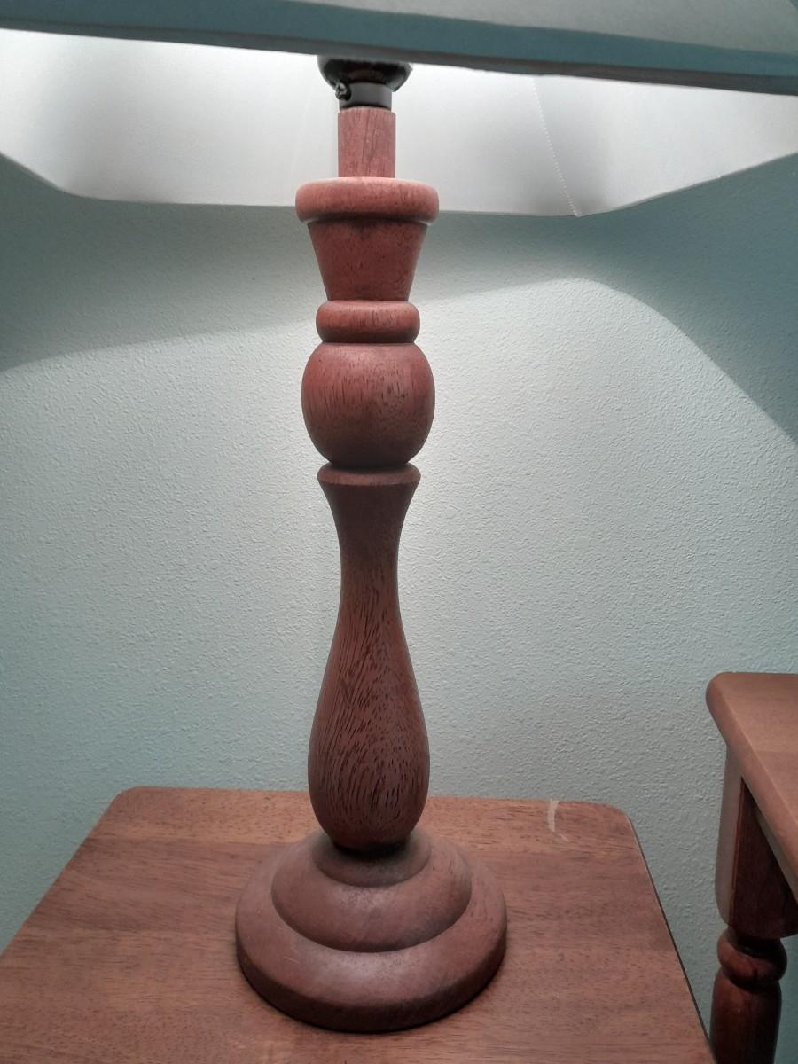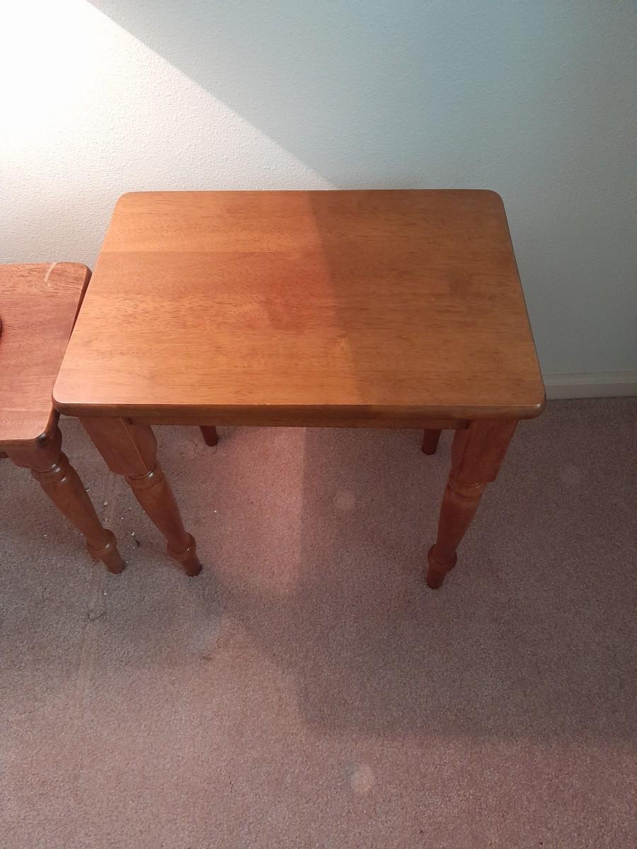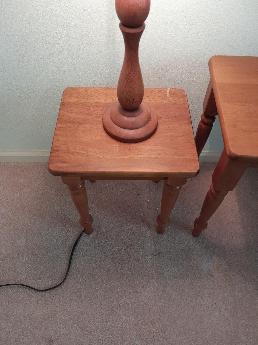 TWO SMALL NESTING TABLES AND A WOODEN LAMP WITH SHADE