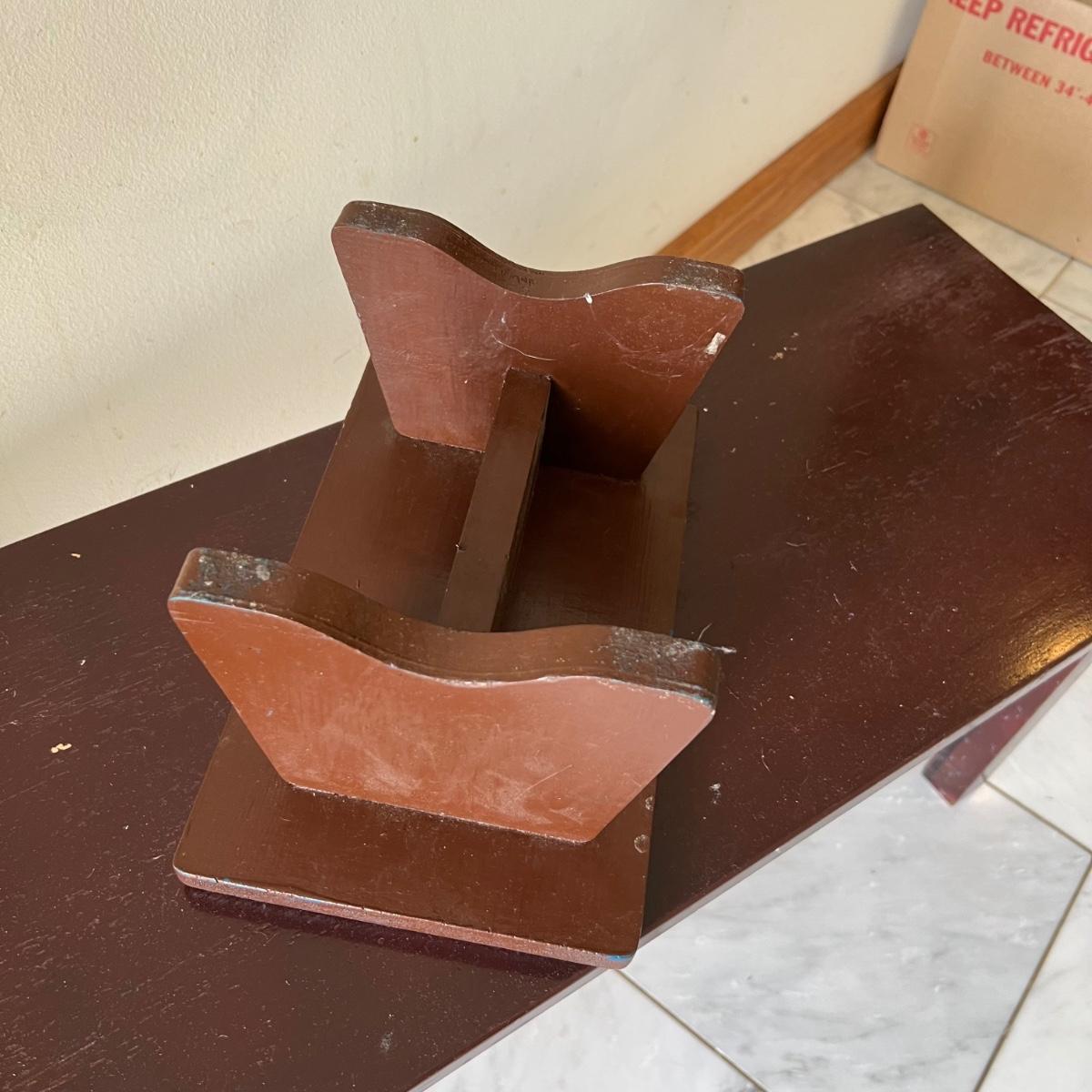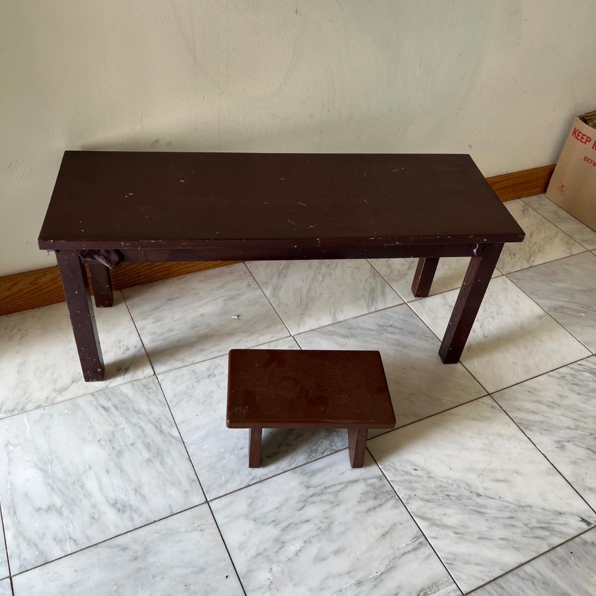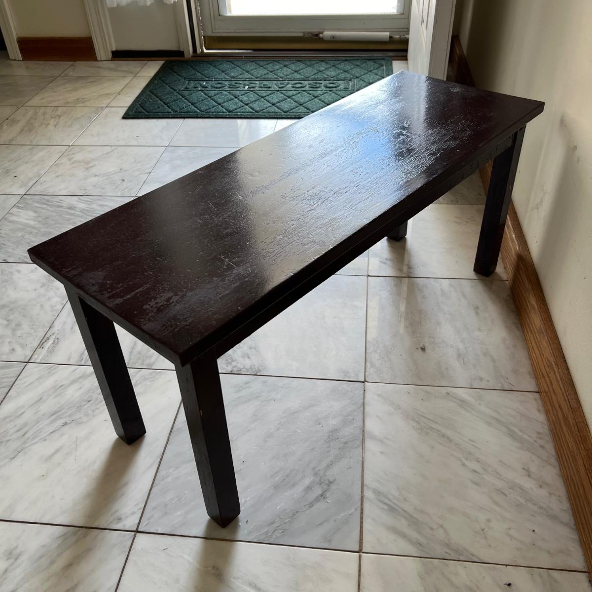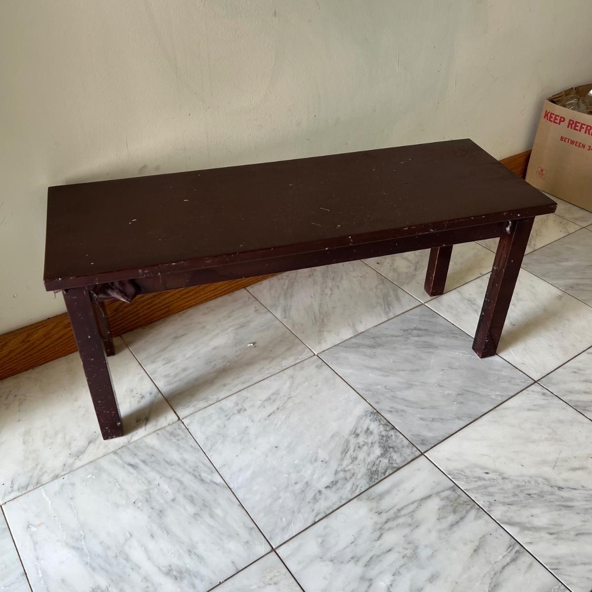 A small and a medium bench. Both are painted brown. The larger bench measures 11.5 x 32” x 14”H. It has some small chips in the paint and a piece of fabric is attached on one corner, see image; this should be easy to remove.