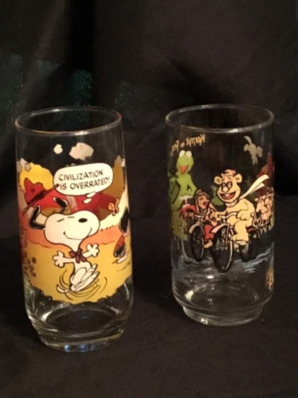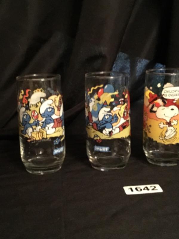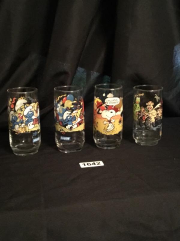 Two Smurf glasses, one snoopy glass, one Muppets glass Lot 1642